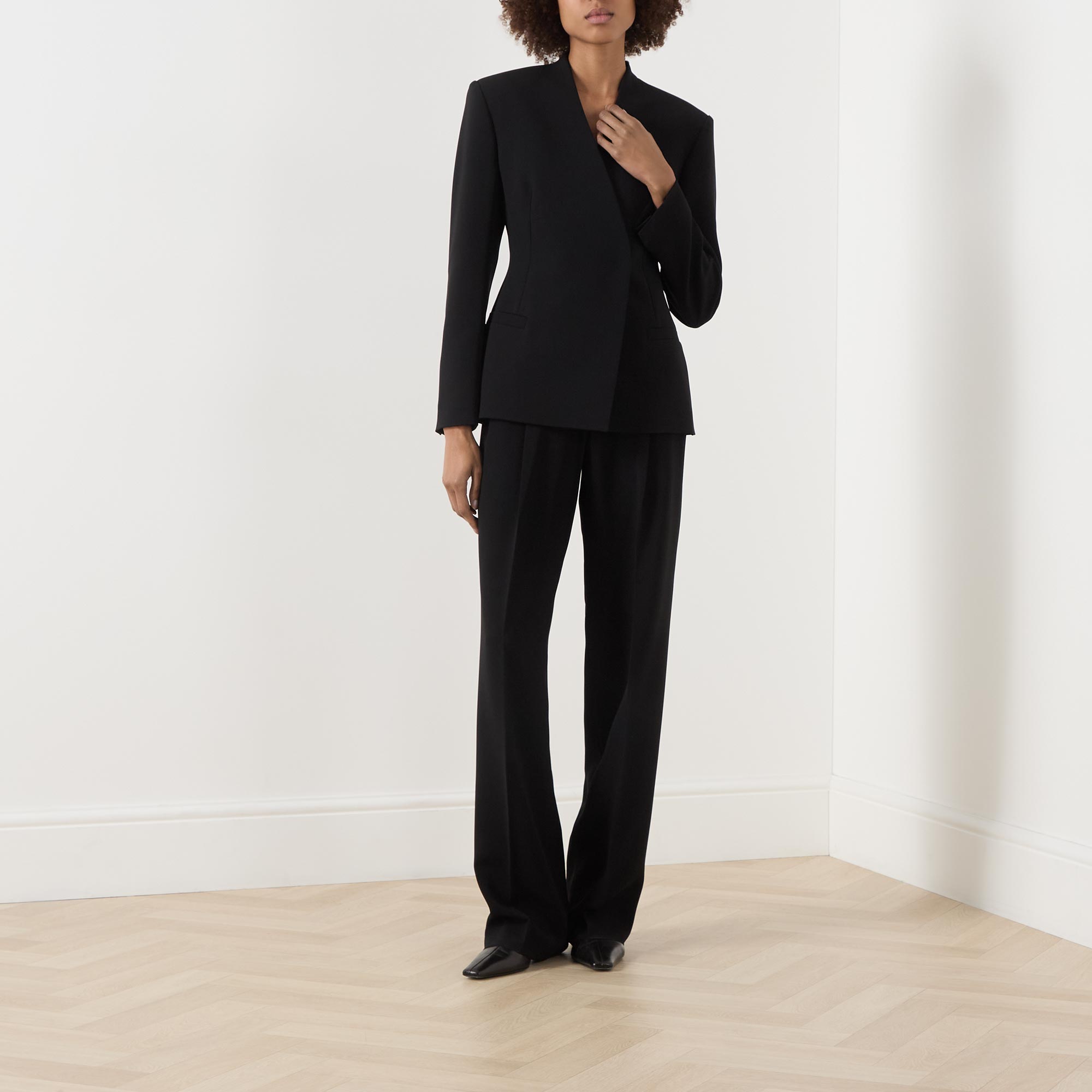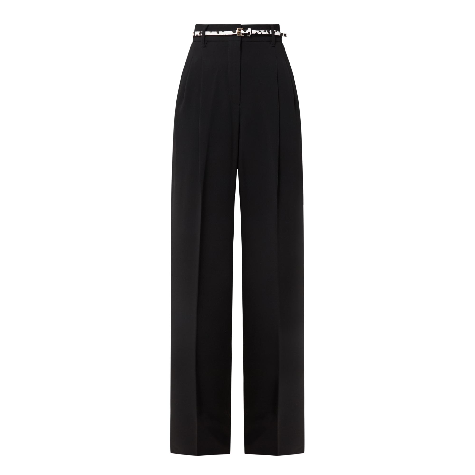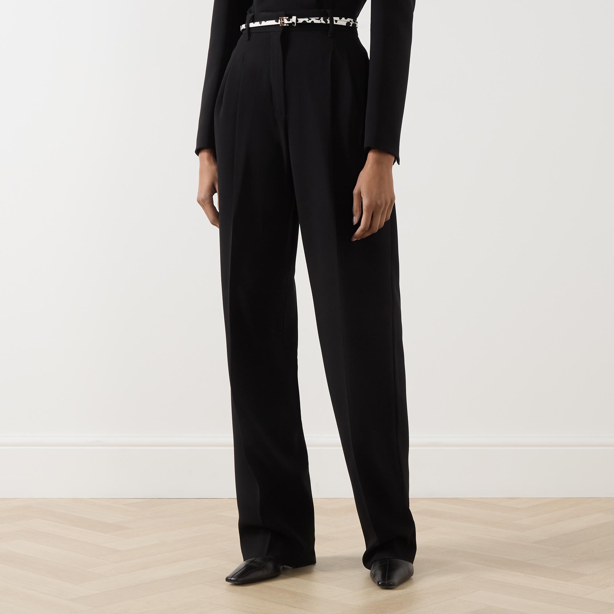 - High rise, wide leg, full length, belt loops, concealed fly with hook and bar fastening, double front pleats, two side entry pockets, clean hems, pressed creases, includes belt