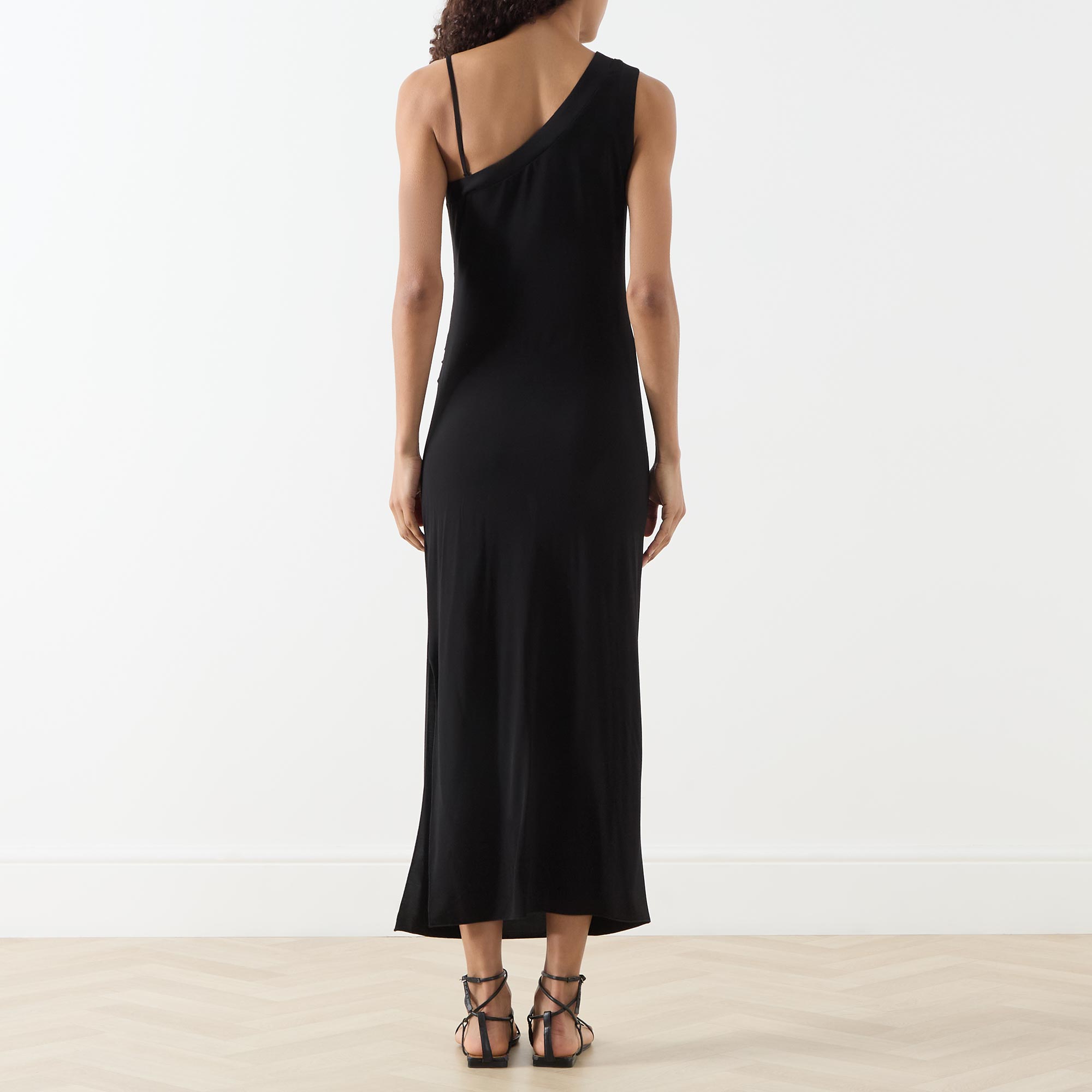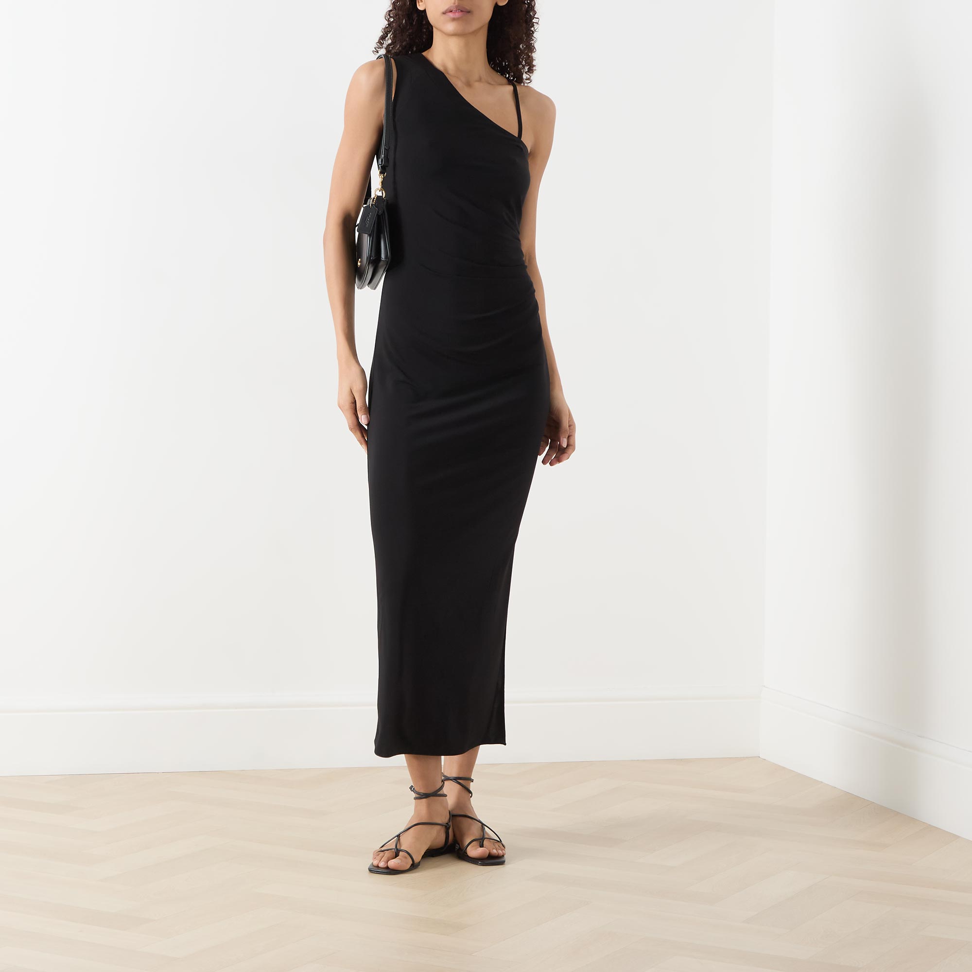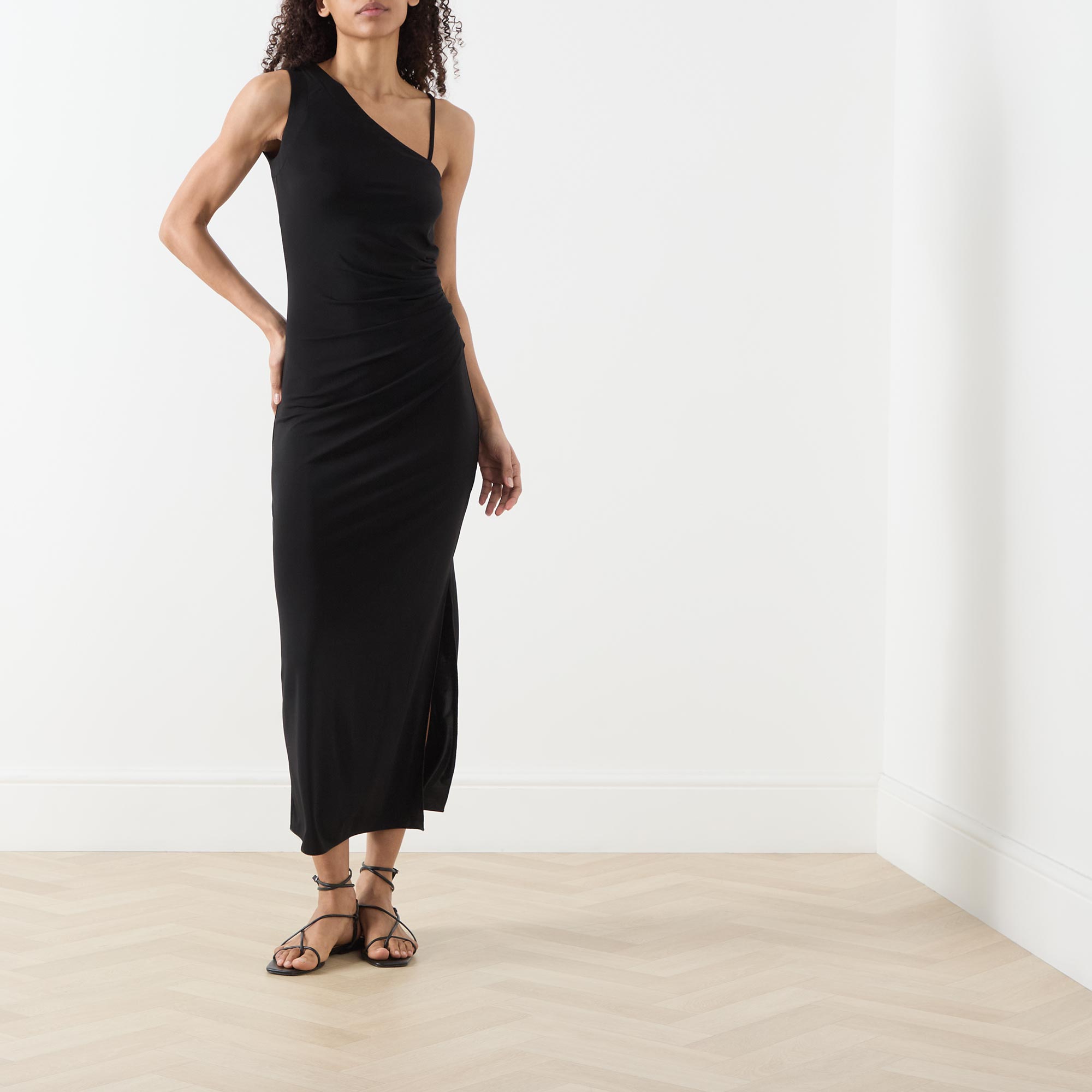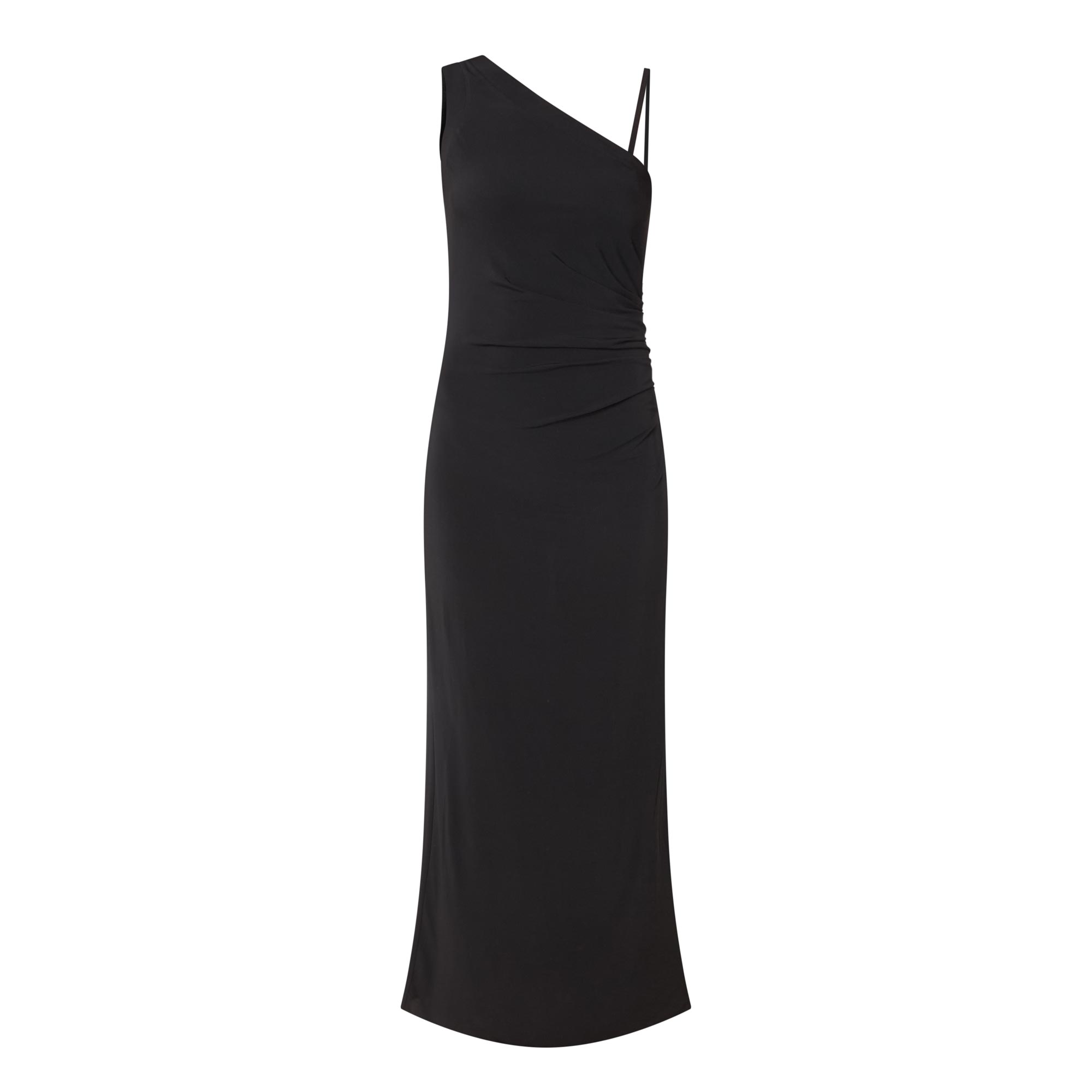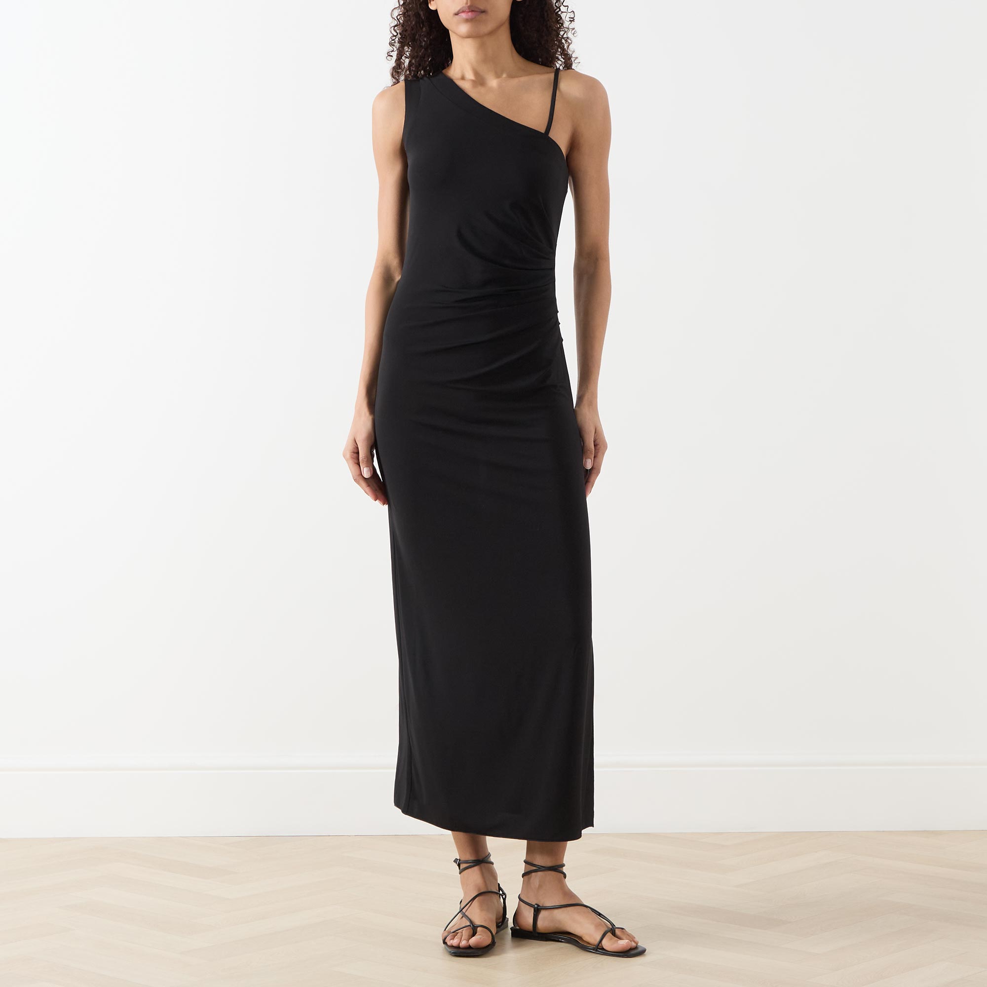 - Asymmetric straps with one wide strap and one removable spaghetti strap, midi length, slit side seams, ruched details, unlined
