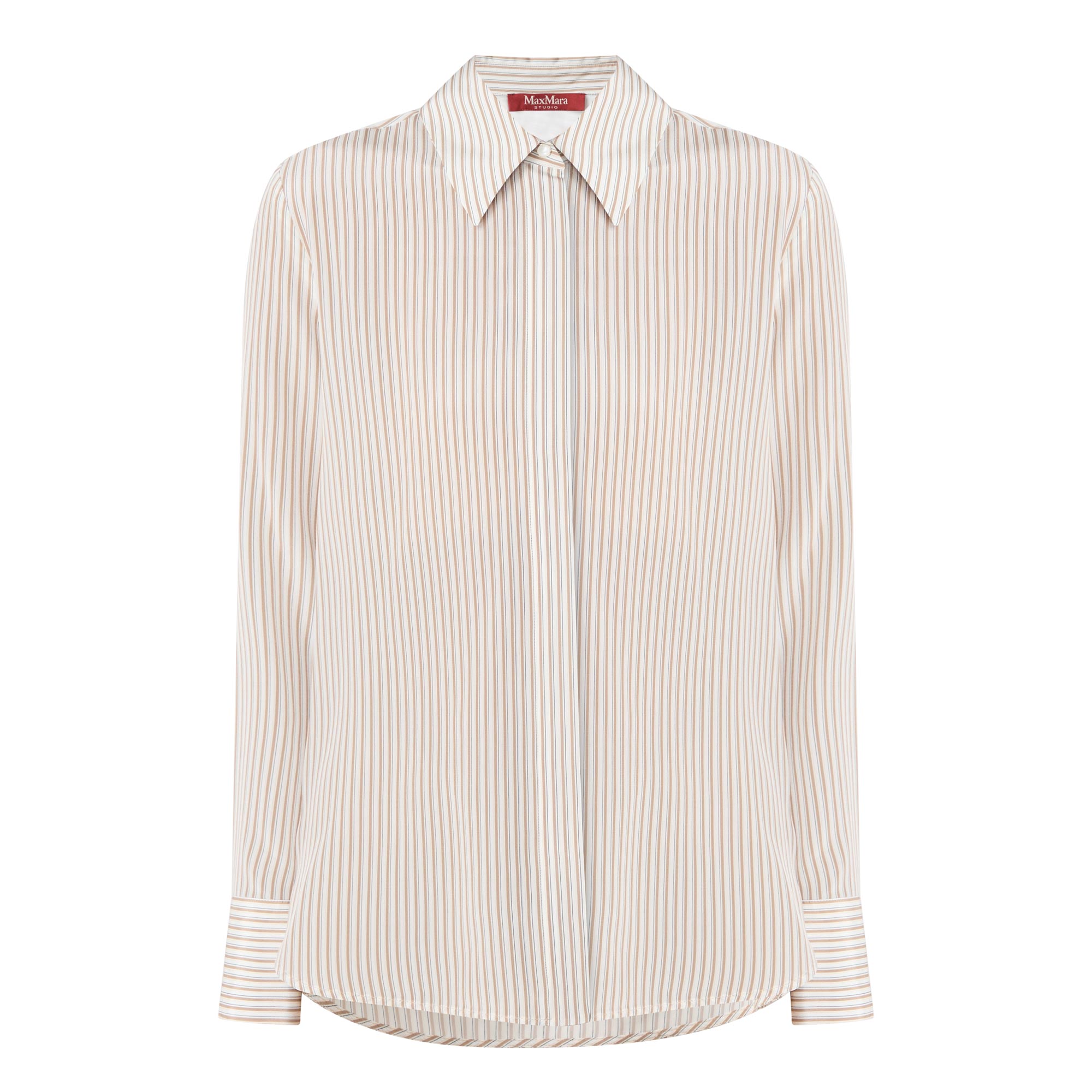 - Point collar, long sleeves, buttoned cuffs, concealed front button fastening, curved hem, rear box pleat, striped design, smooth finish