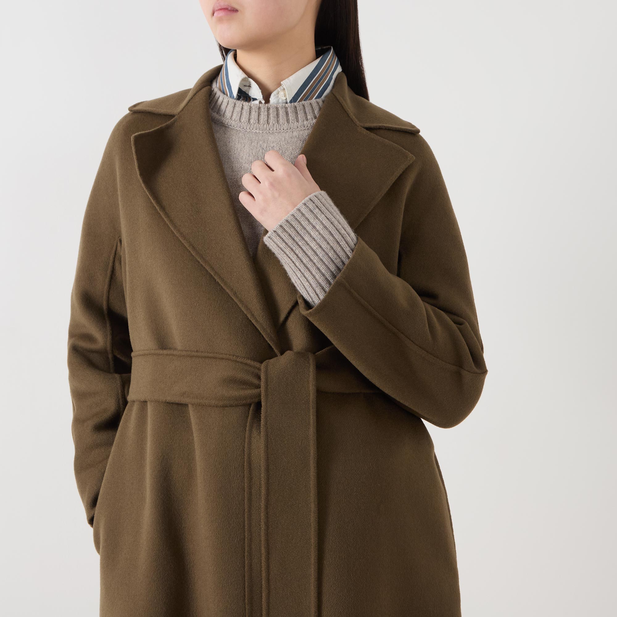 - Self-tying belt, long sleeves, mid length, open front, side pockets