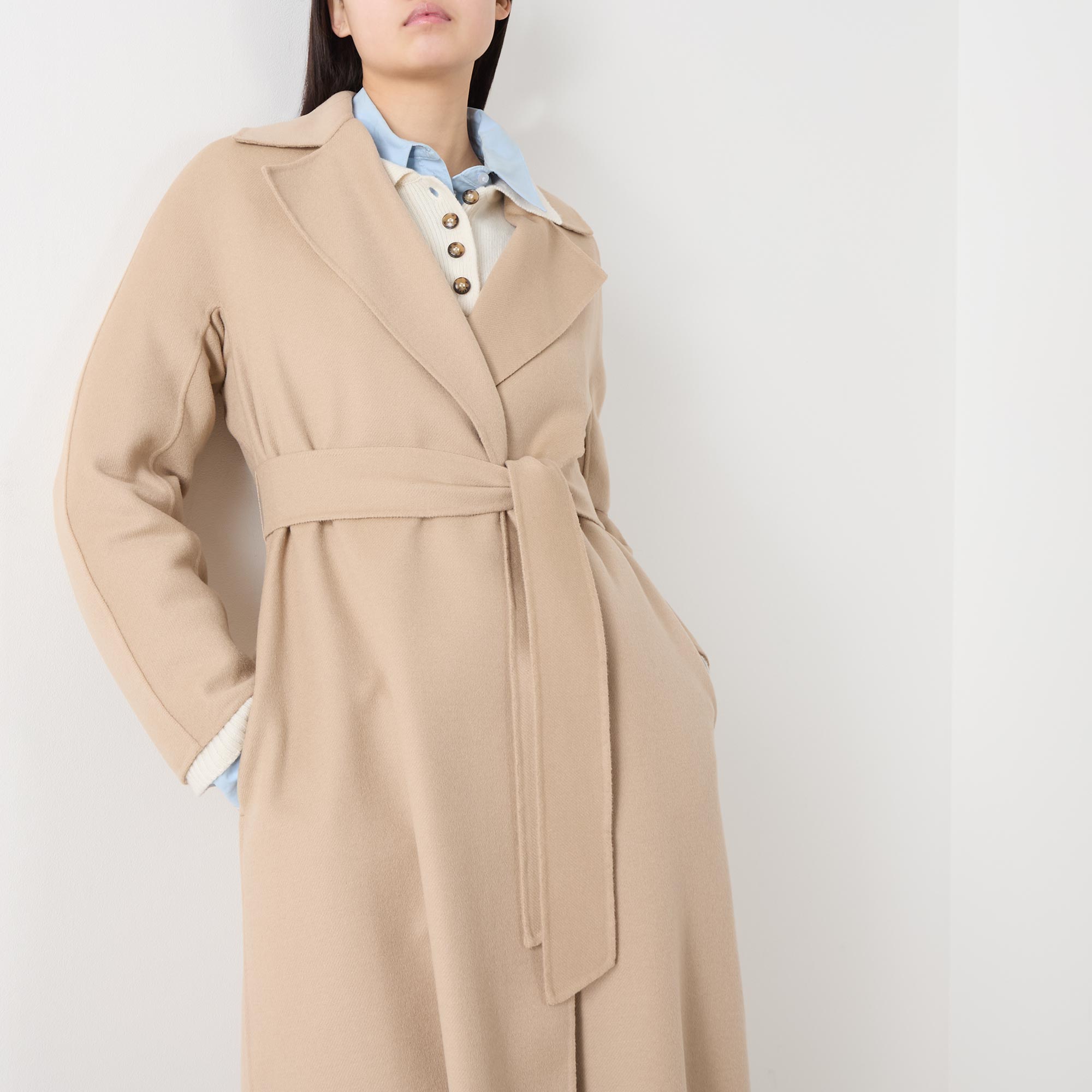 - Self-tying belt, long sleeves, mid length, open front, side pockets