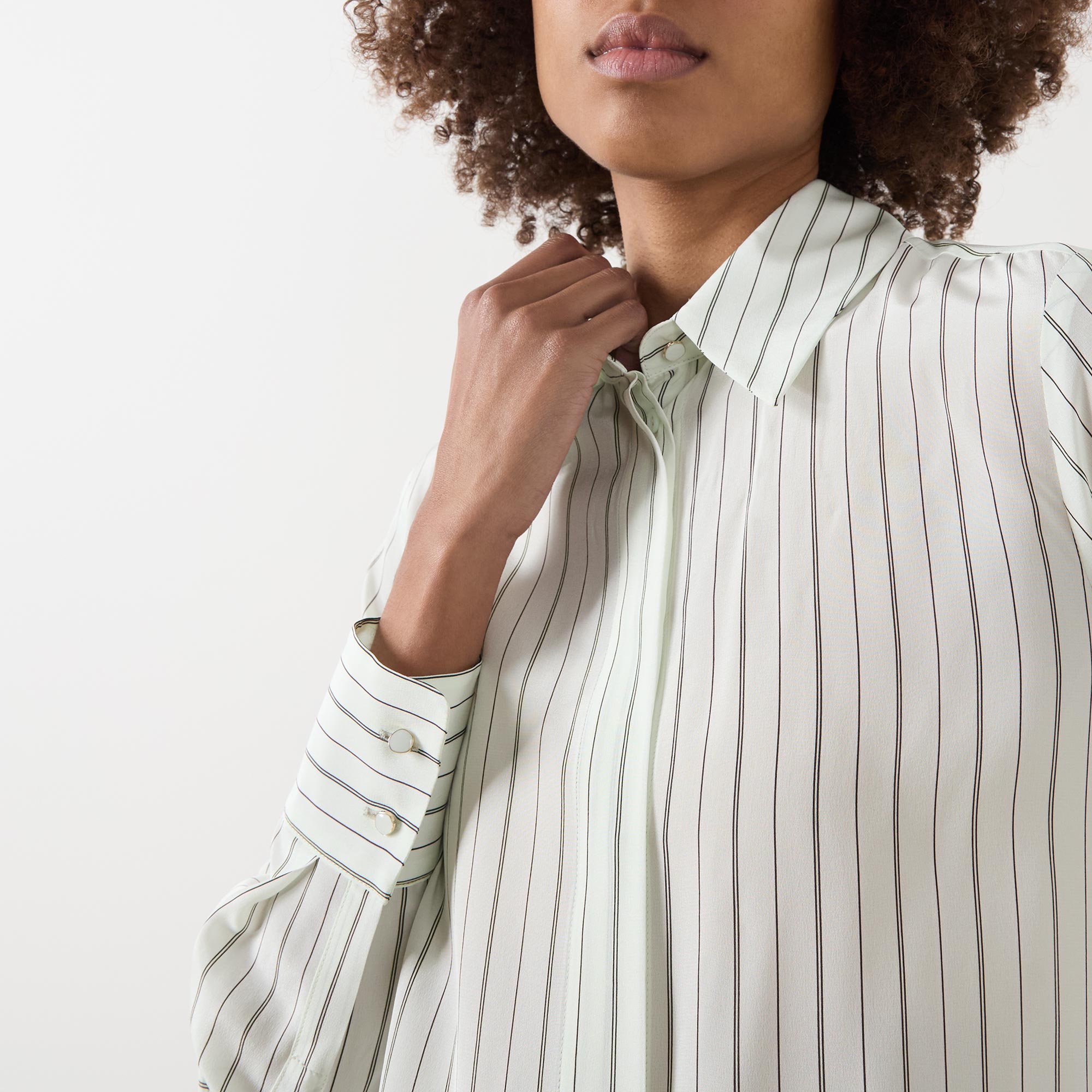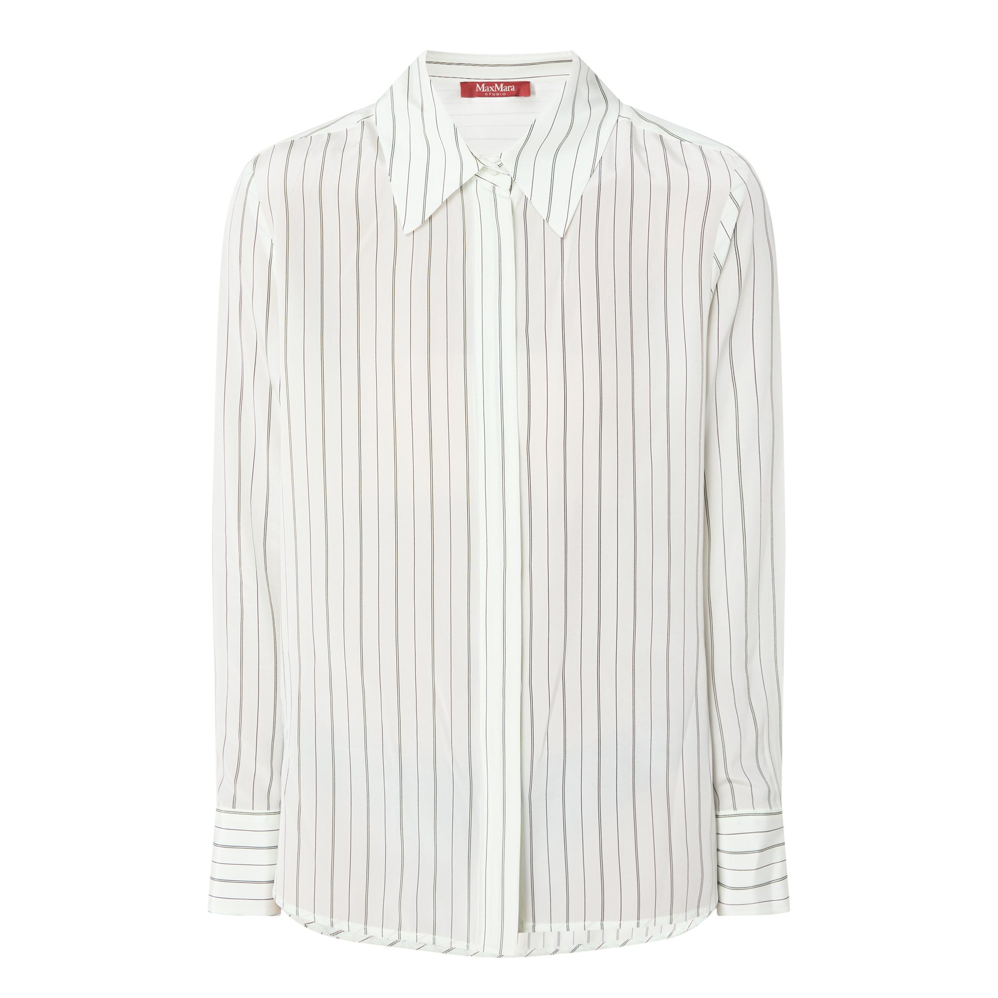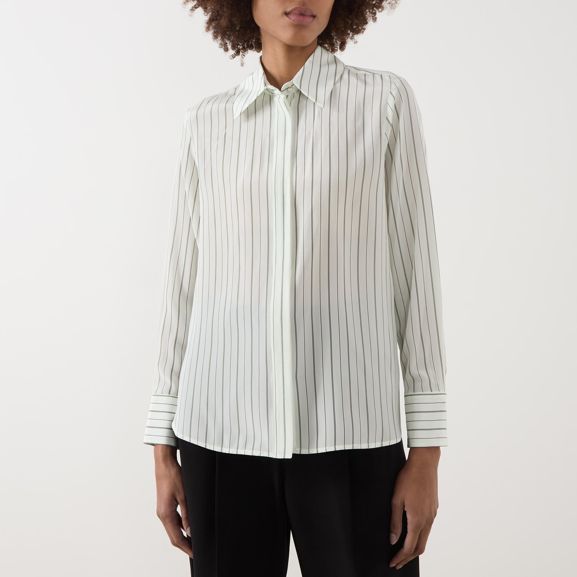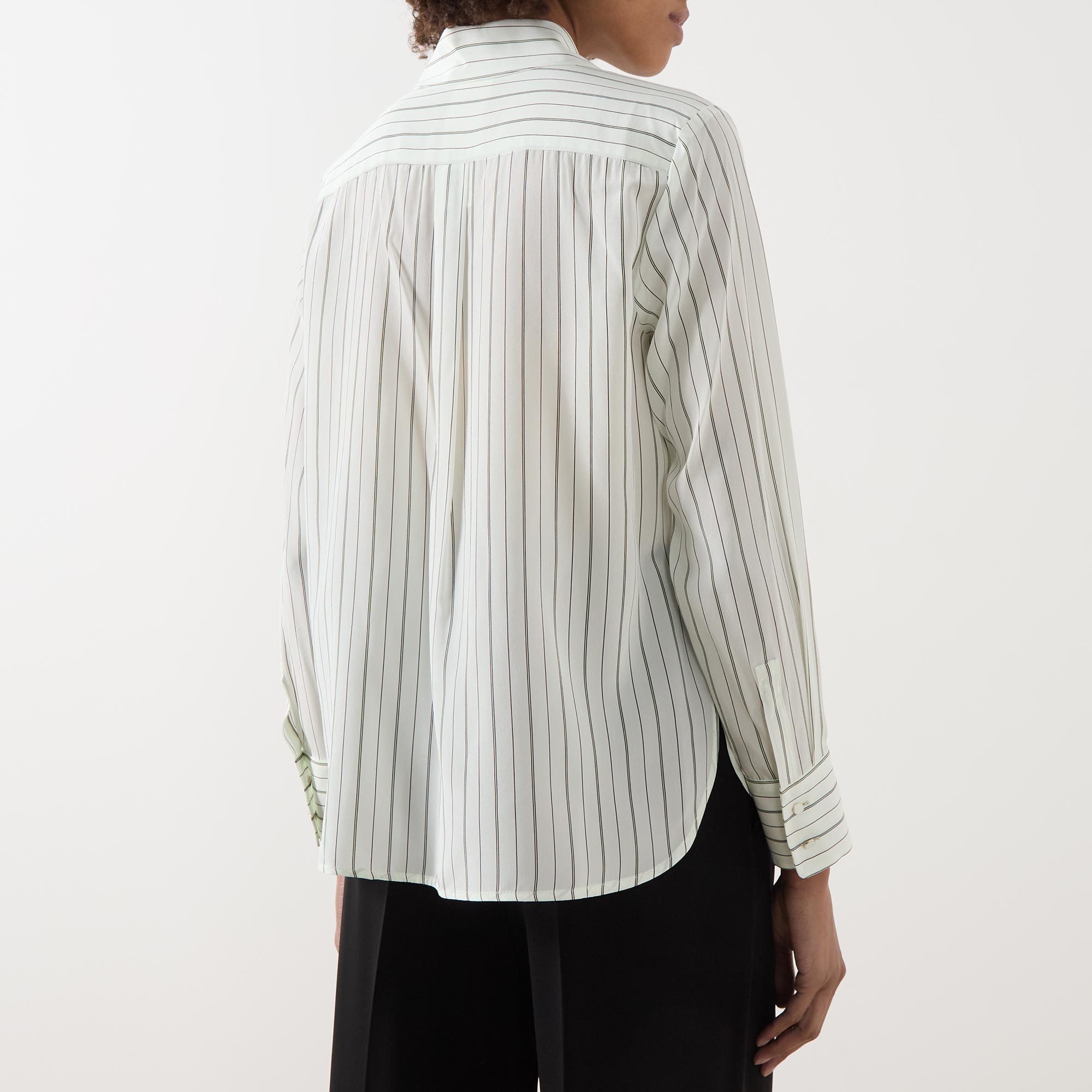- Point collar, long sleeves, buttoned cuffs, concealed front button fastening, curved hem, rear box pleat, striped design, smooth finish