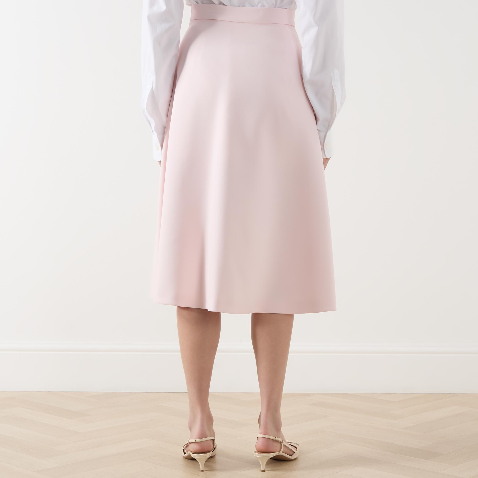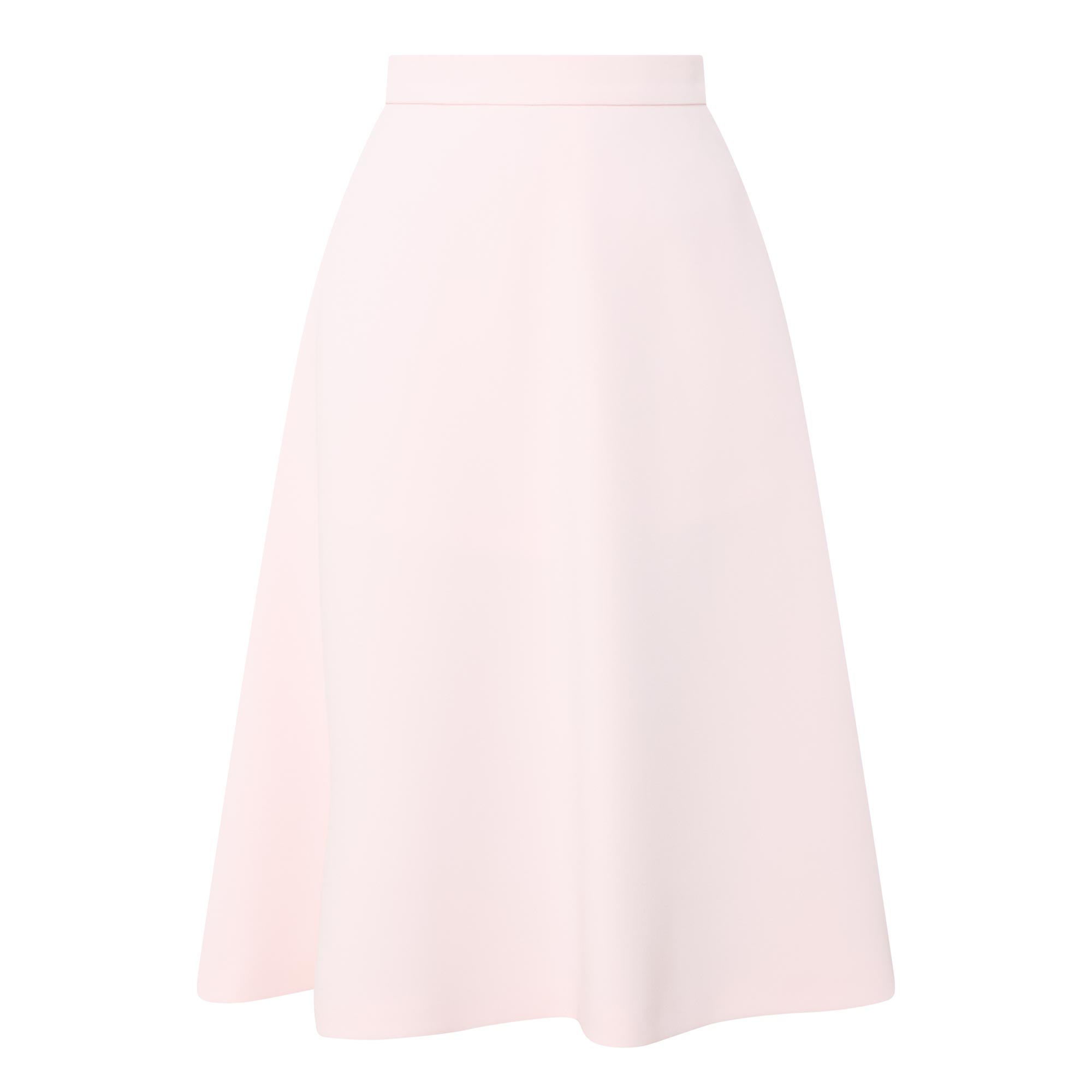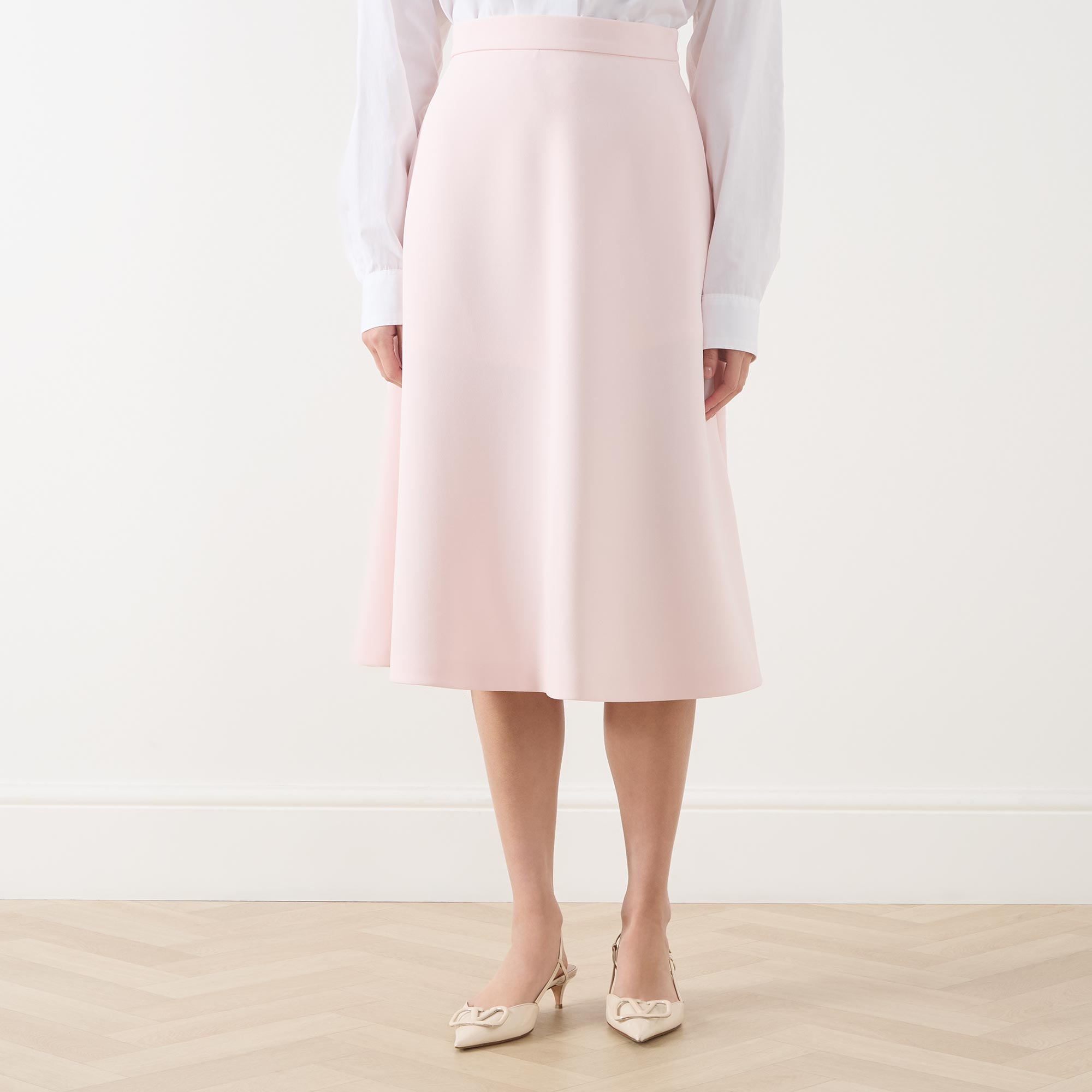 - High-rise, wide waistband, side zip-fastening closure, A-line silhouette, midi length
