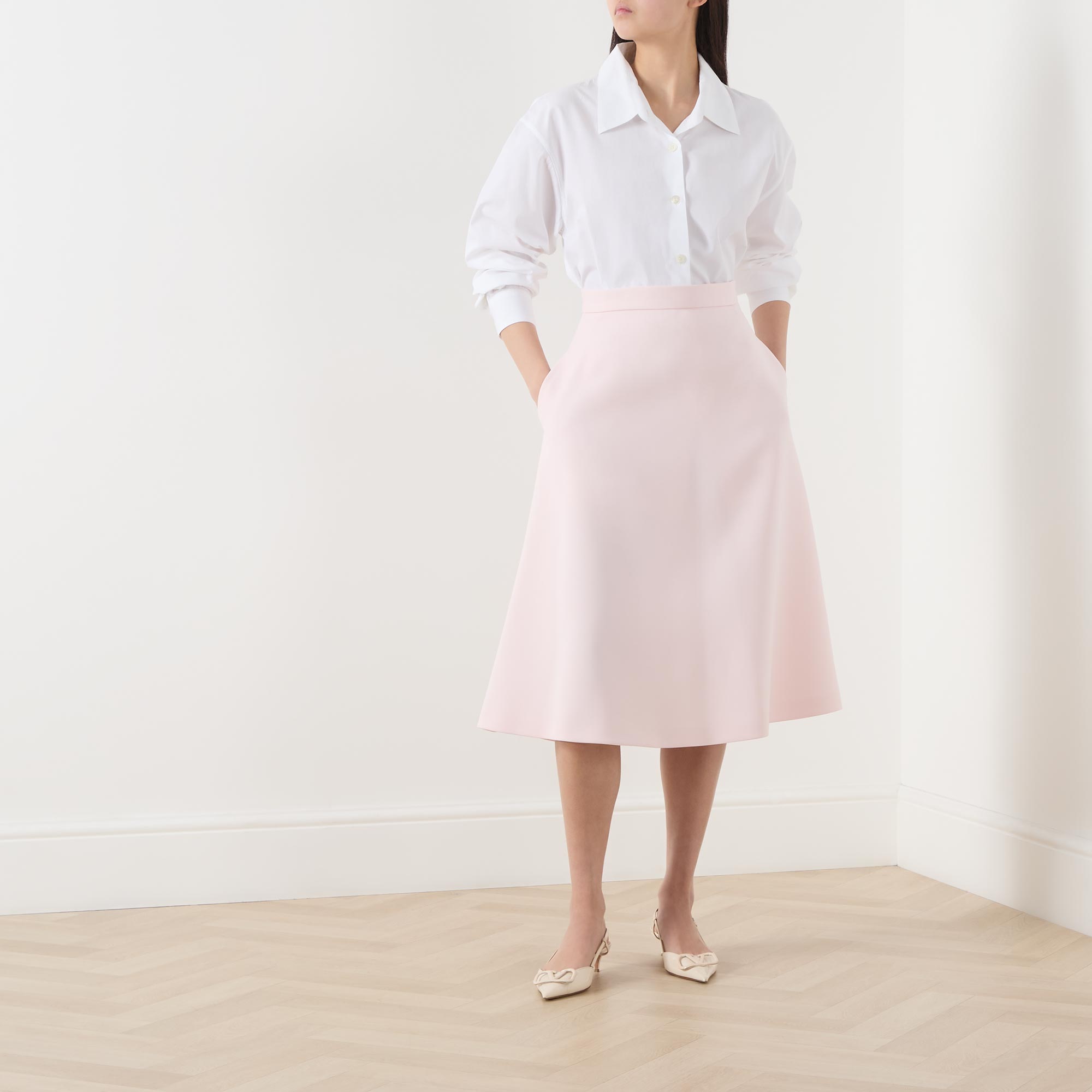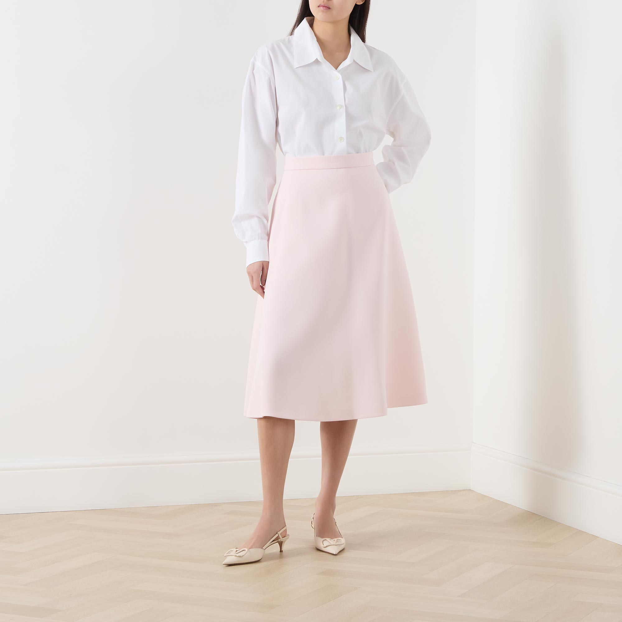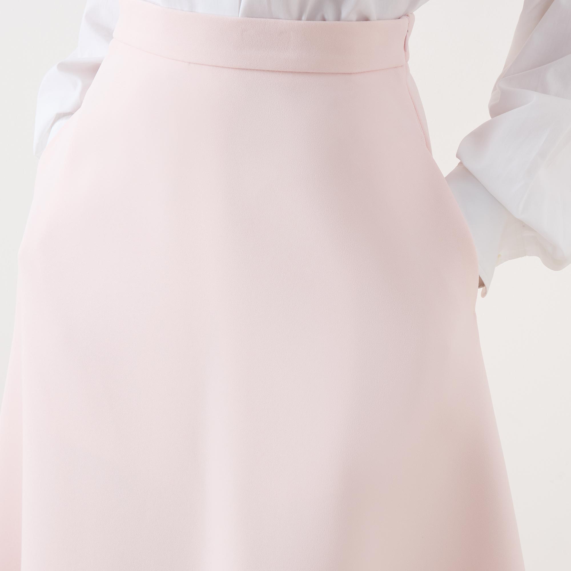 - High-rise, wide waistband, side zip-fastening closure, A-line silhouette, midi length
