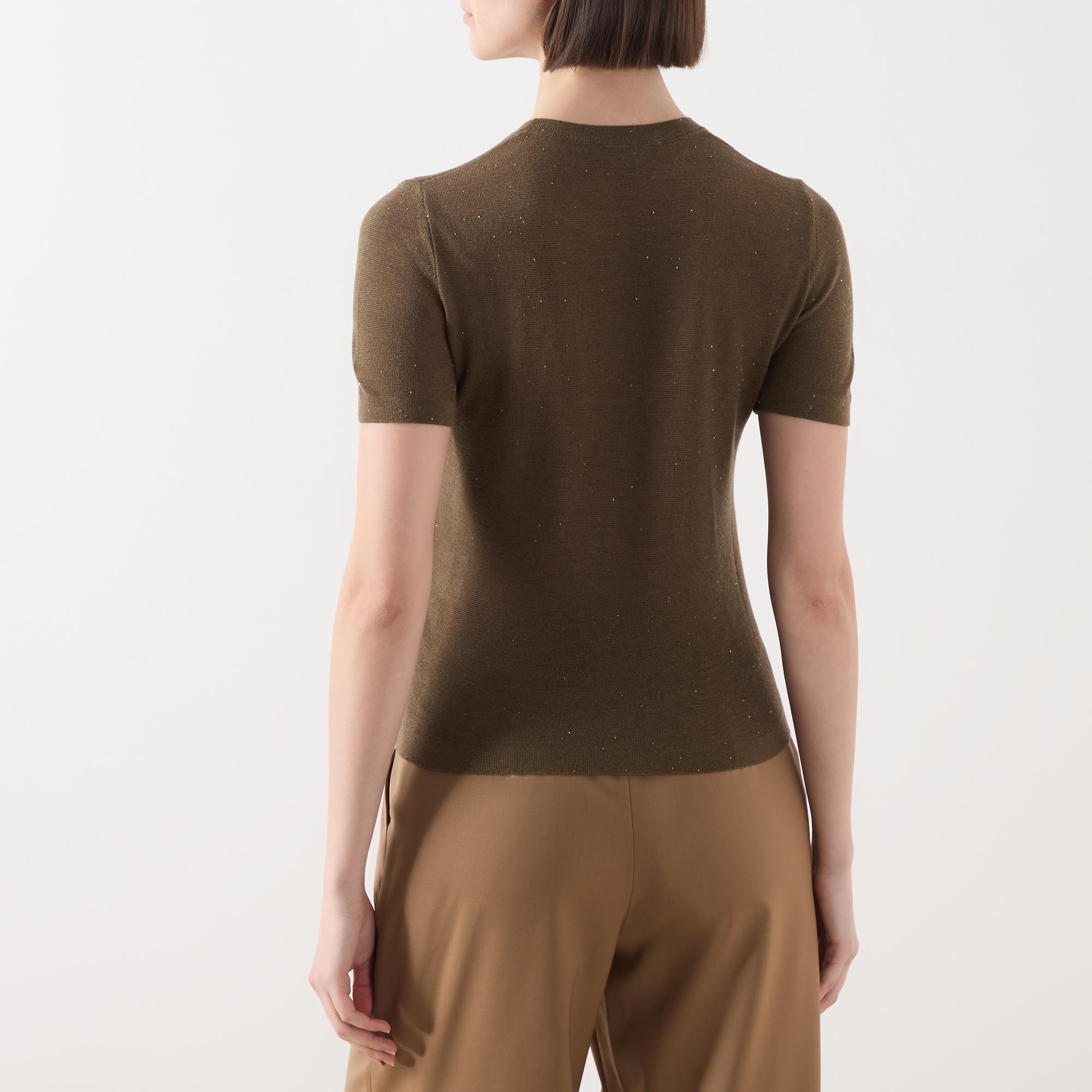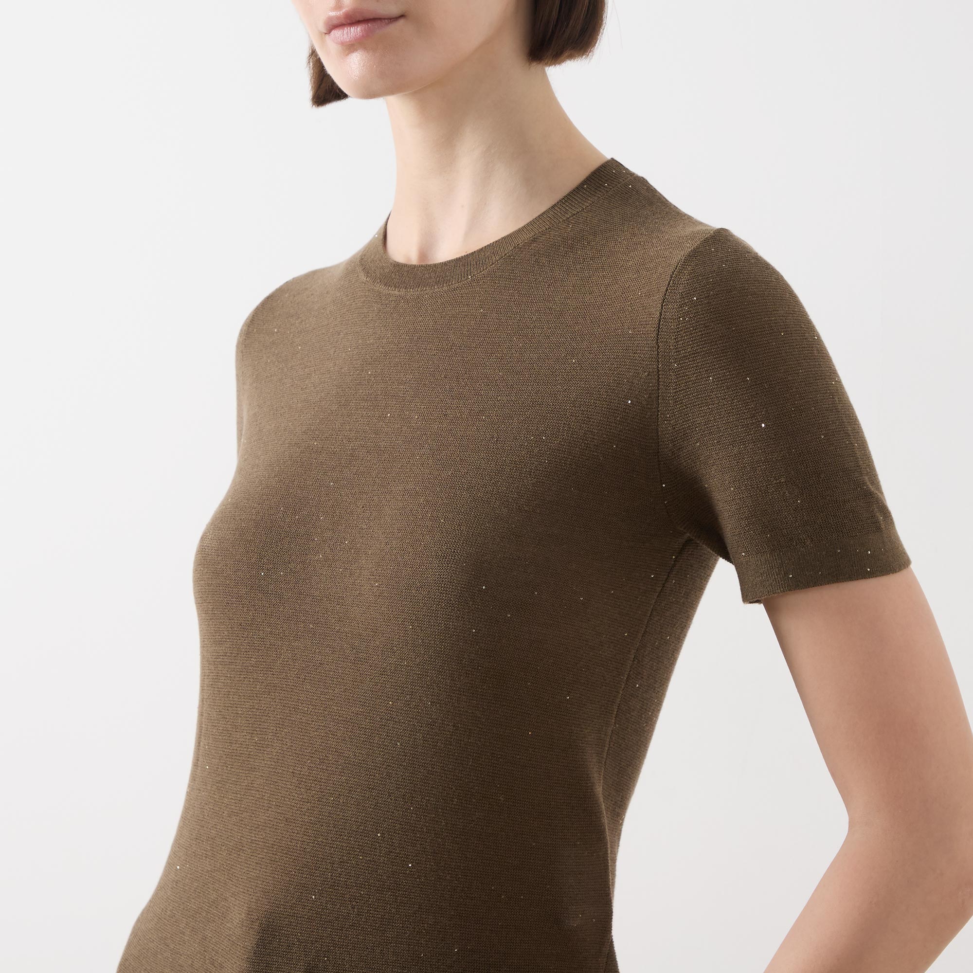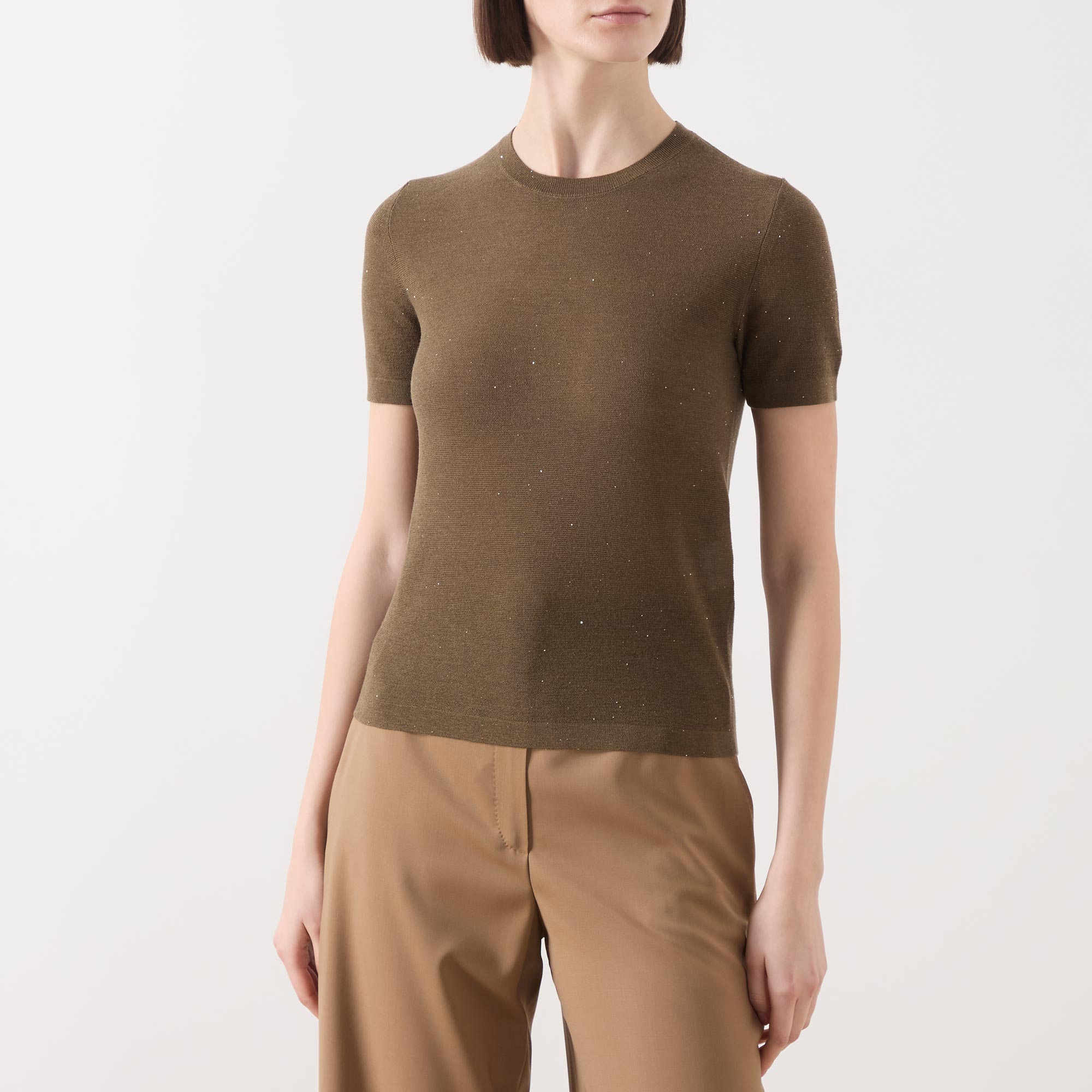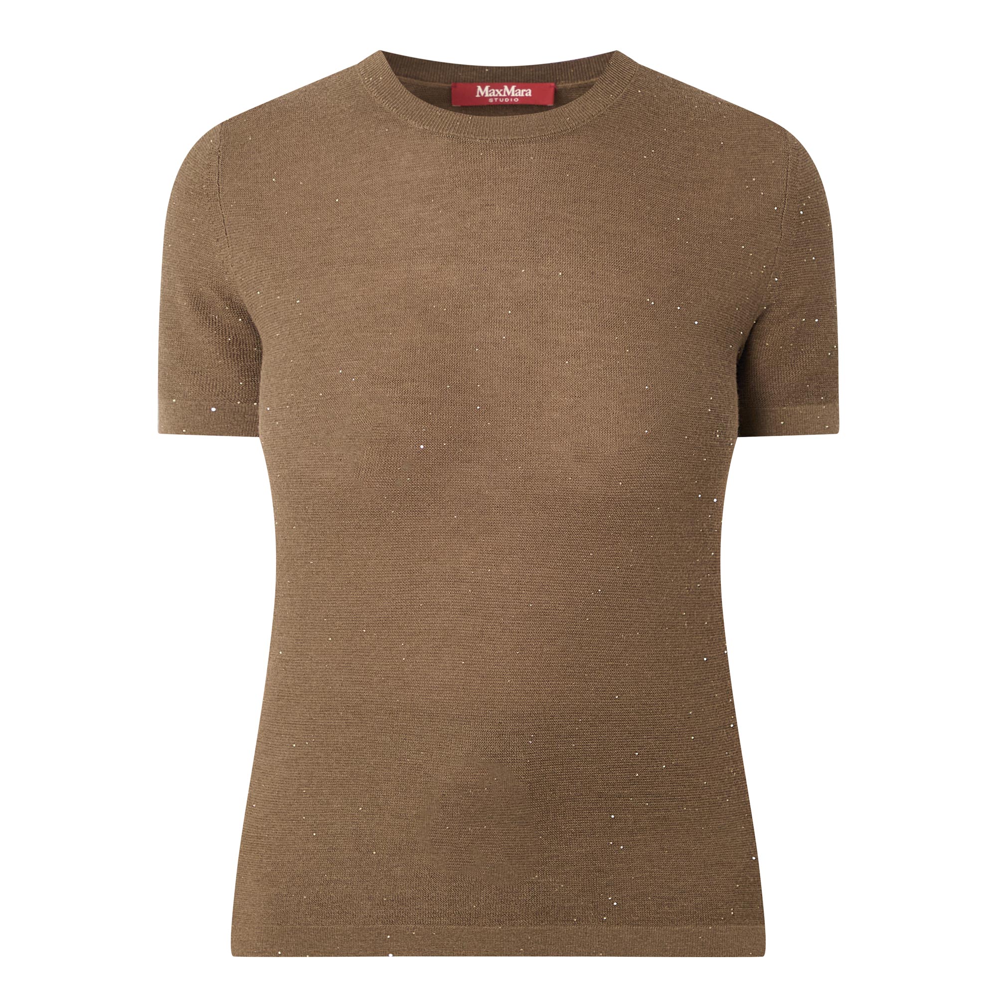 - Crew neckline, short sleeves, straight hemline, ribbed trims, fine knit structure, glitter details