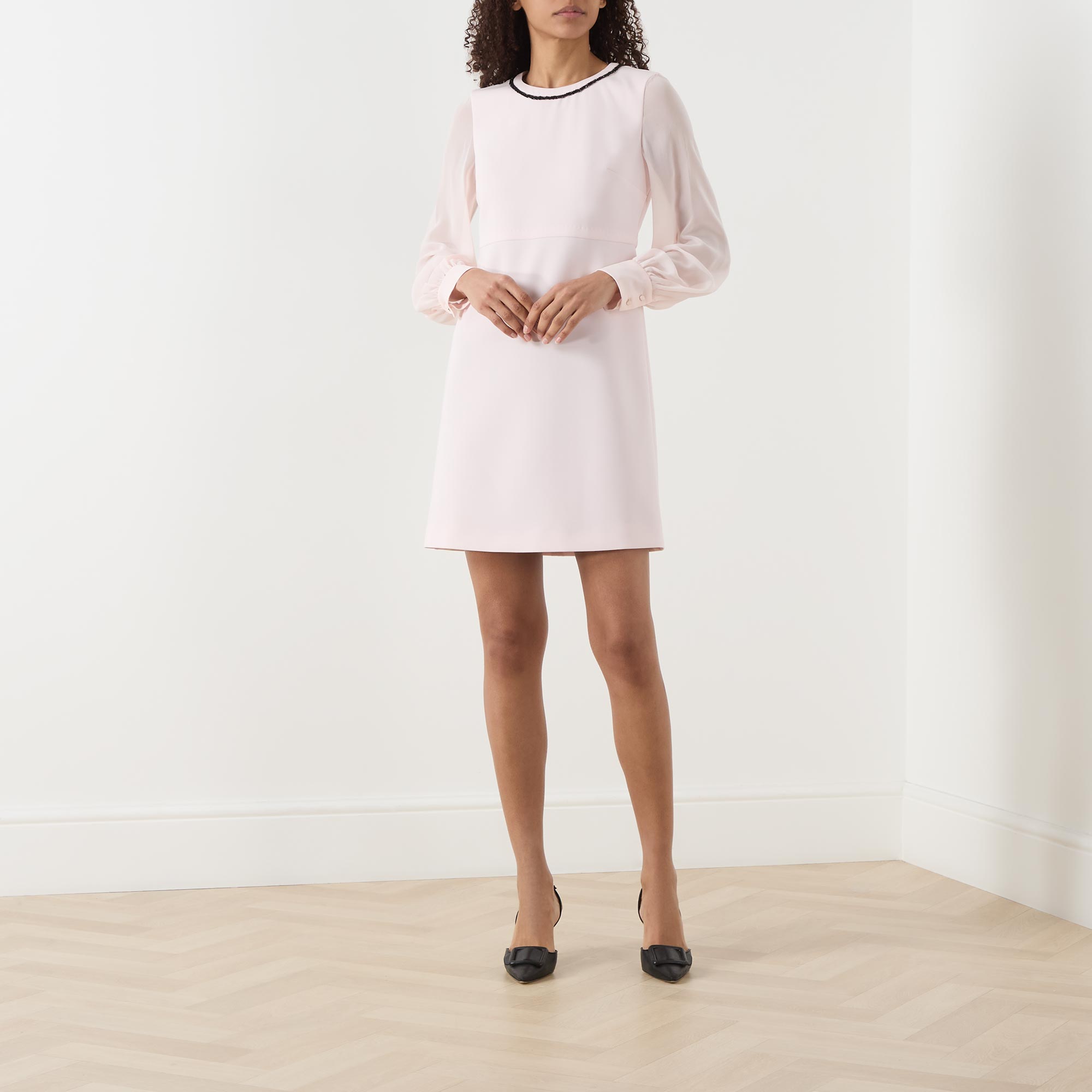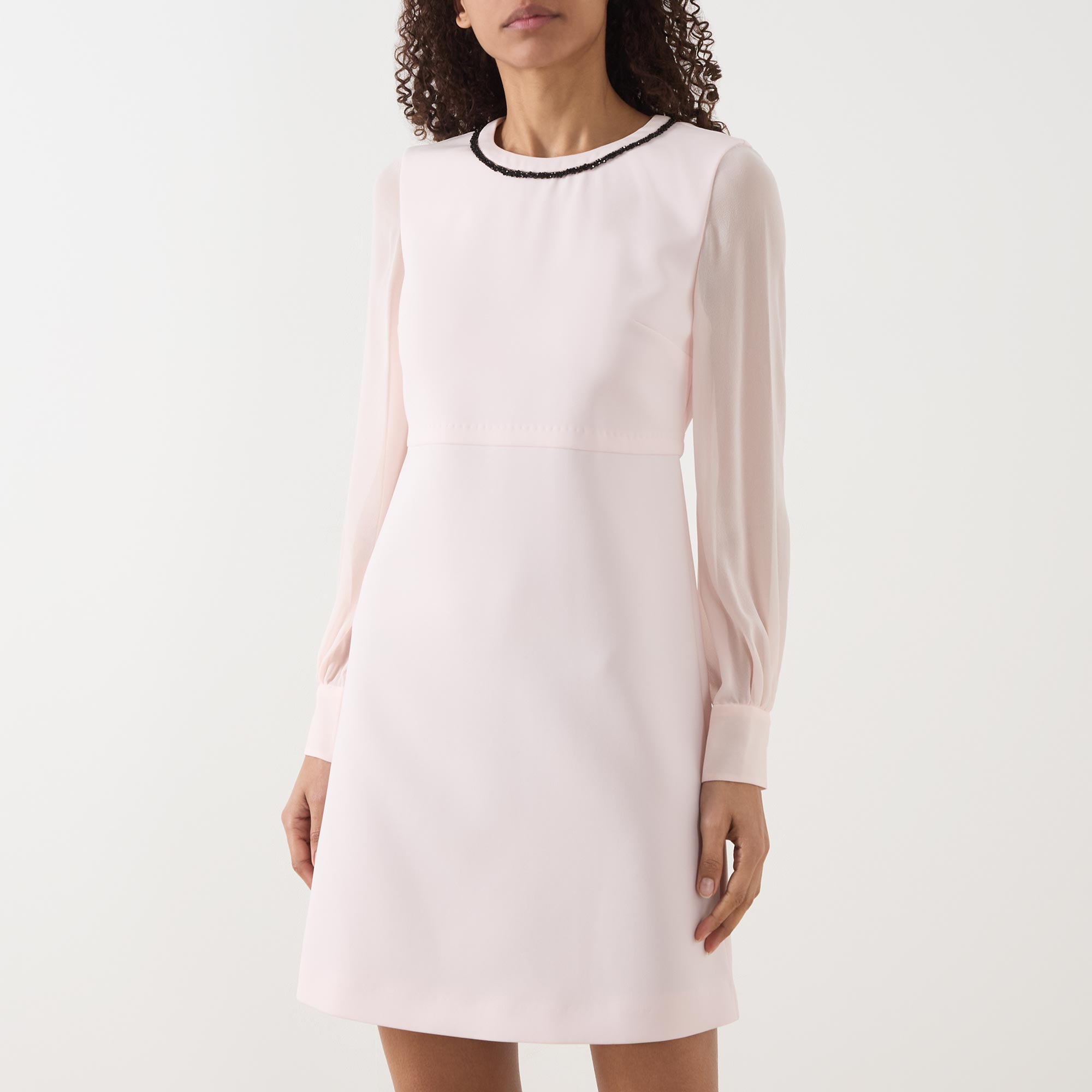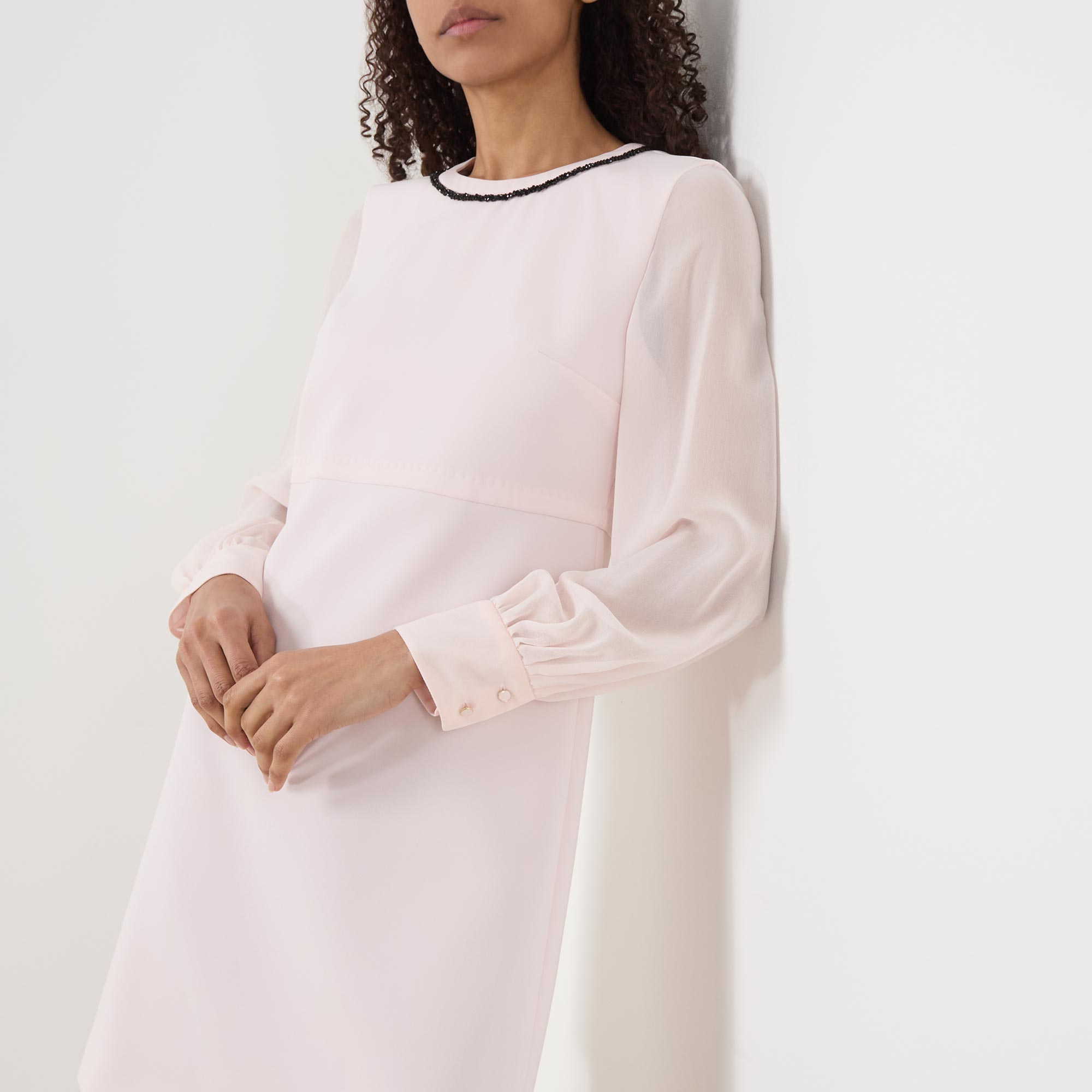 - Slightly flared, round neck, long sleeves, back zip fastening, contrast detail on neckline, silk sheer sleeves