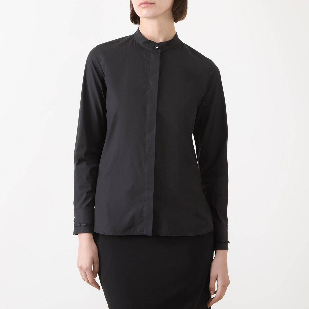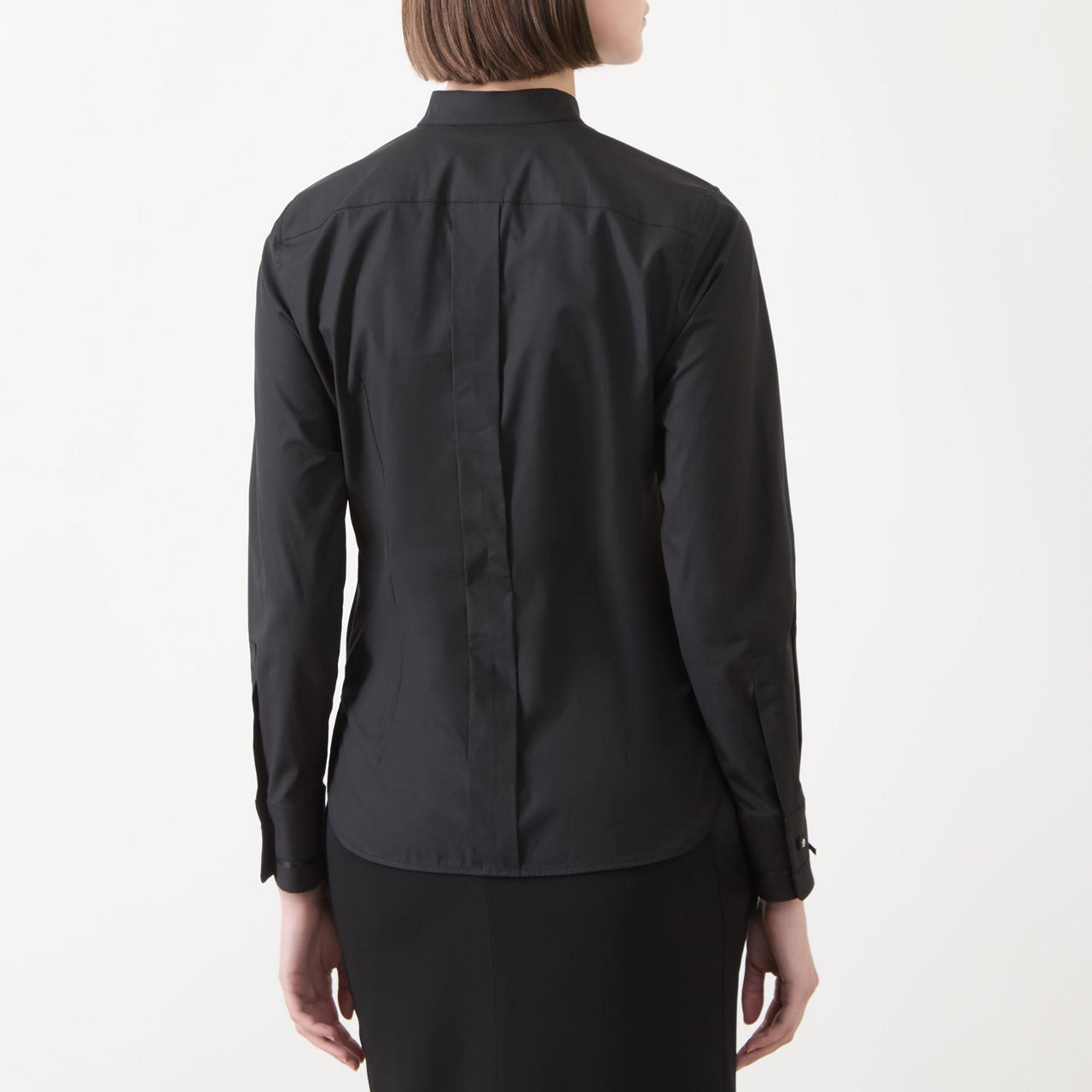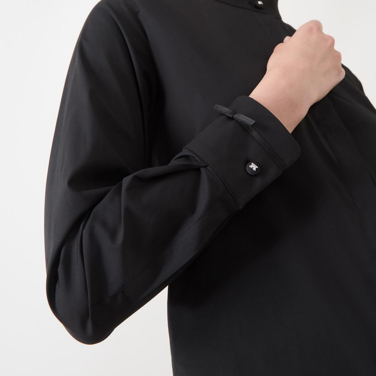- Mandarin collar, concealed button fastening, long sleeves, ribbon motif at cuffs with logo button, rounded hemline with side slits, stretch-fused poplin fabric, pleat at back