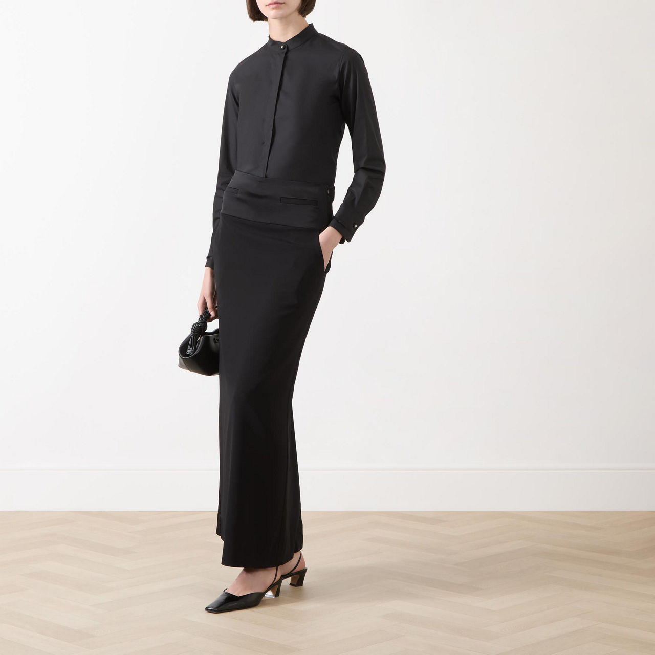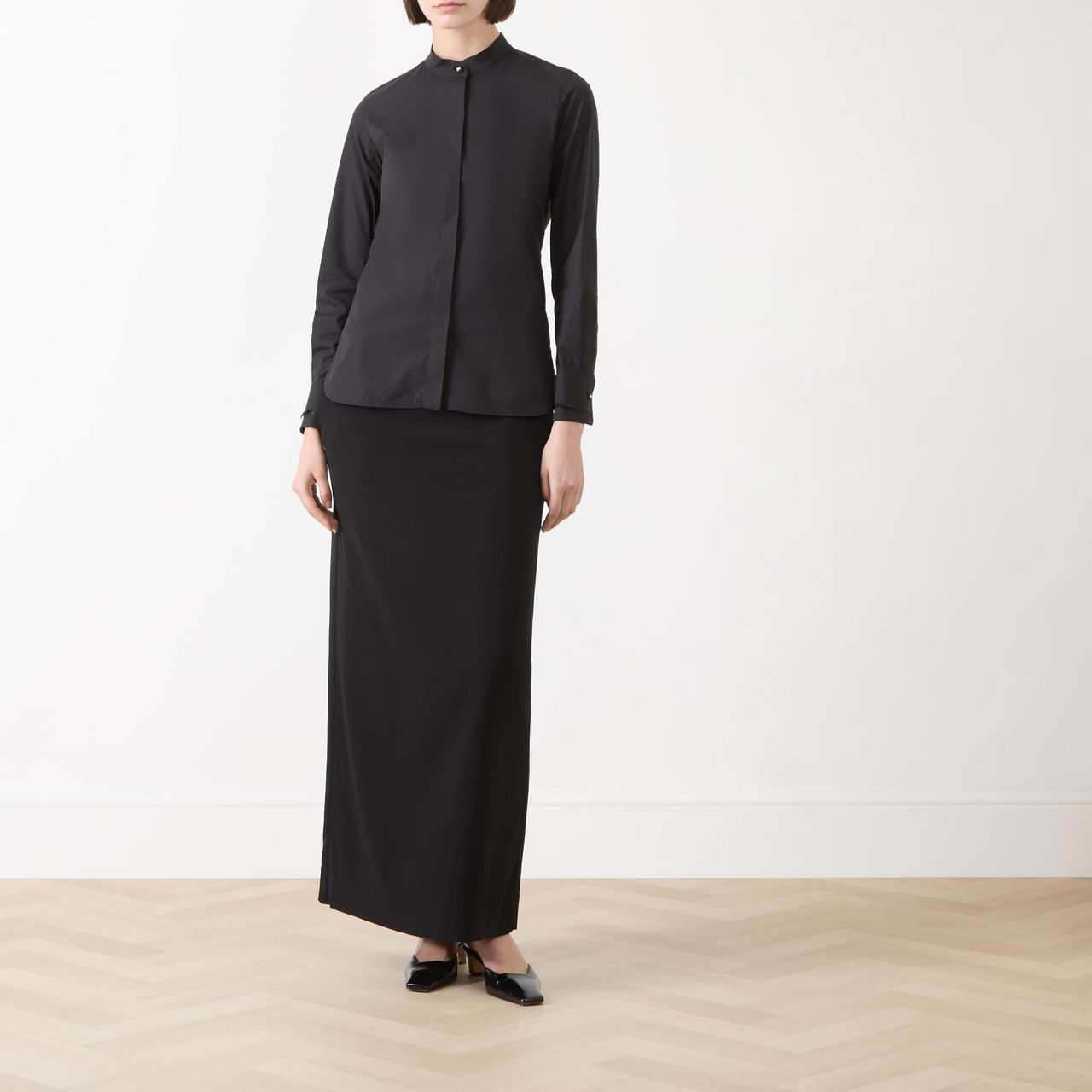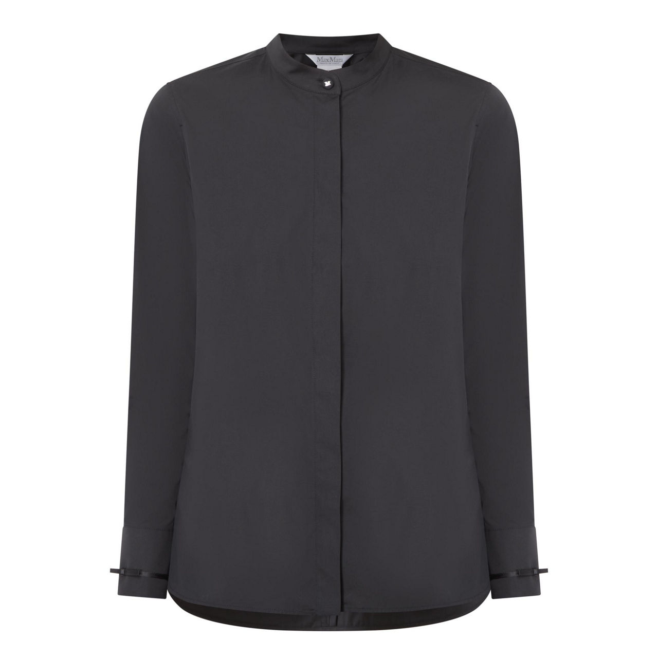 - Mandarin collar, concealed button fastening, long sleeves, ribbon motif at cuffs with logo button, rounded hemline with side slits, stretch-fused poplin fabric, pleat at back