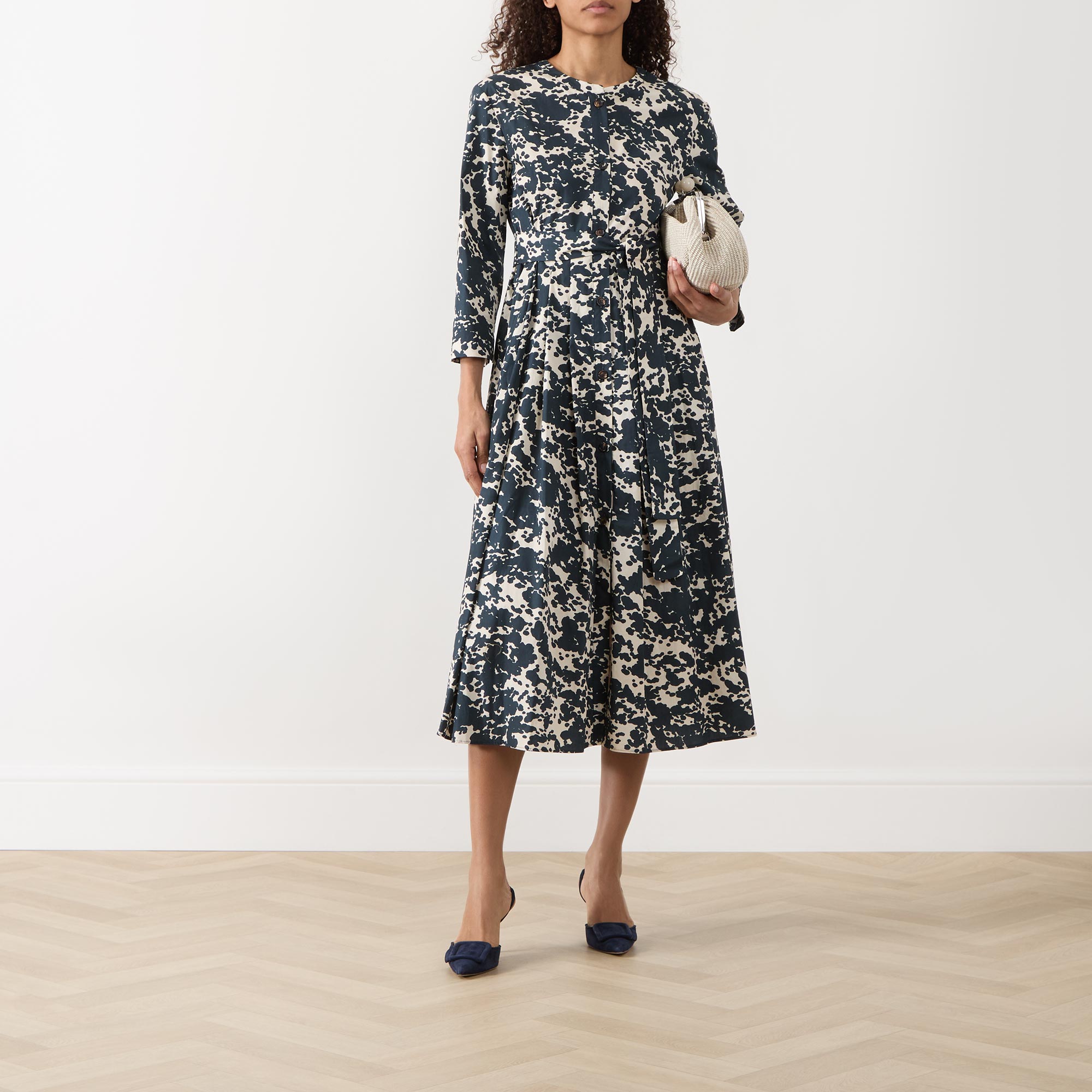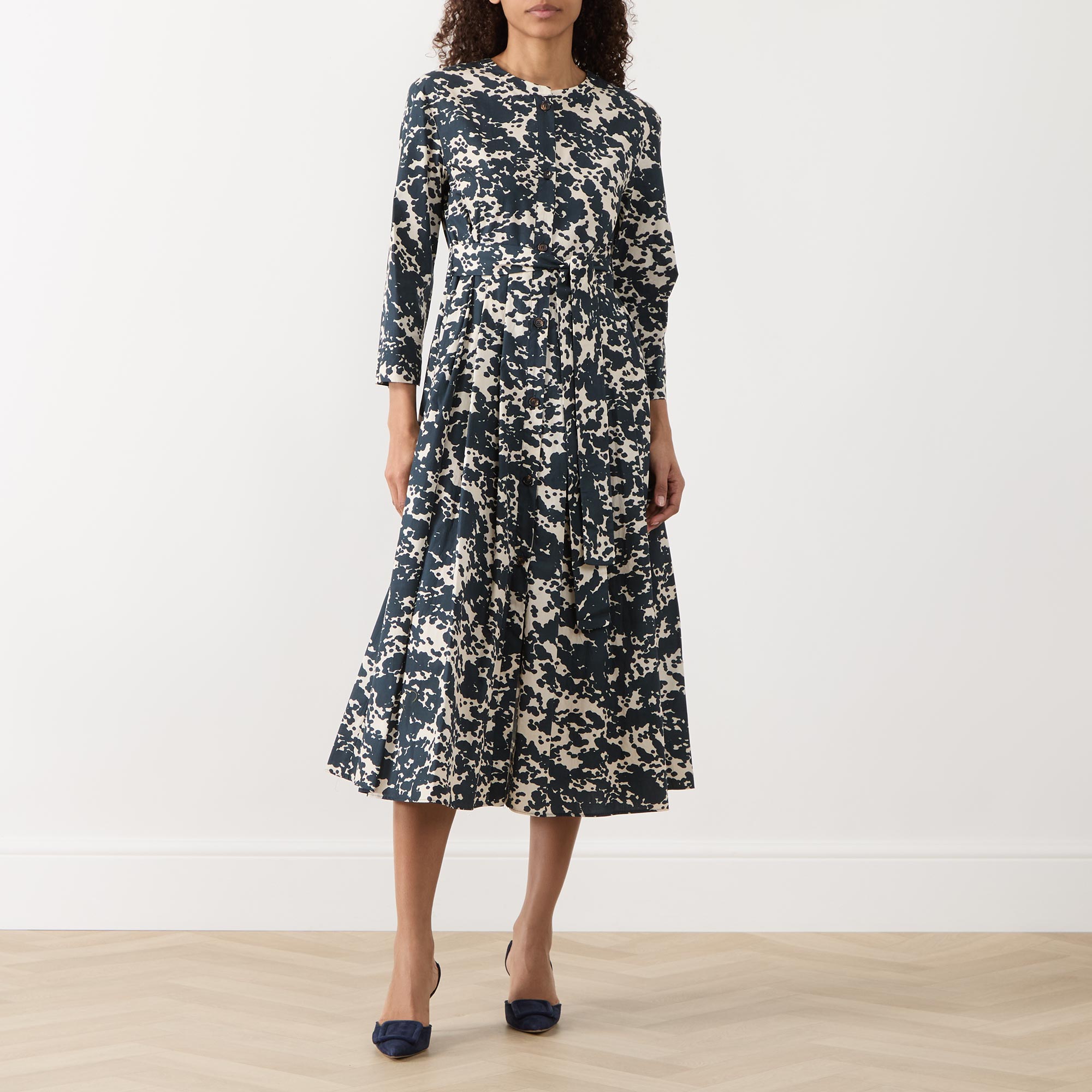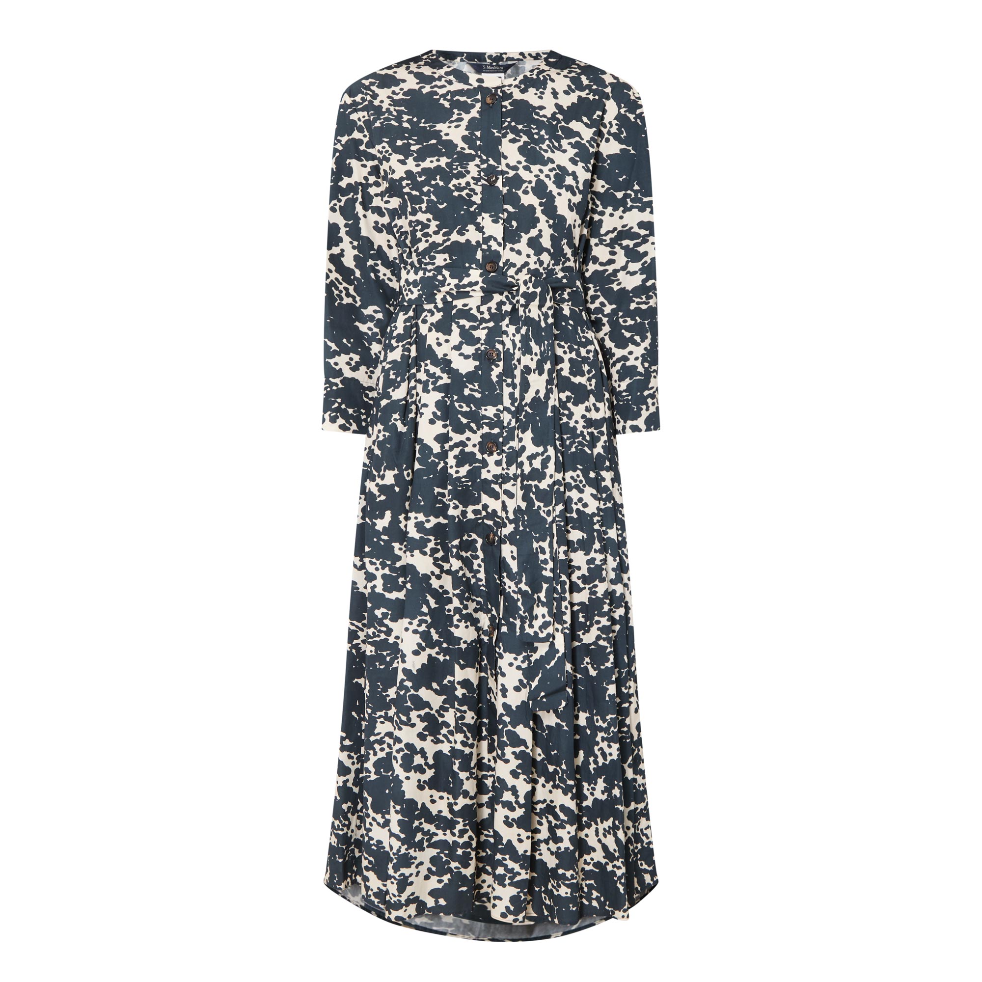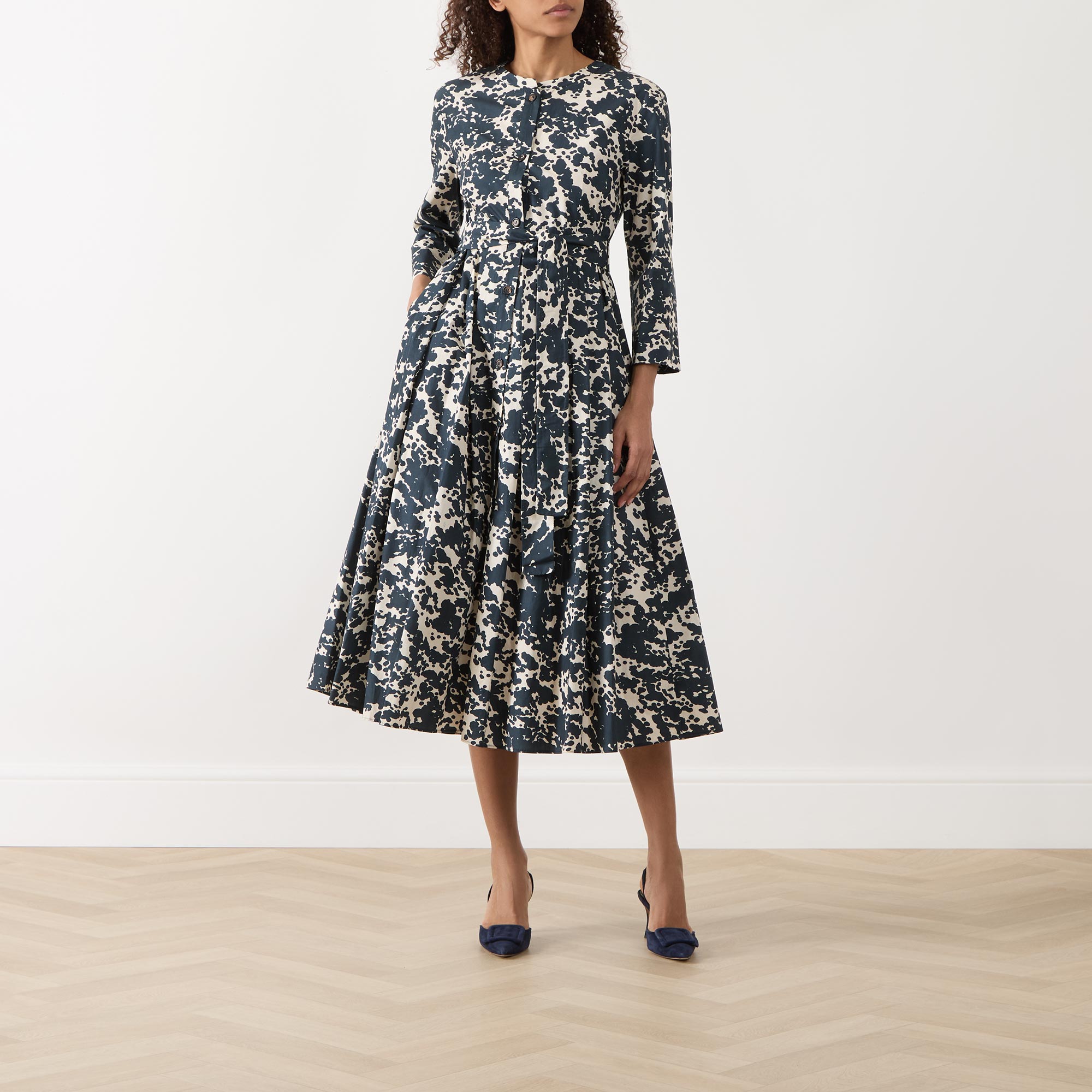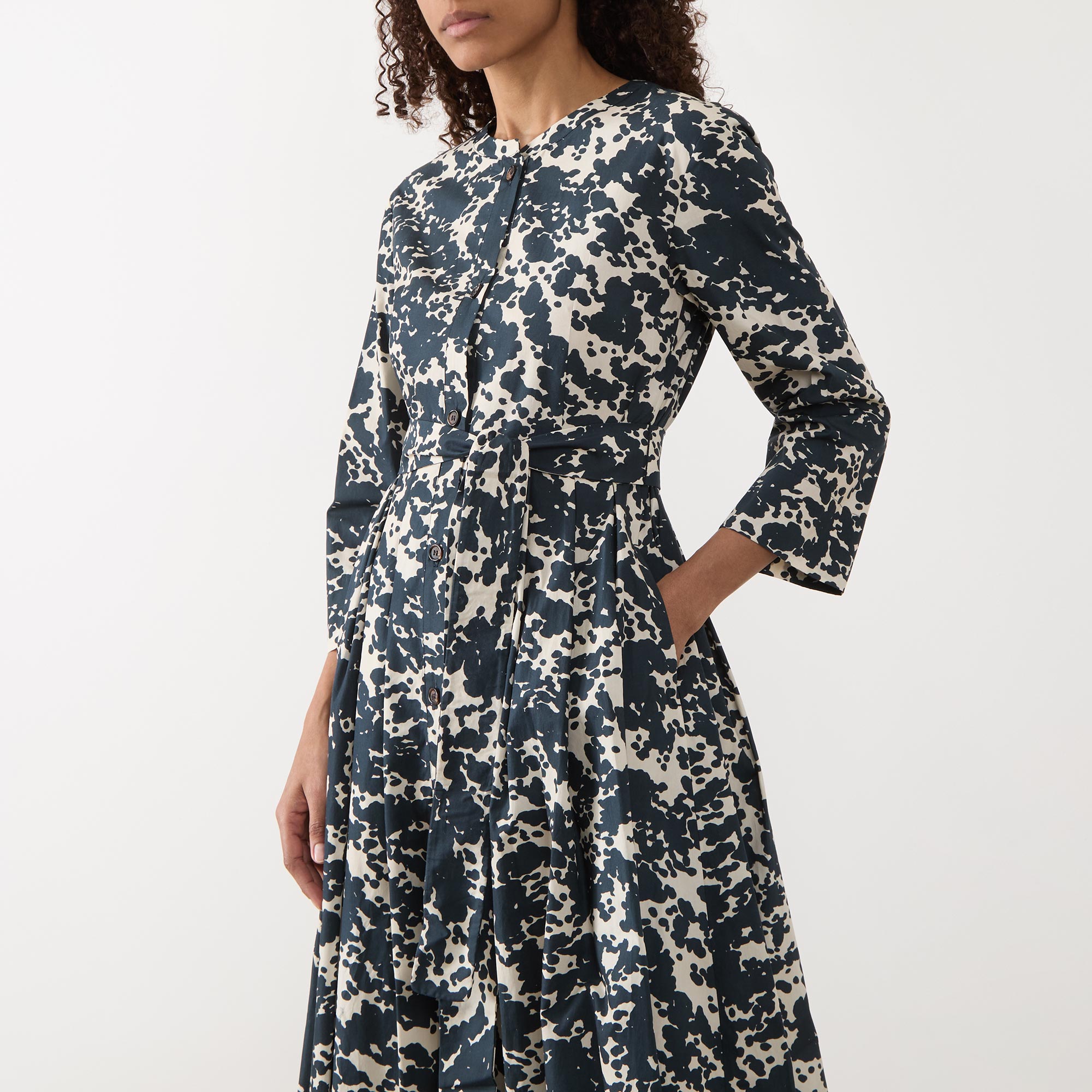 - Fit and flare silhouette, all-over print, midi length, cropped sleeves, button fastenings, two side pockets