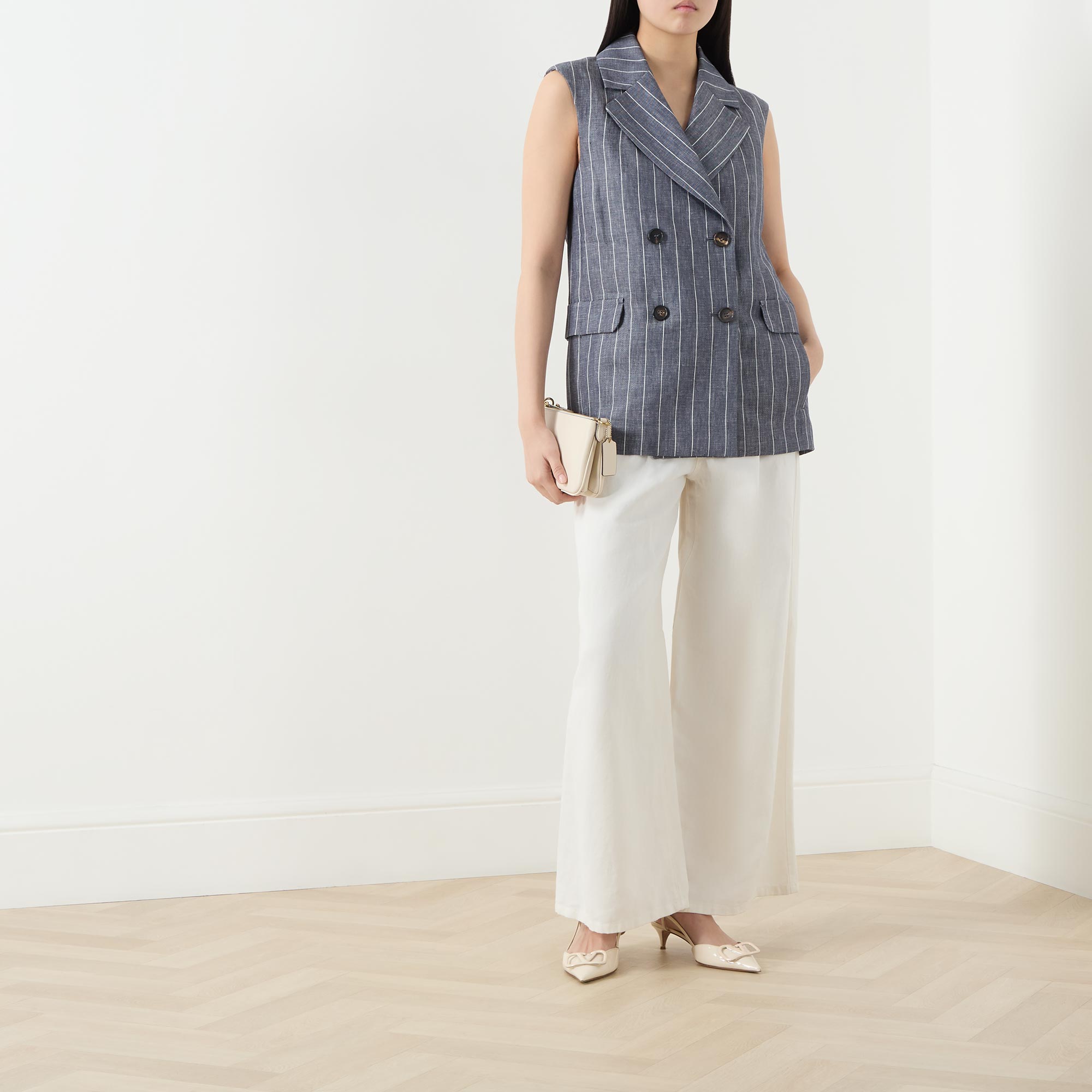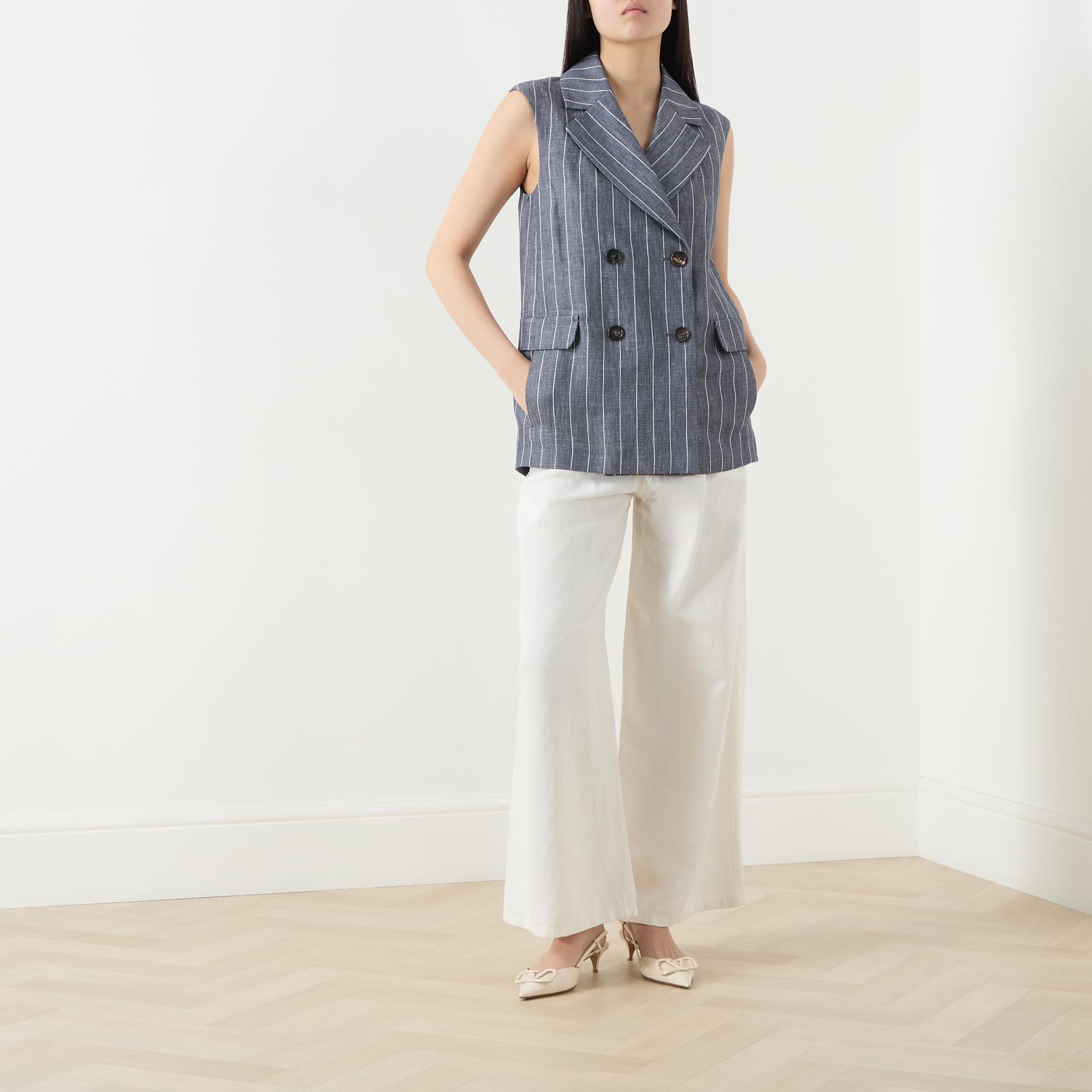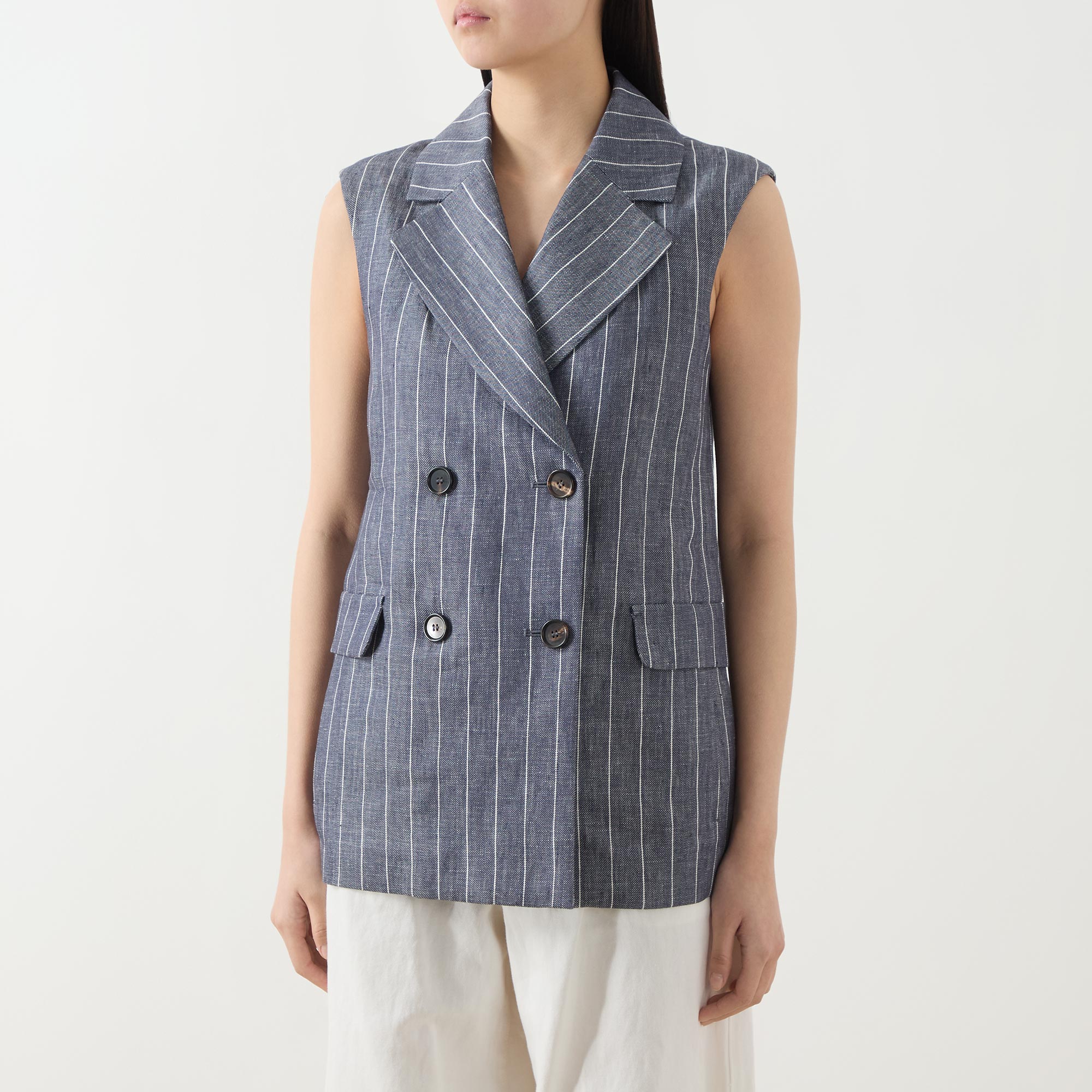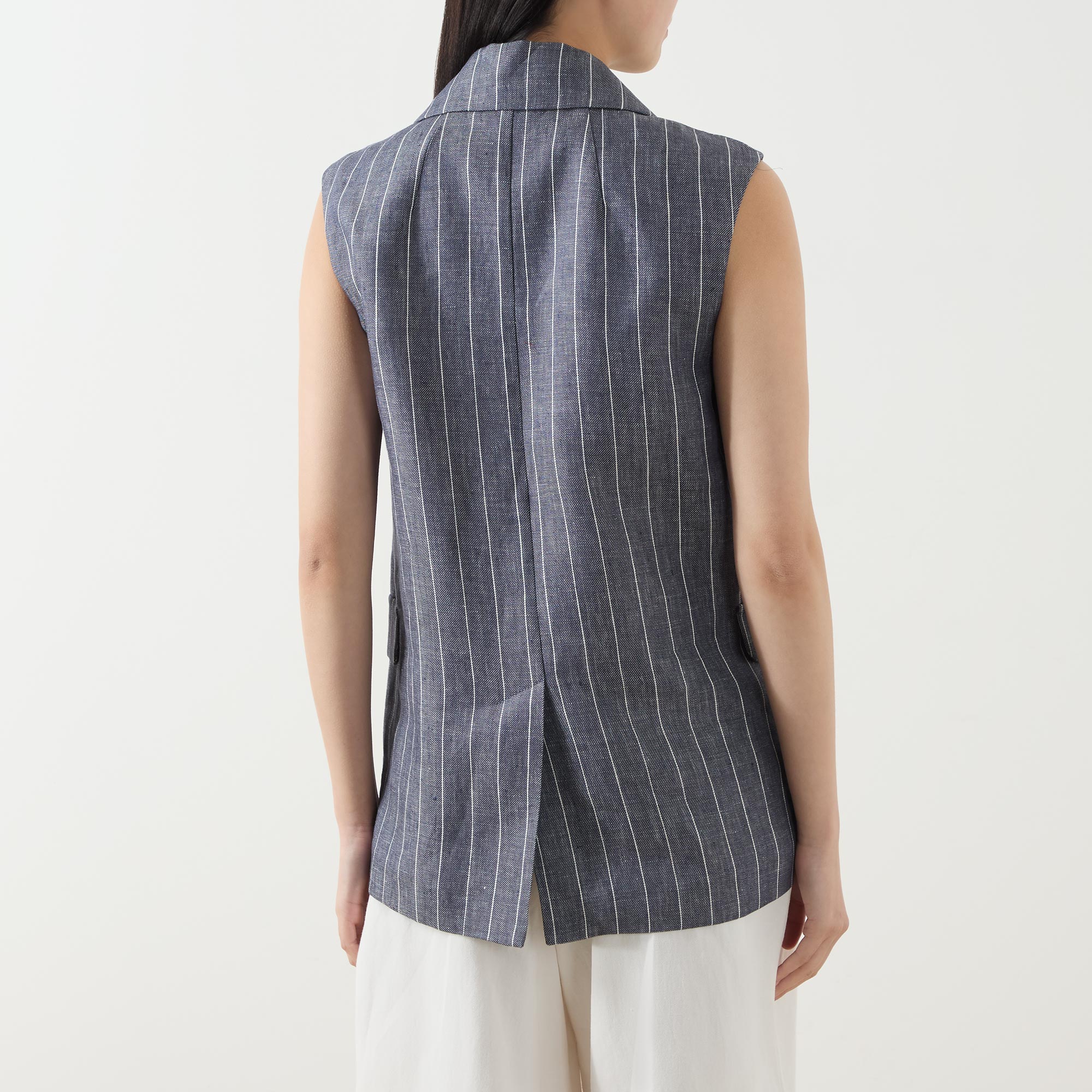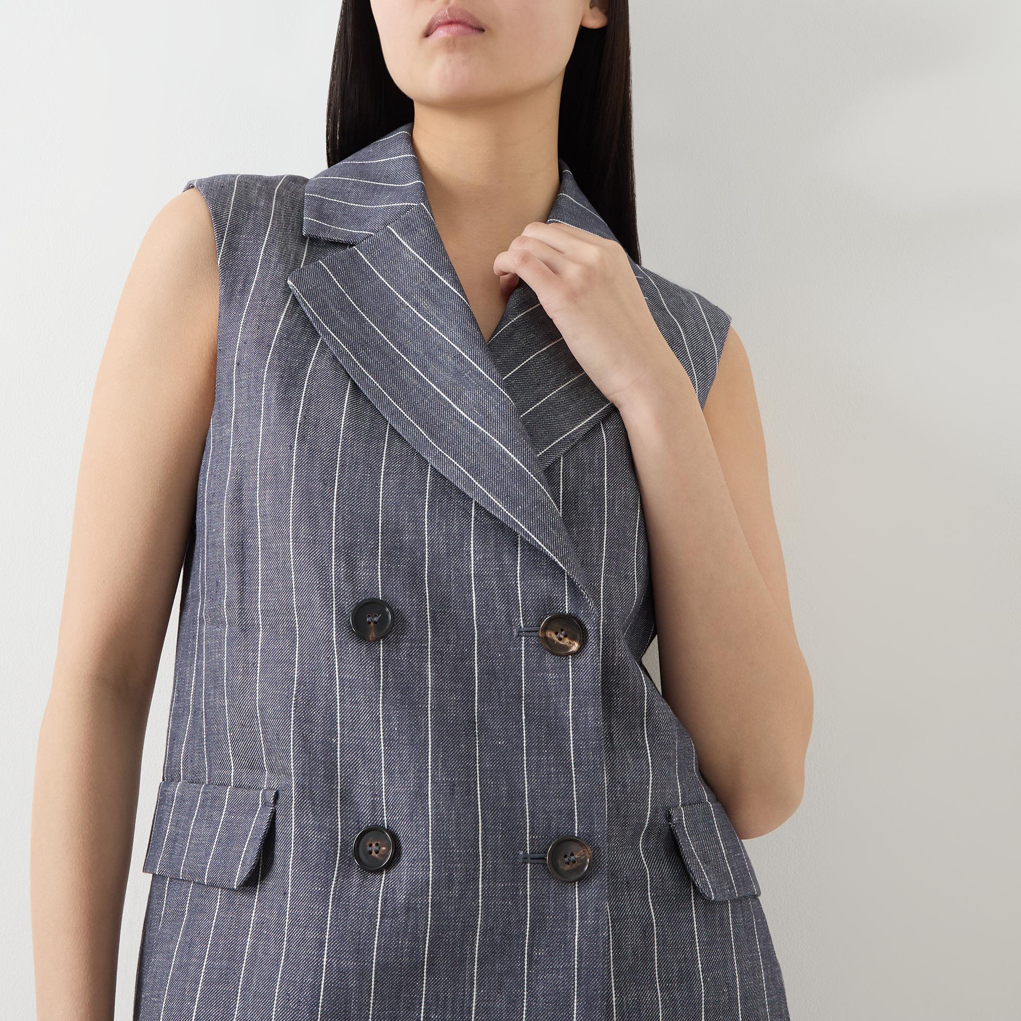 - Double-breasted, button fastening, sleeveless, flap pockets, pinstripe pattern, vent to the rear