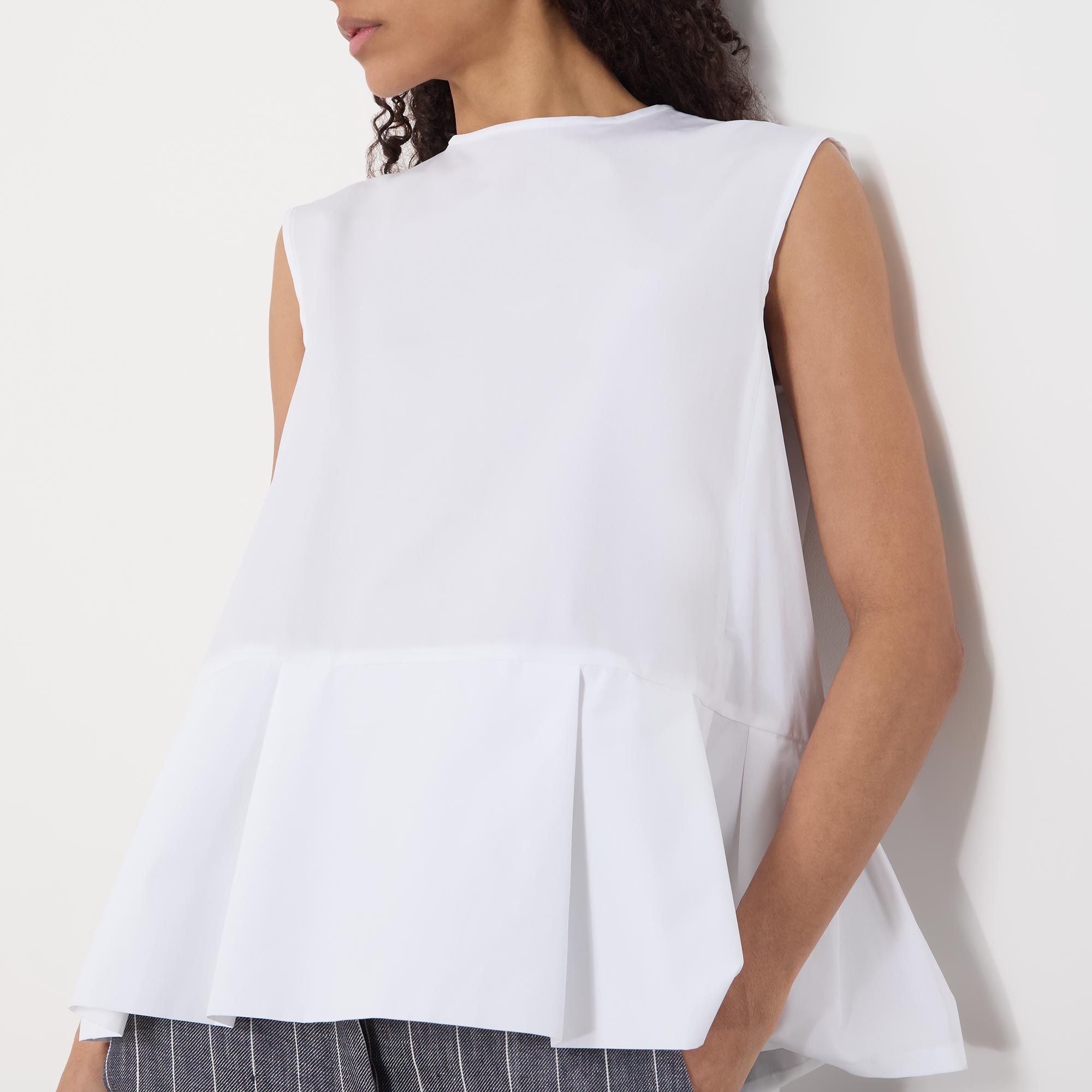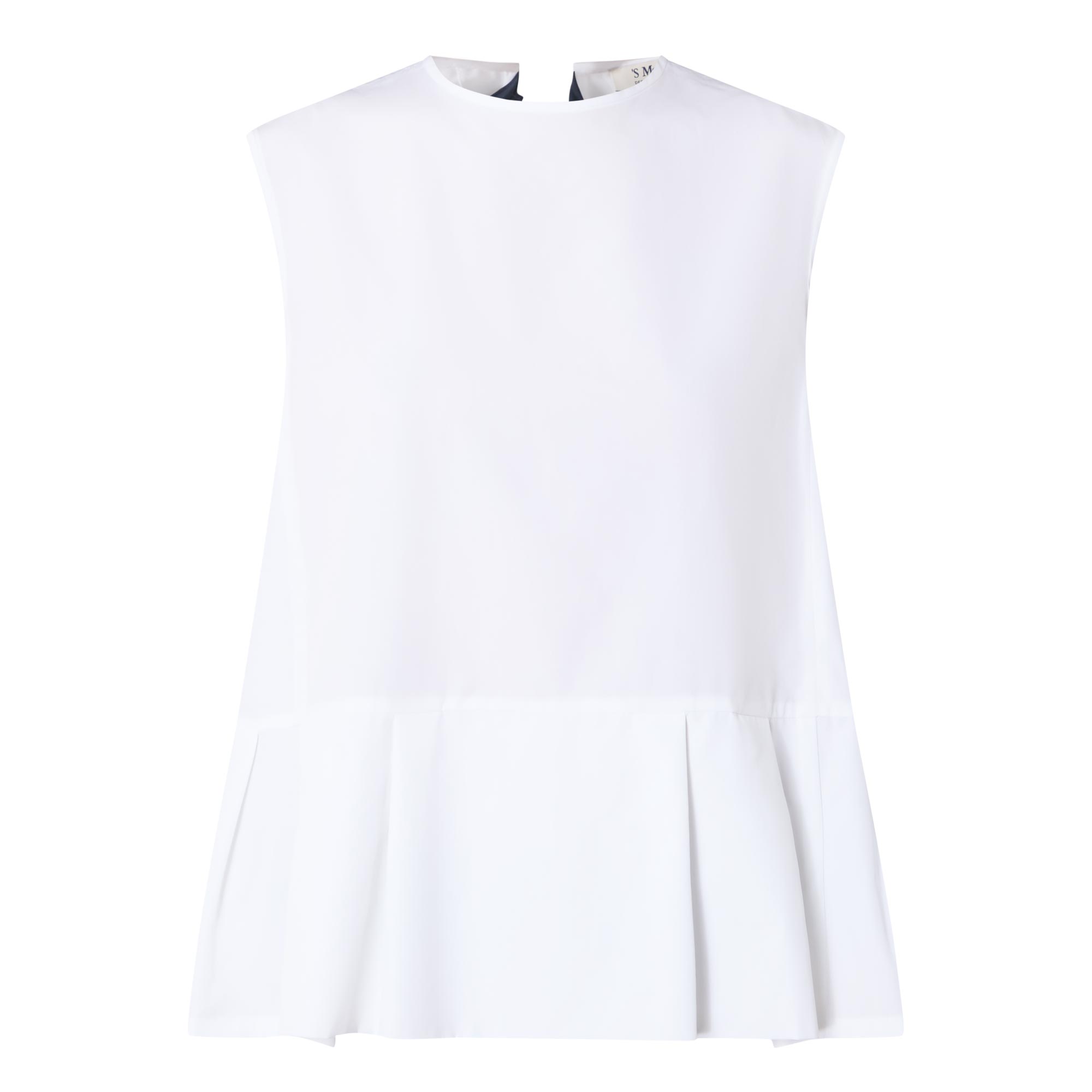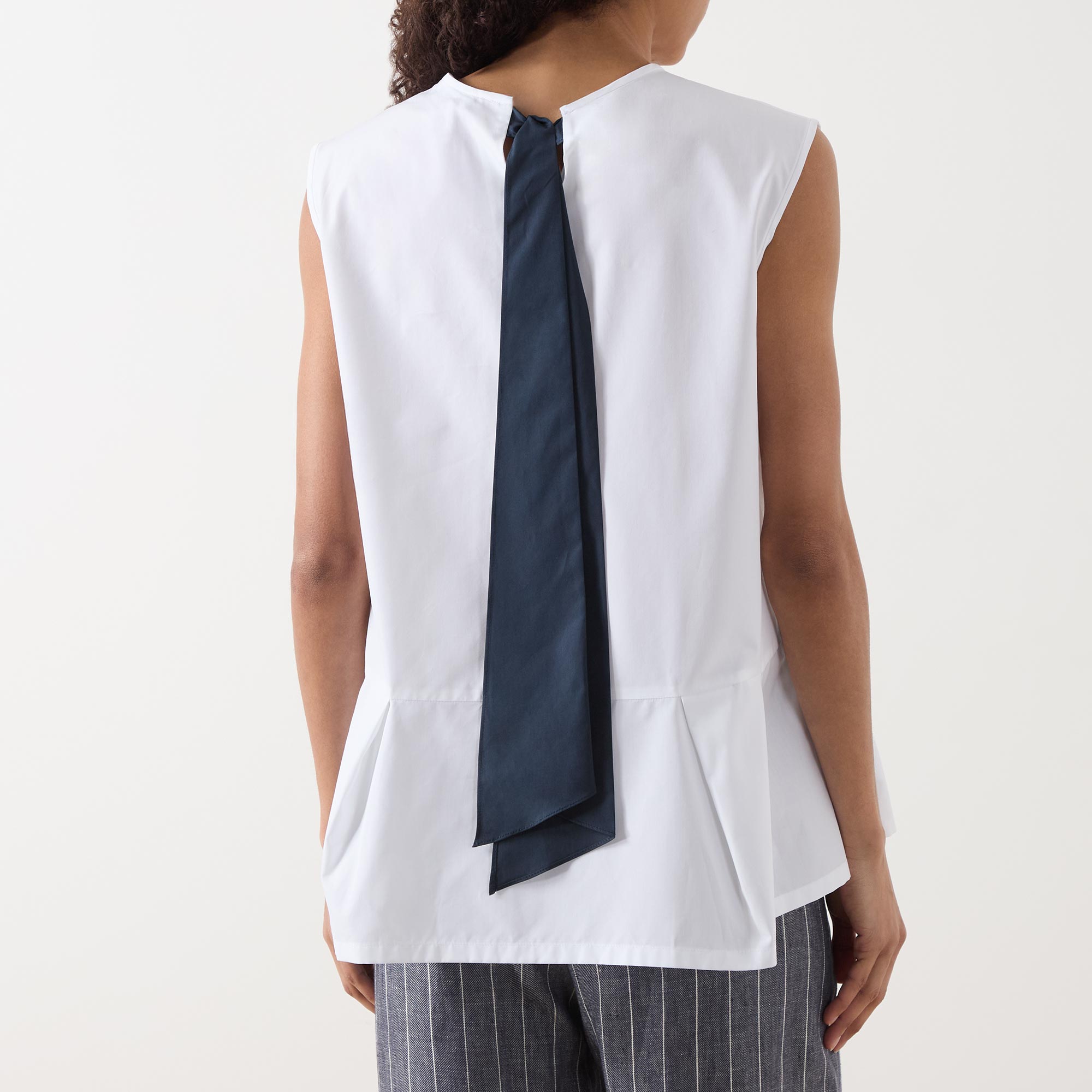 - Round neck, rear contrasting tie fastening, sleeveless design, peplum hem, rear pleating, lightweight