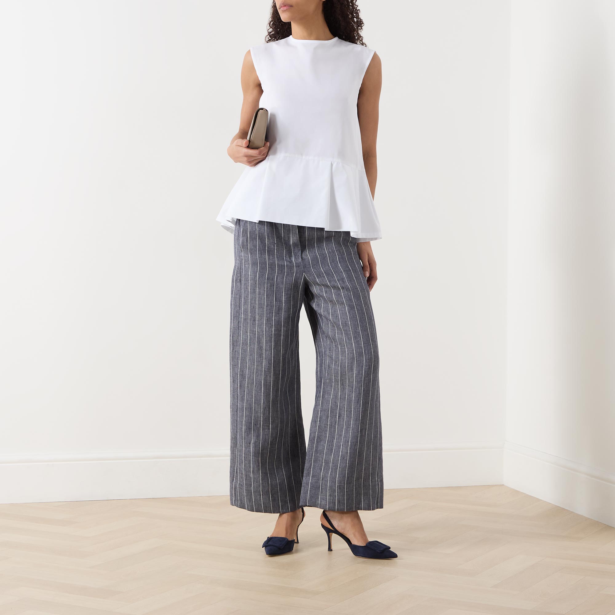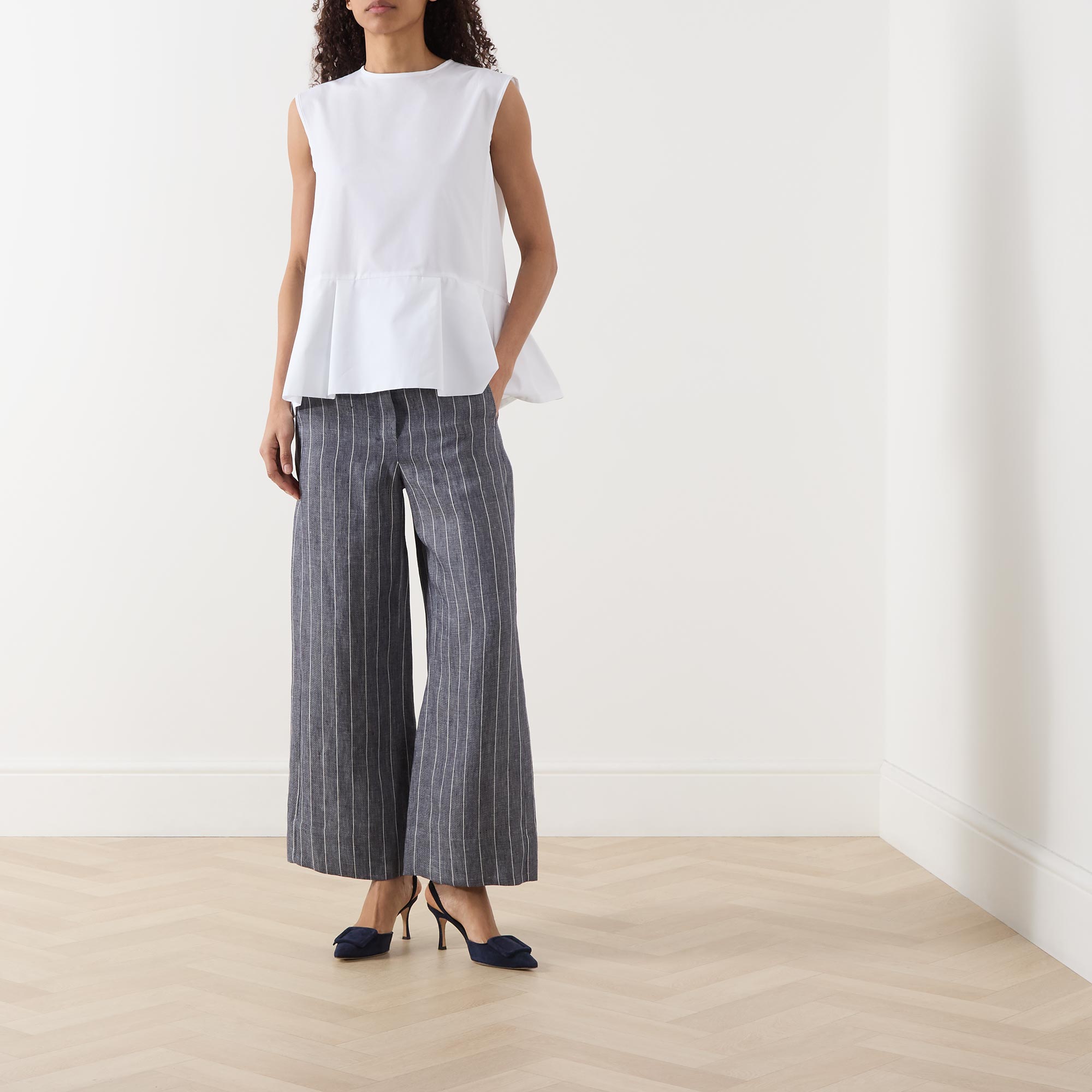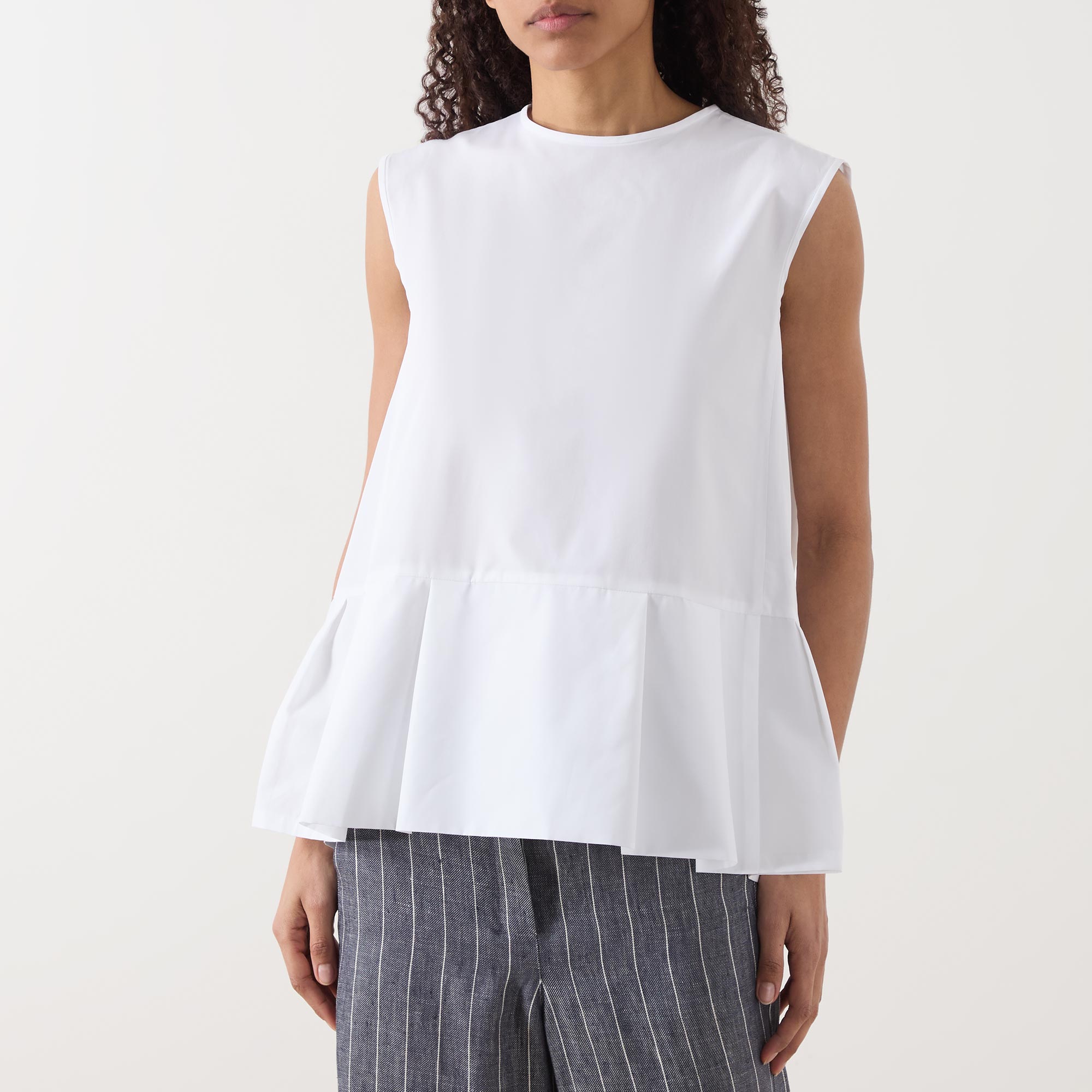 - Round neck, rear contrasting tie fastening, sleeveless design, peplum hem, rear pleating, lightweight