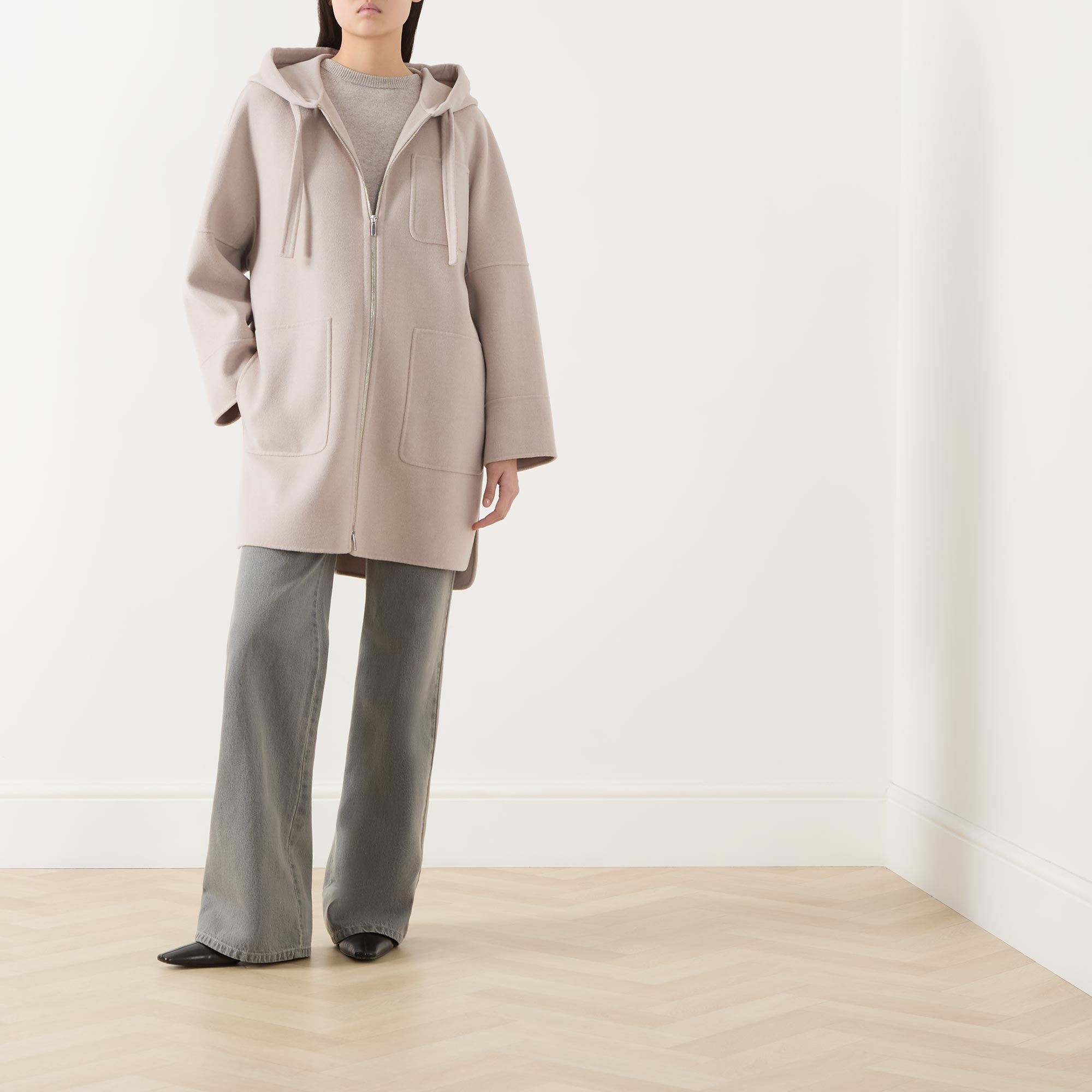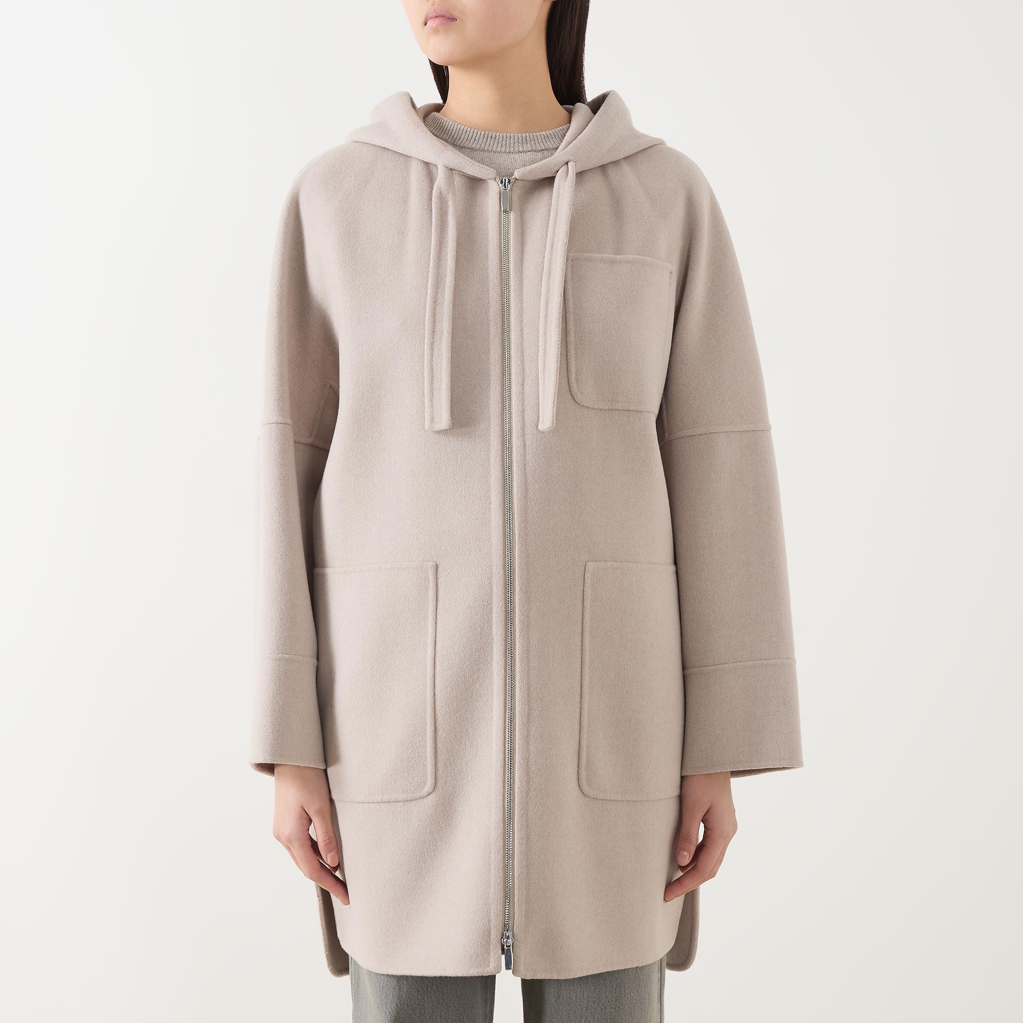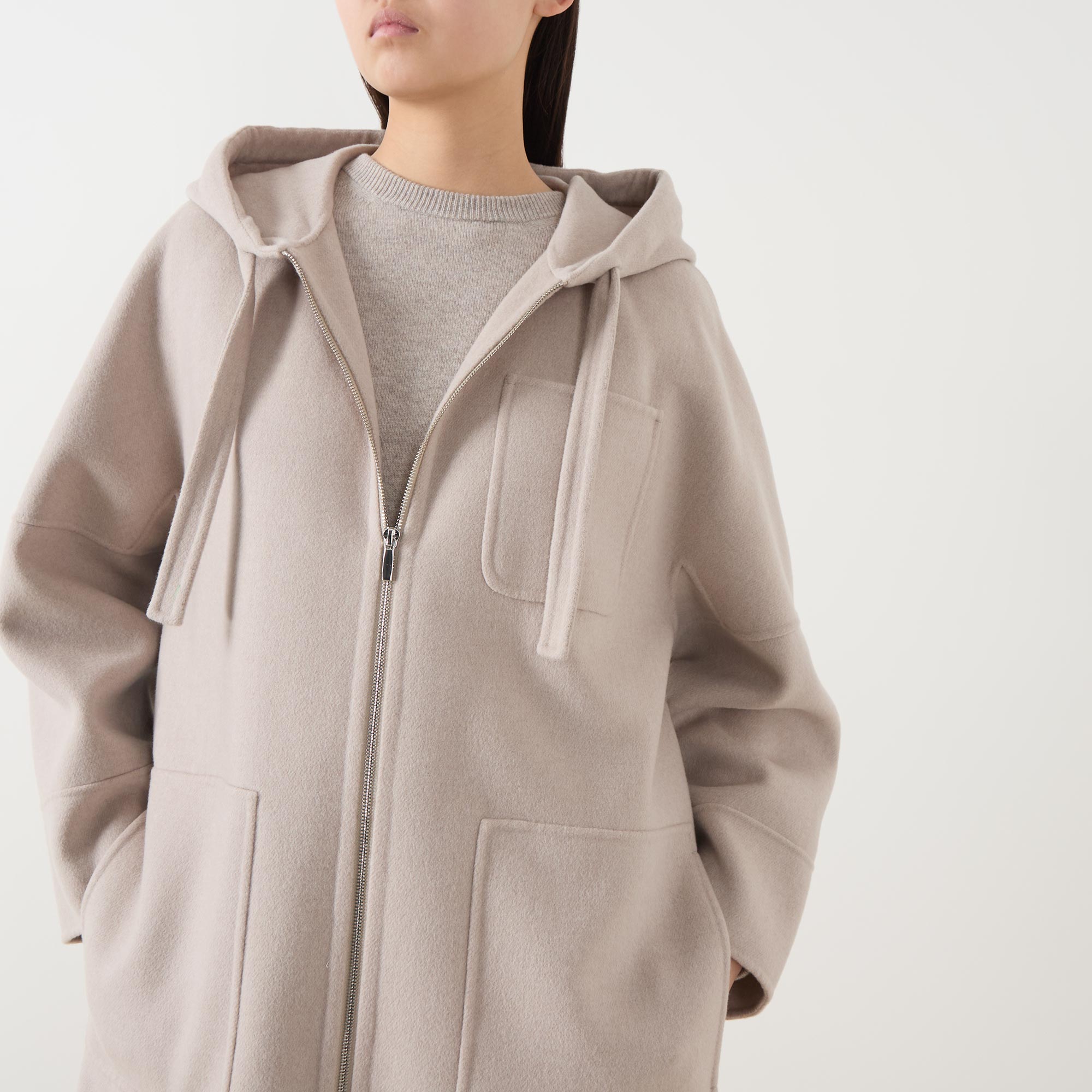 - Hood with adjustable drawstring fastening, rounded shoulders, long sleeves, front zip fastening, one chest and two front patch pockets, curved hem, side slit detailing, bound trims, longline design, soft finish