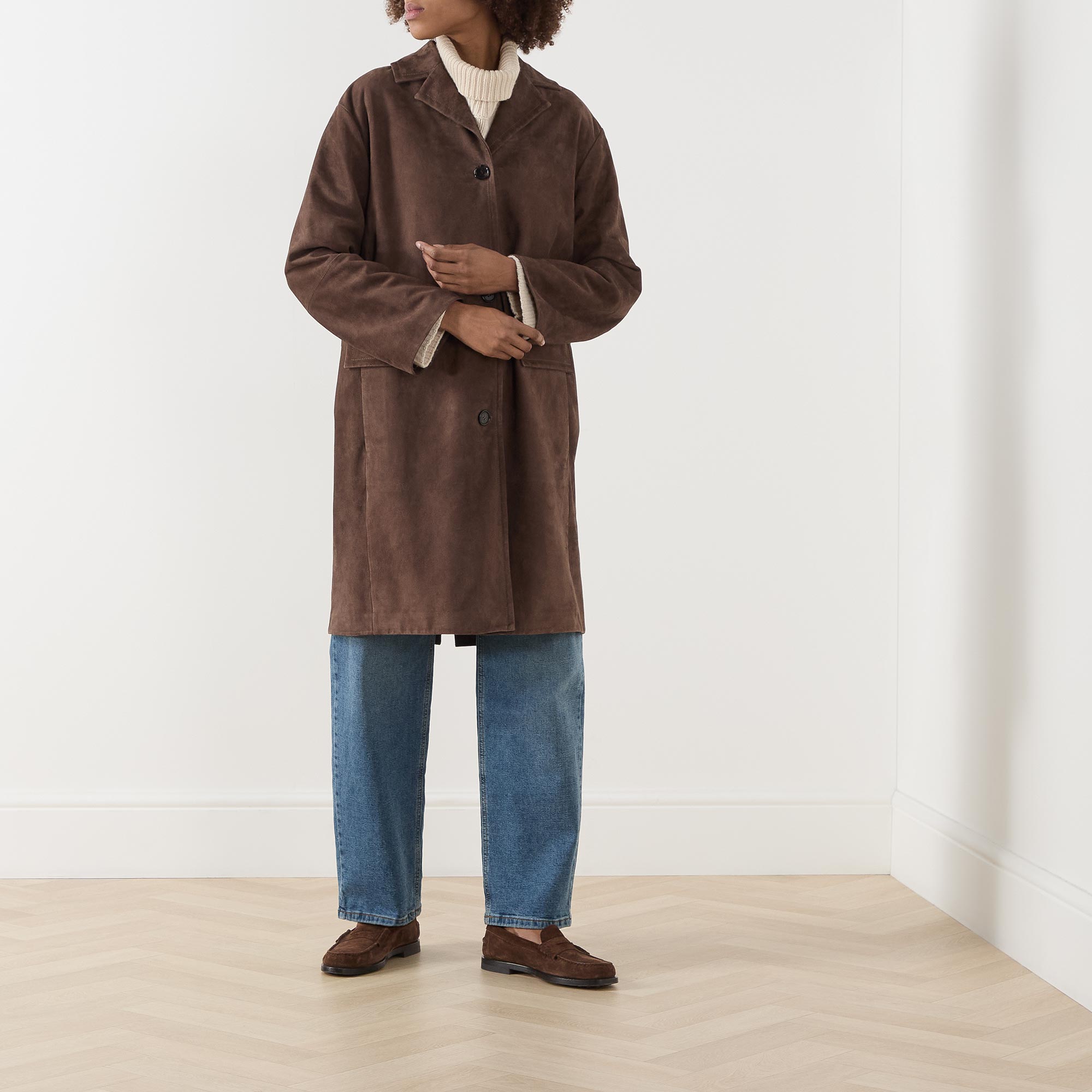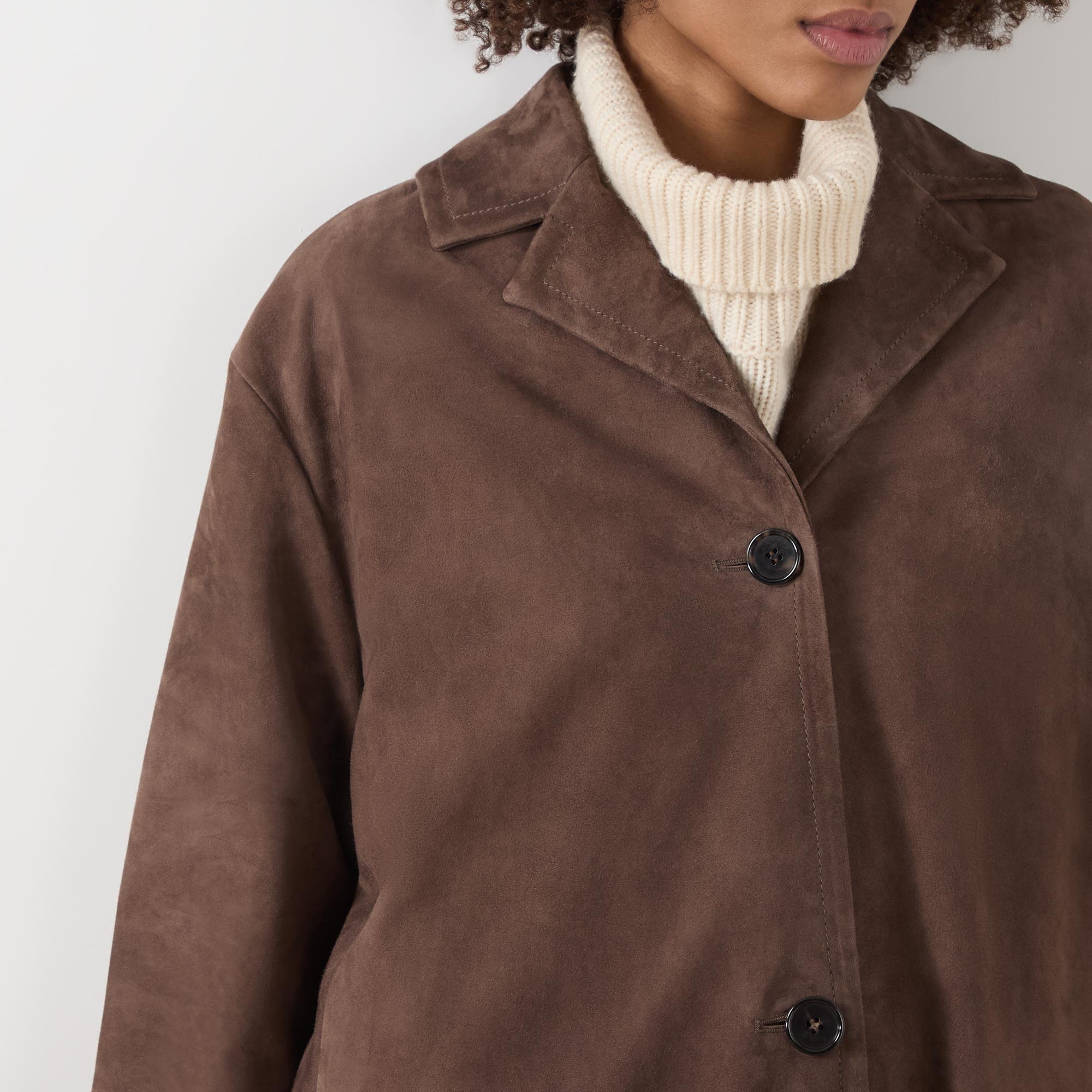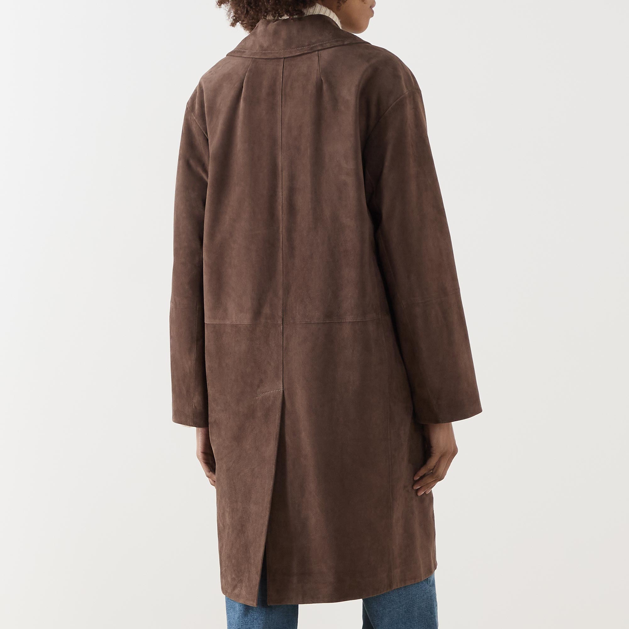 - Notched-lapel collar, long sleeves, dropped shoulders, button fastening, two side flap pockets, rear slit, smooth suede leather finish