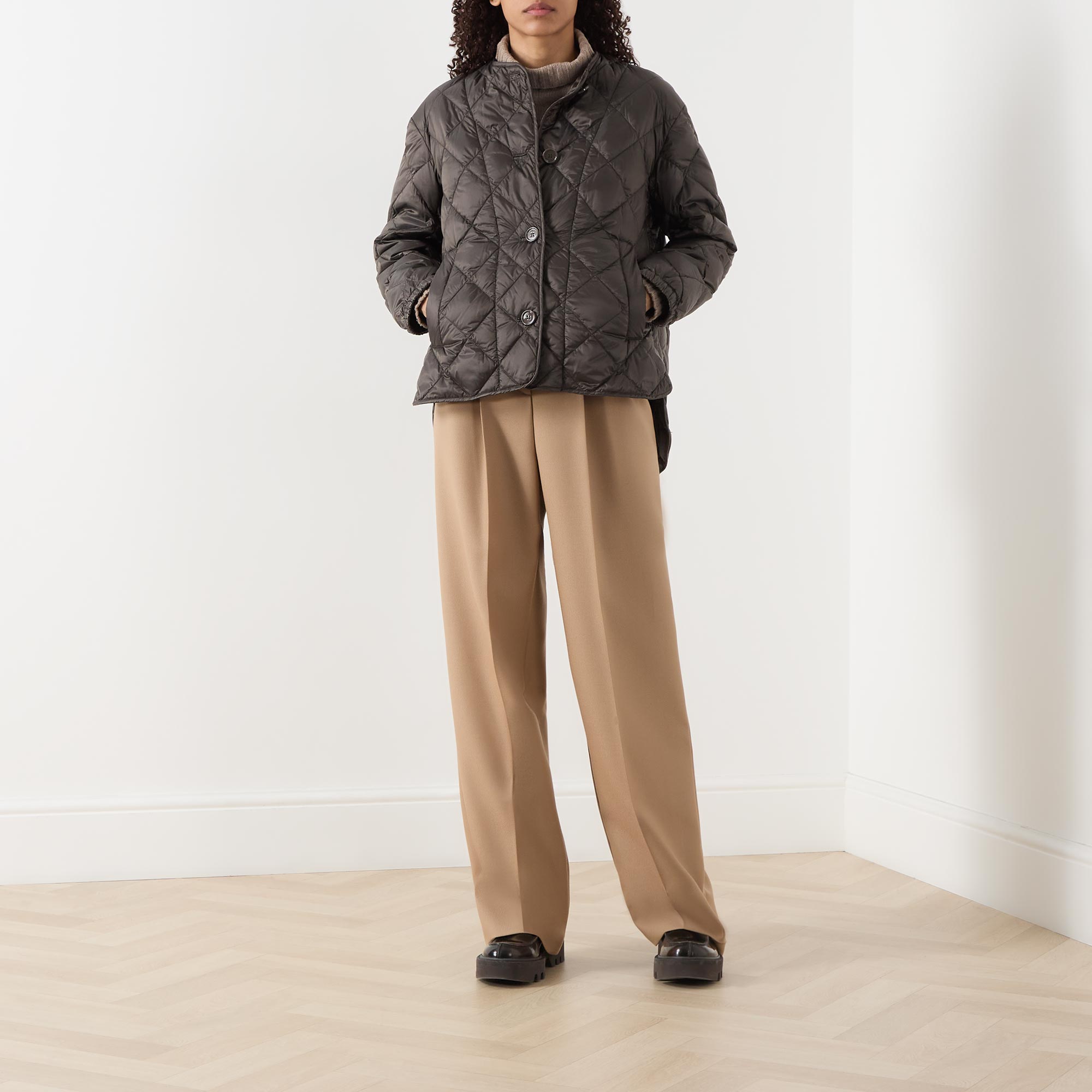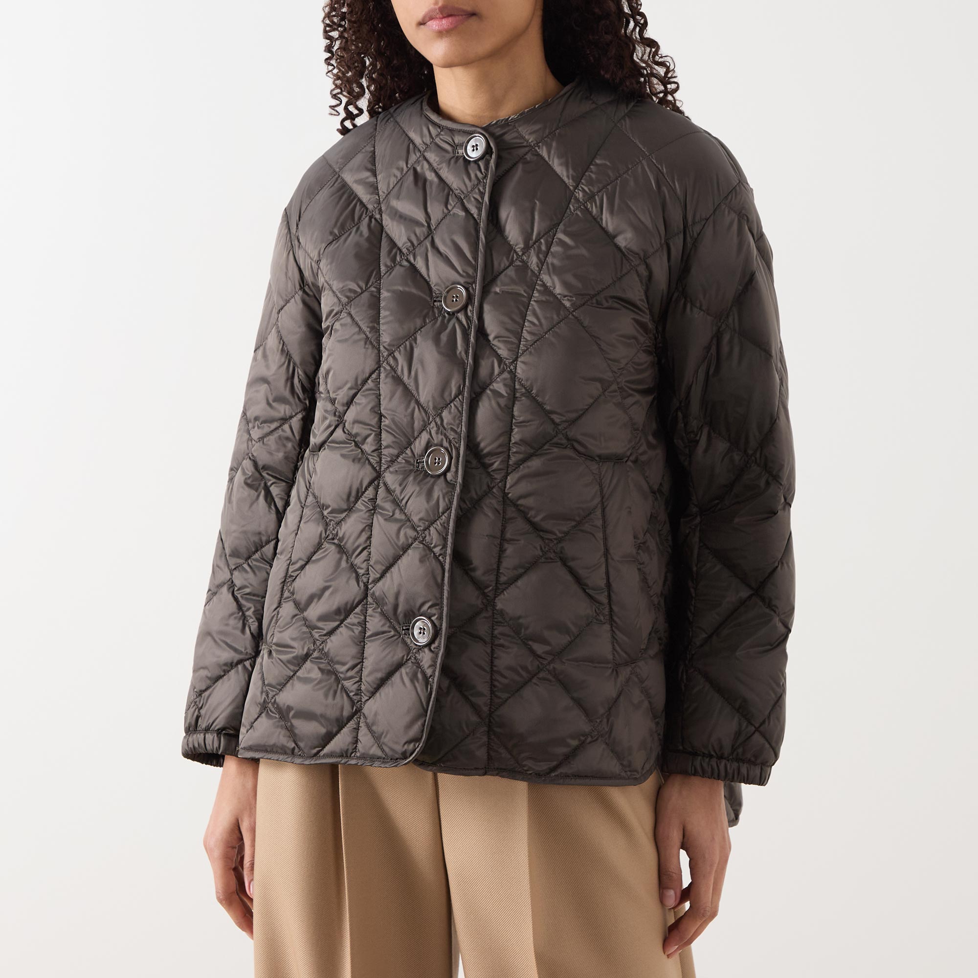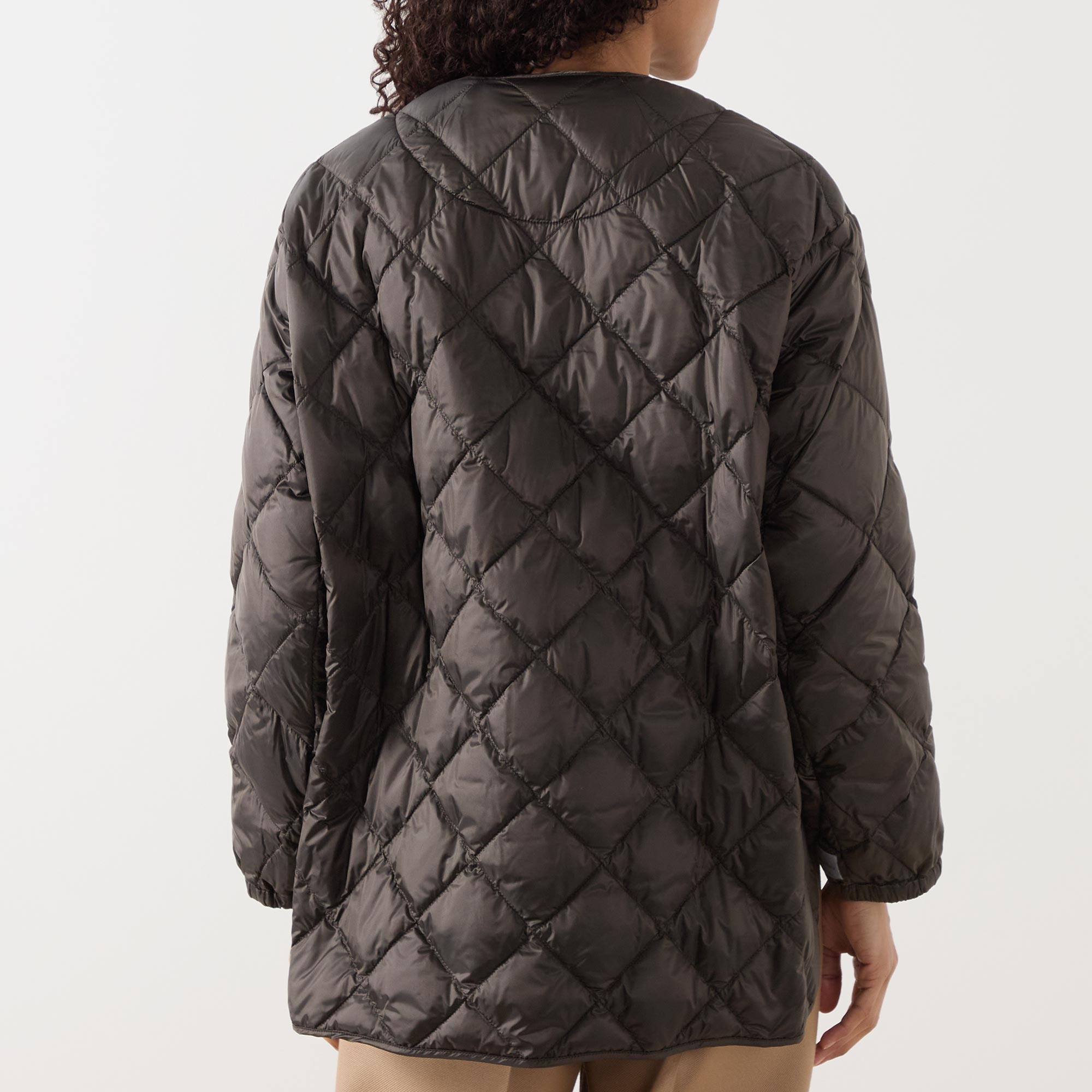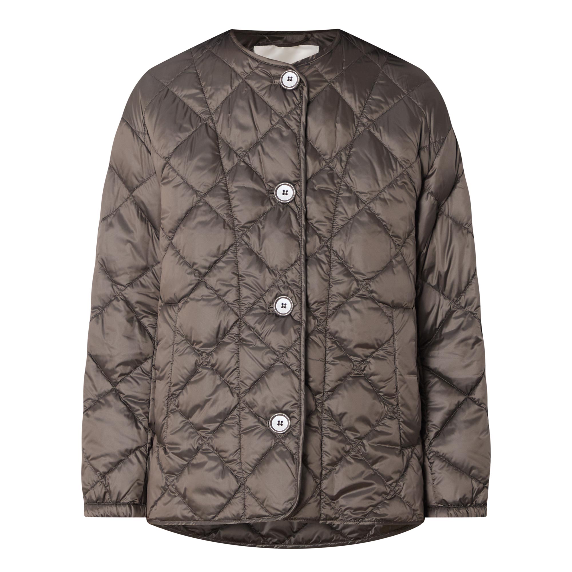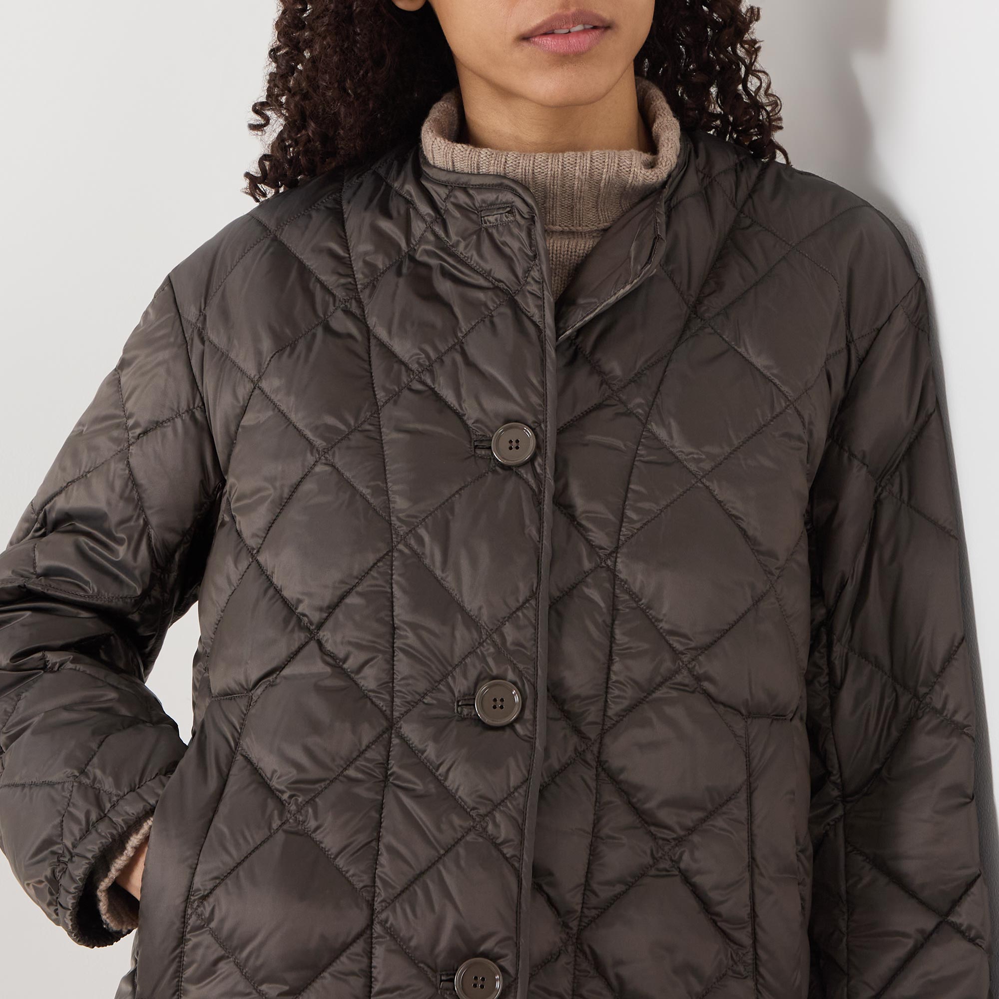 - Round neckline, button fastening, long sleeves, elasticated cuffs, dropped hemline, diamond quilted, side entry pockets