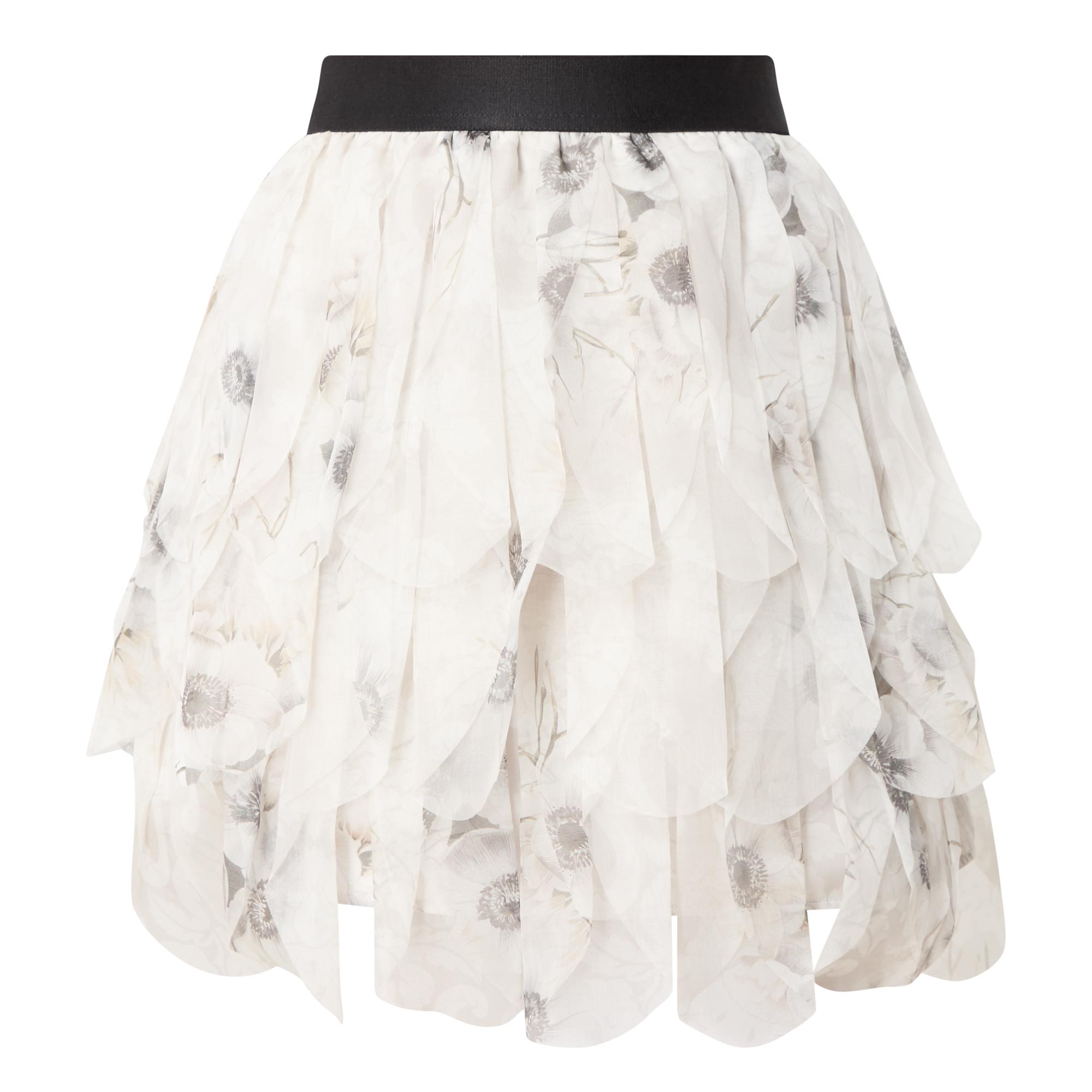 - Mini length, tiered ruffles, elasticated waistband, artistic print