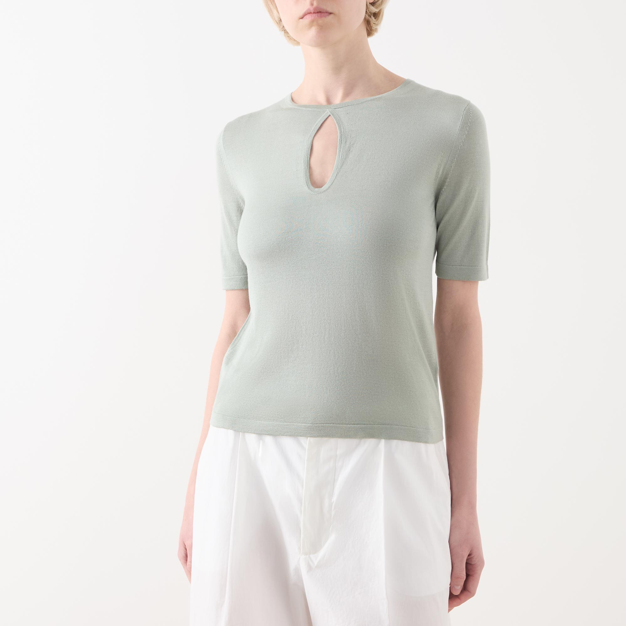 - Round neckline, keyhole cut-out detail, stockinette stitch structure, short sleeves, straight hemline, logo detail