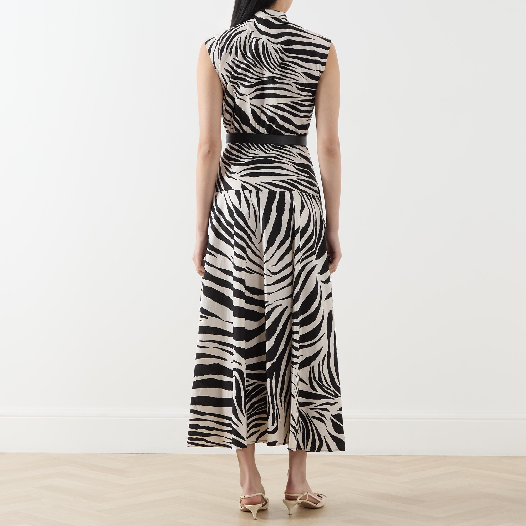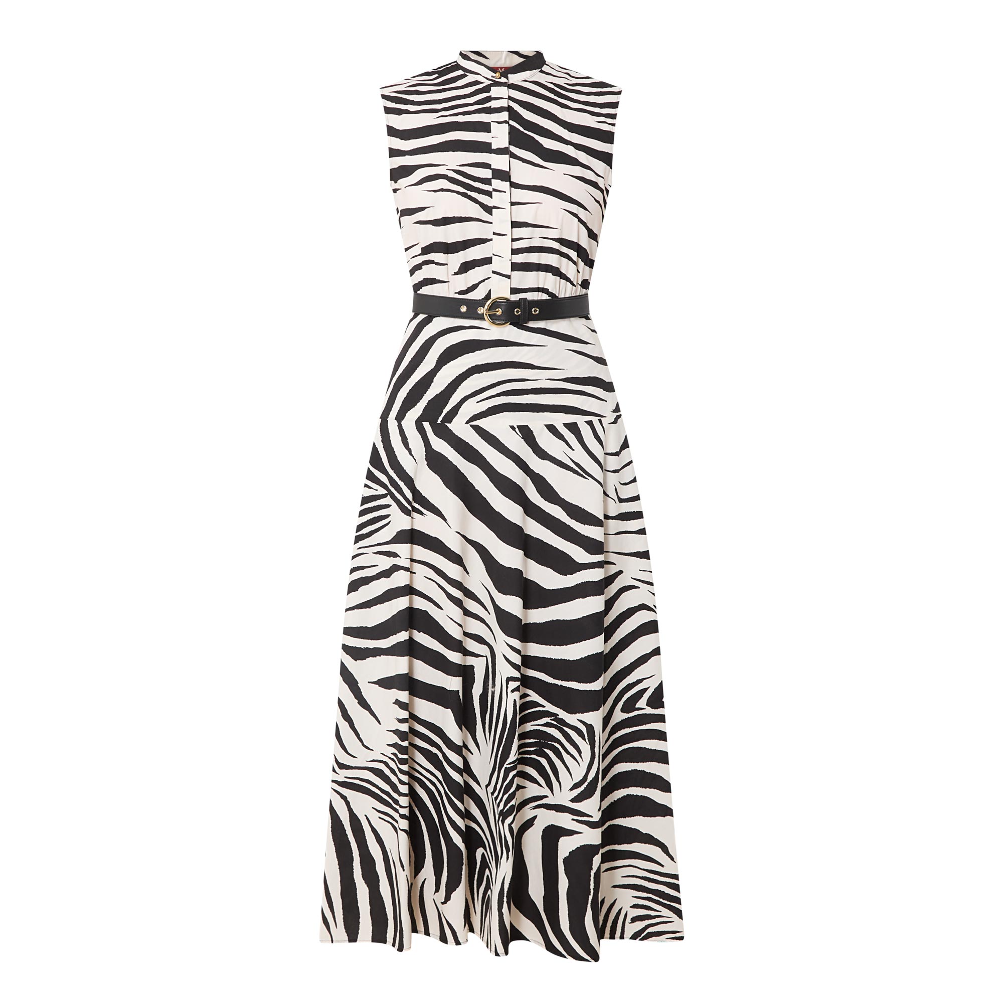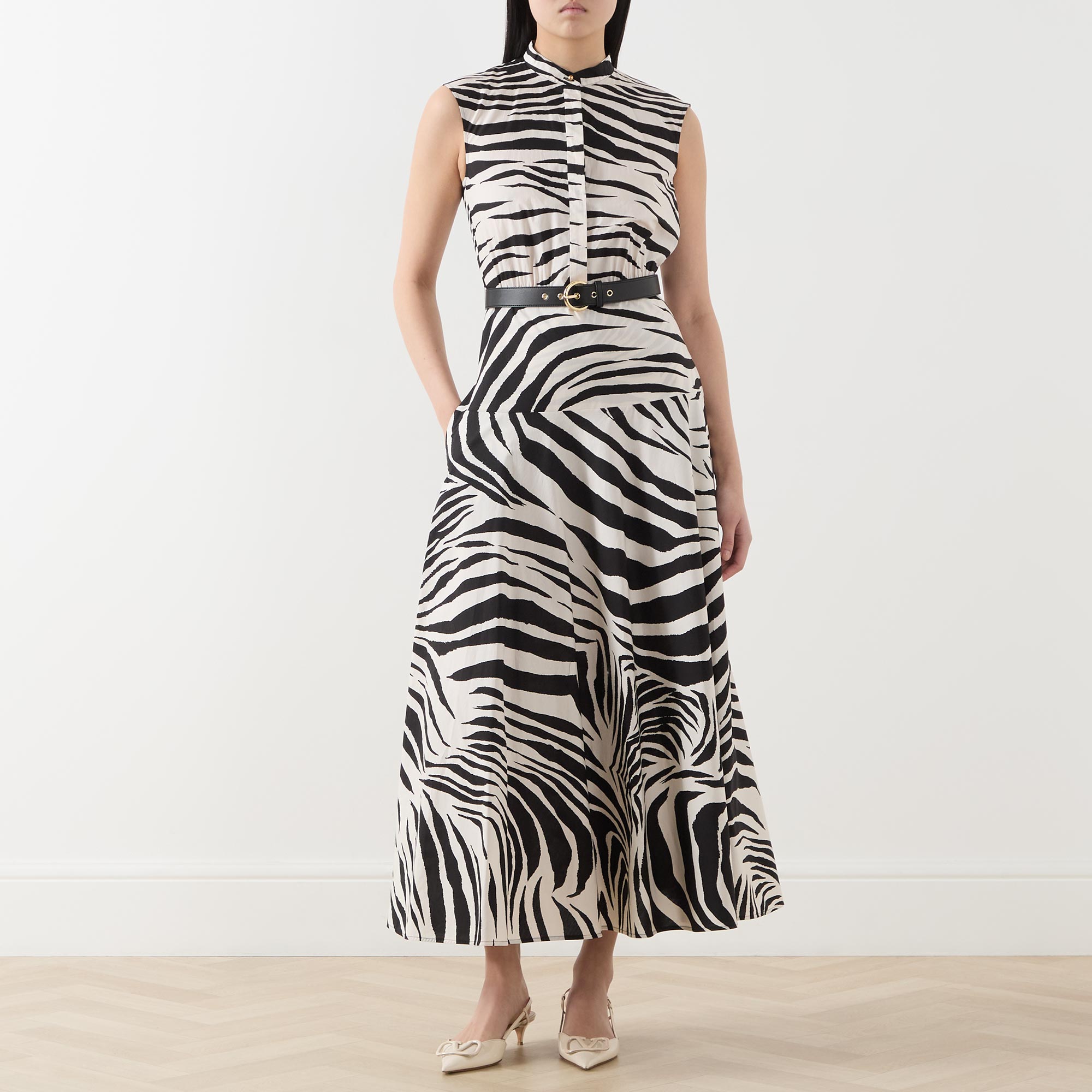 - Standing collar, sleeveless, midi length, pleated skirt, concealed half-button fastening, zebra print, adjustable belt at waist, side entry pockets