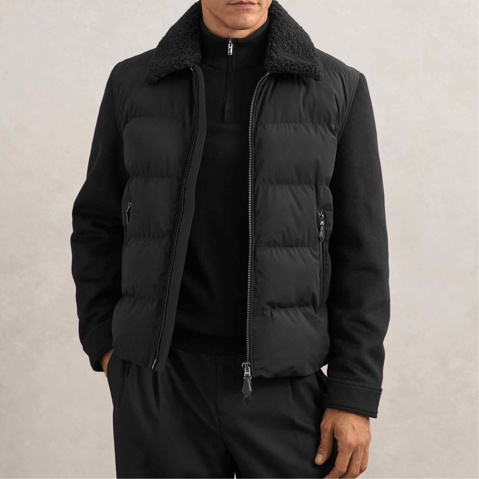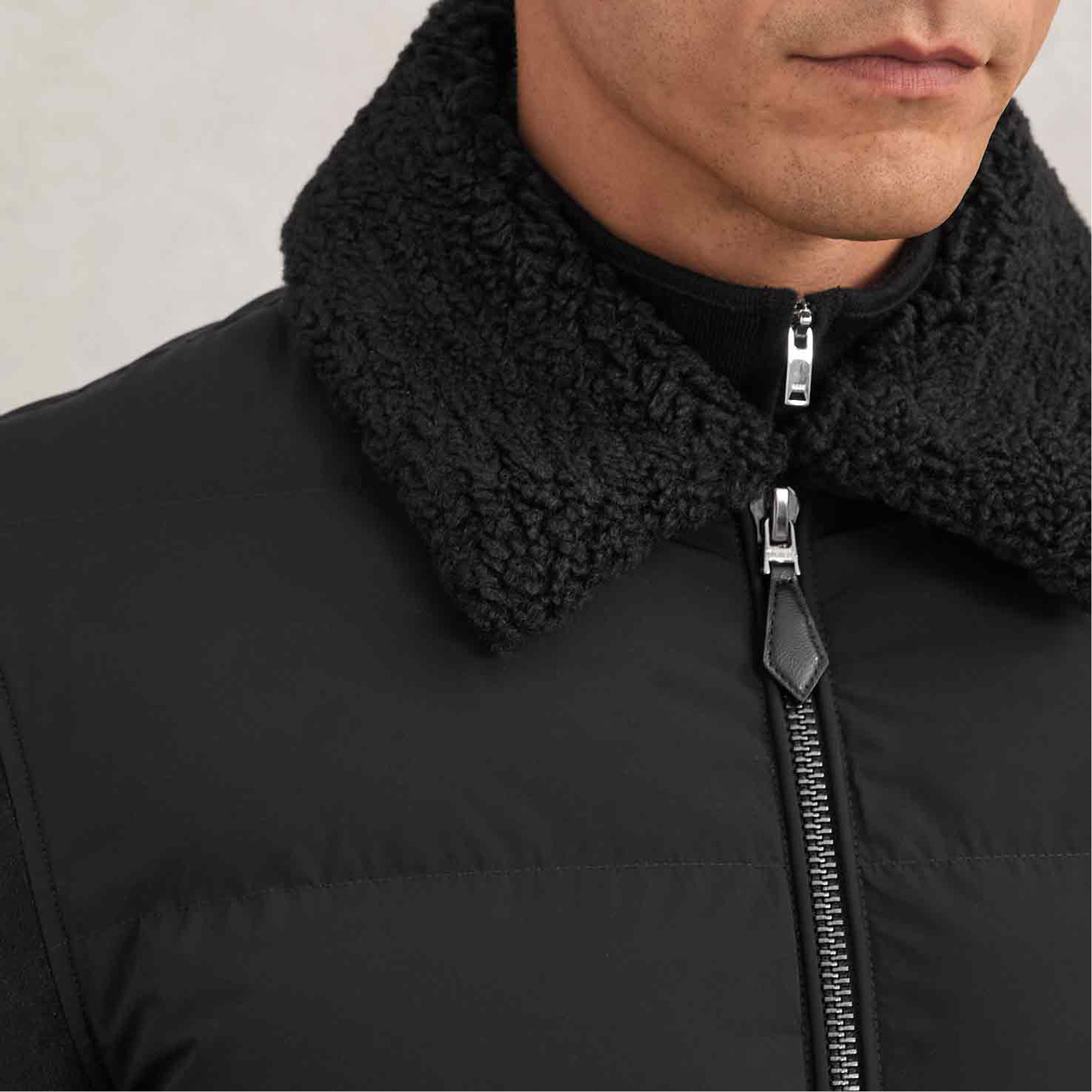 - Faux-shearling collar, dual front zip, side zip, front zip, button cuffs, zip pockets, quilted body, quilted, leather zip pulls, faux-shearling, padded