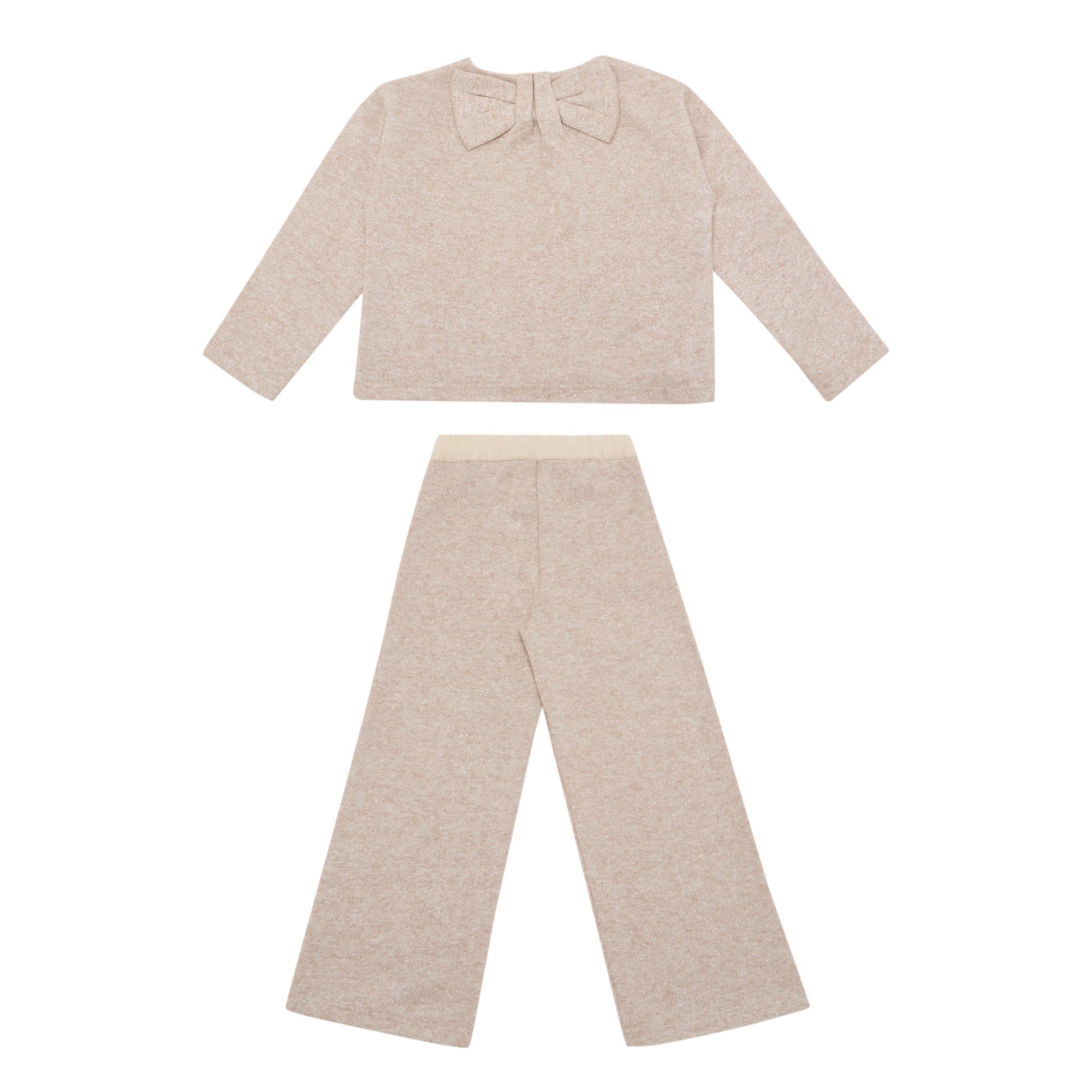 - Top: Long sleeves, round neckline, dropped shoulders, back bow detail, fine-knit finish. Bottoms: Elasticated drawstring waistband, two side in-seam pockets, wide-cut leg, fine-knit finish