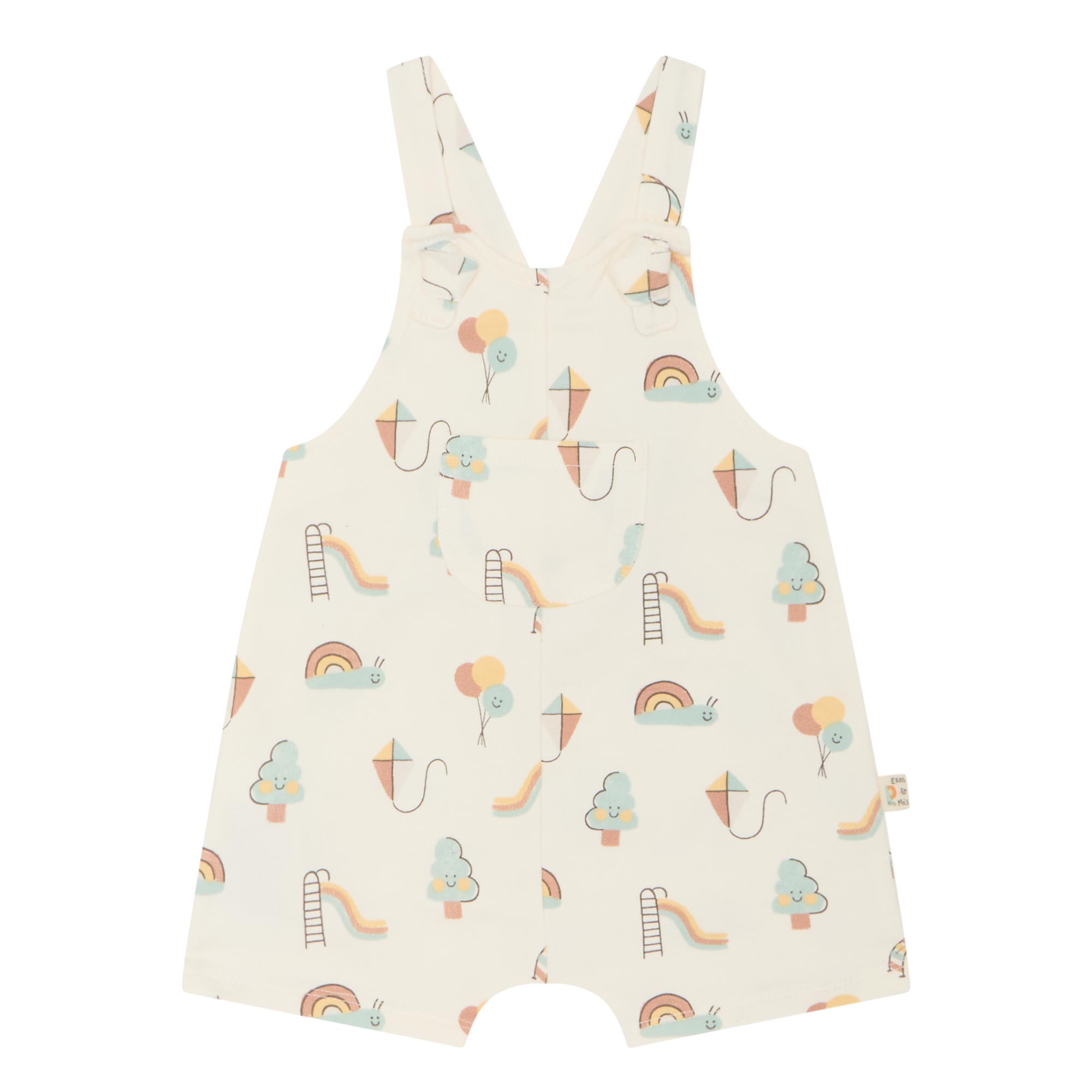• Crossover straps with button fastening to the back, short legs, front pocket, park themed print with kites, slides, snails and trees