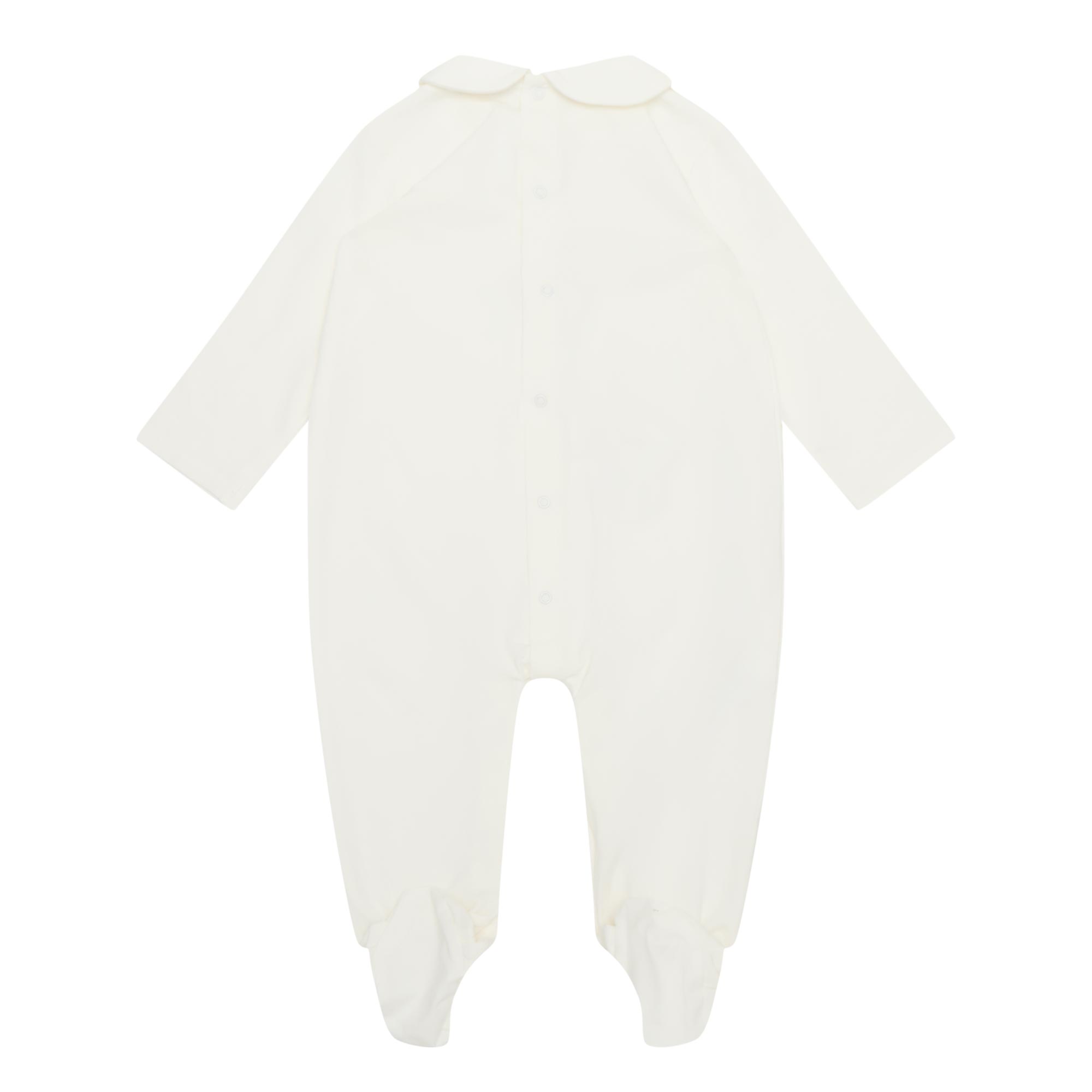 - Peter Pan collar, long sleeves, rear snap button fastening, snap button legs, enclosed feet, Teddy Bear embroidered detailing, super-soft finish