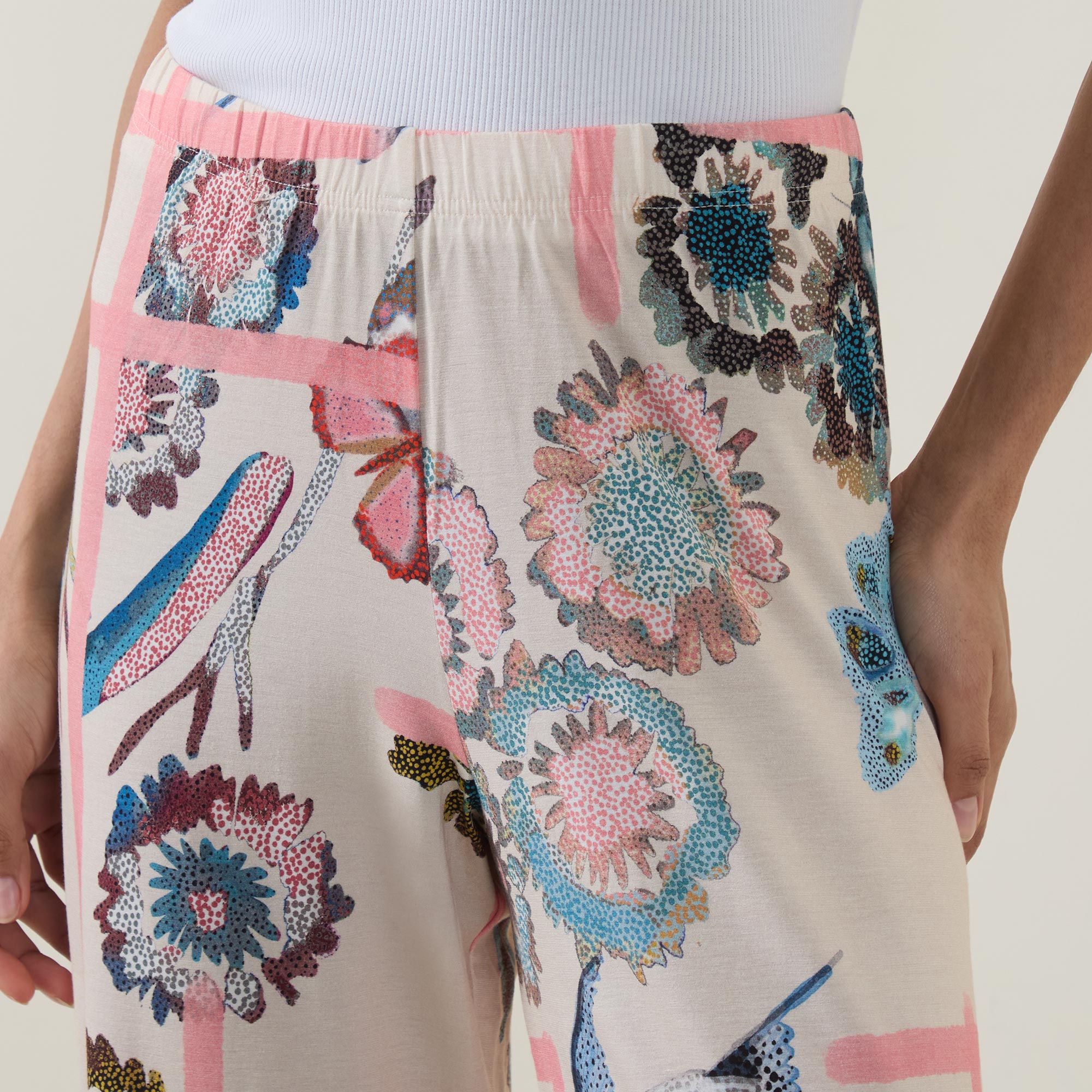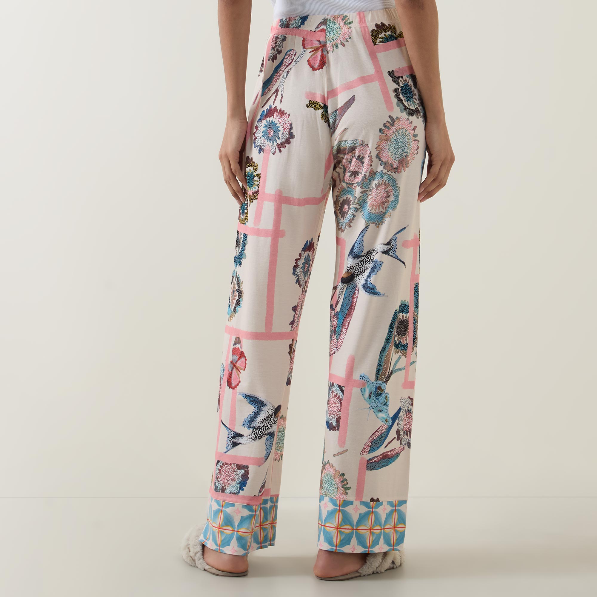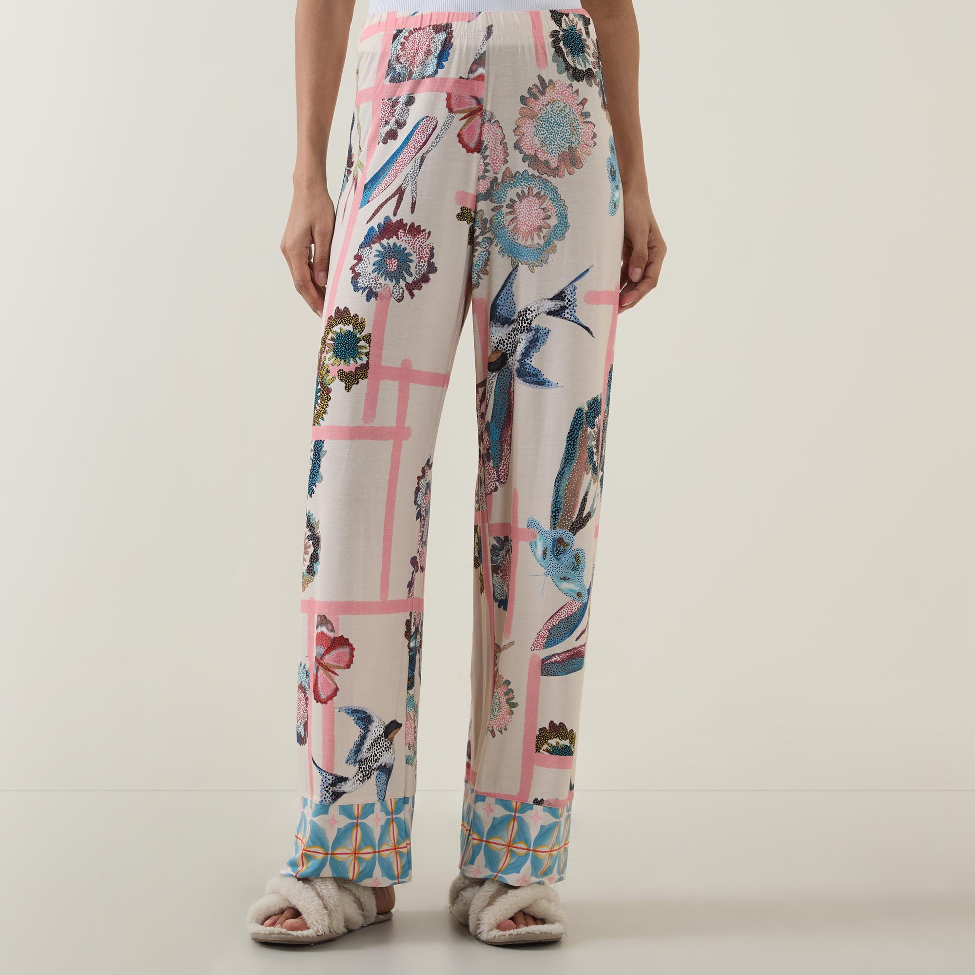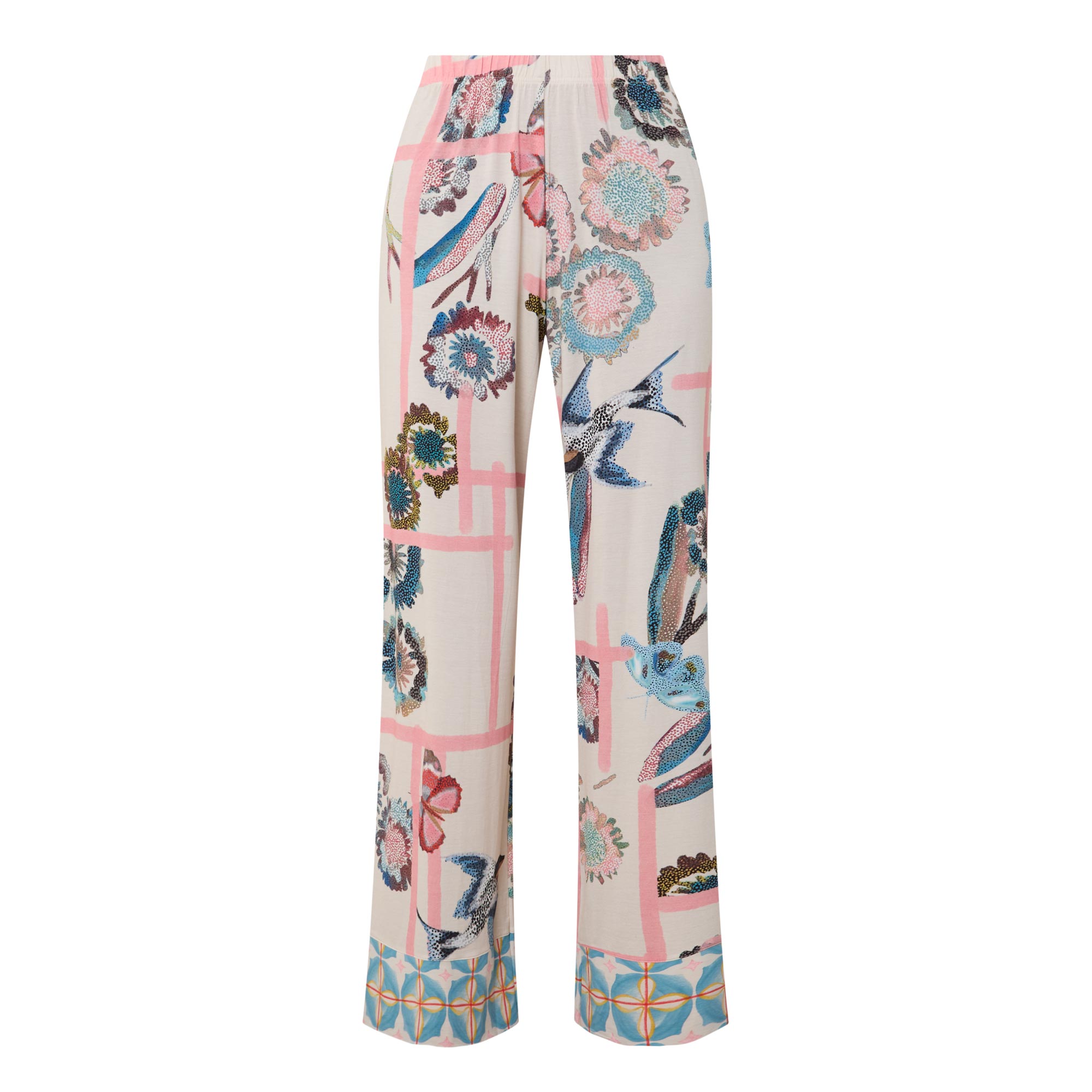• Mid rise, straight leg, full length, elasticated waistband, clean hems, Fragmented Garden pattern, smooth finish