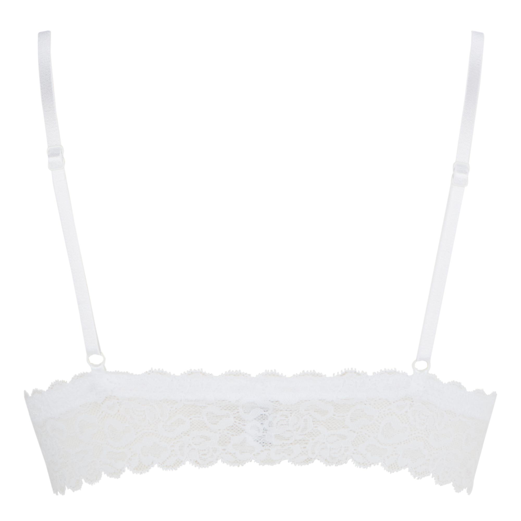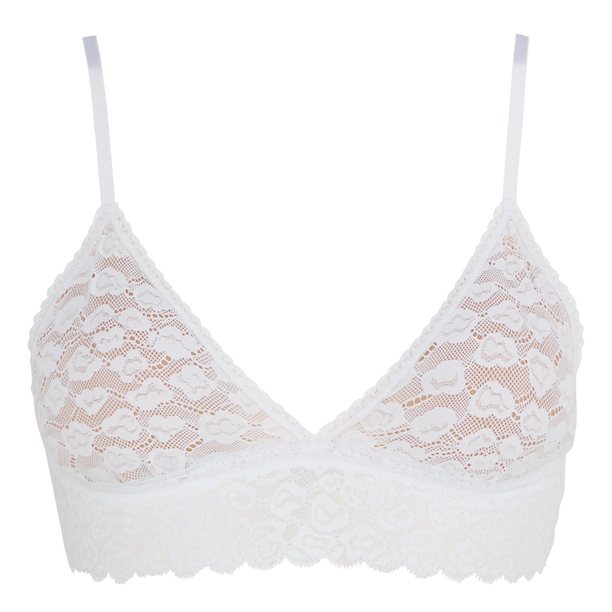 - Wireless, triangle cups, removable padding, adjustable straps, all-over lace, stretch underband