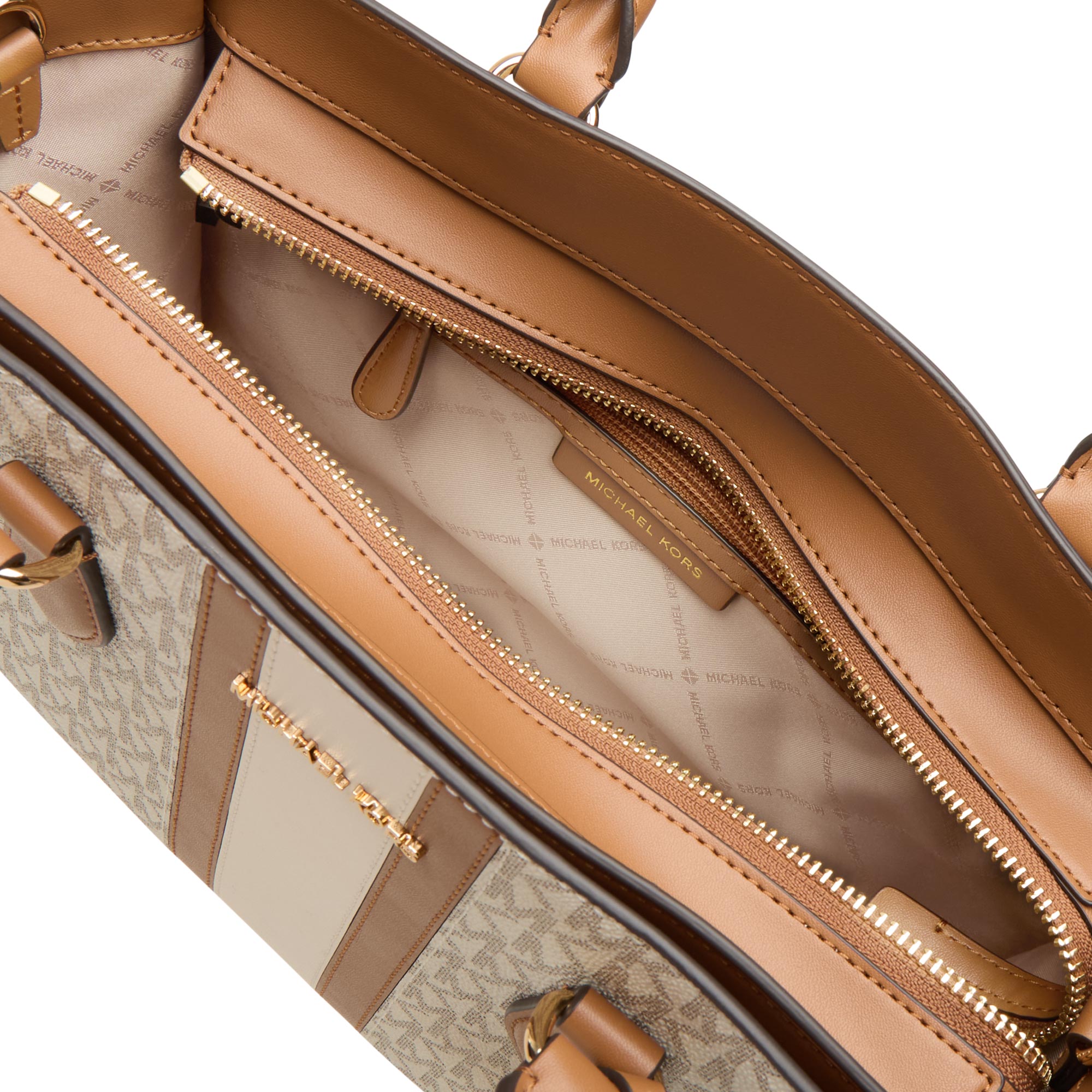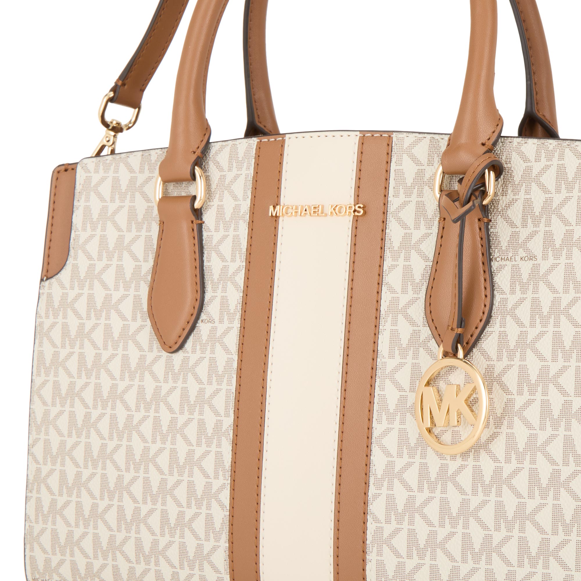 - Top handles, top zip fastening, detachable and adjustable strap, removable logo tag, logo lettering, gold-tone hardware, structured silhouette, monogram logo print, colour-blocked stripe detailing, textured finish