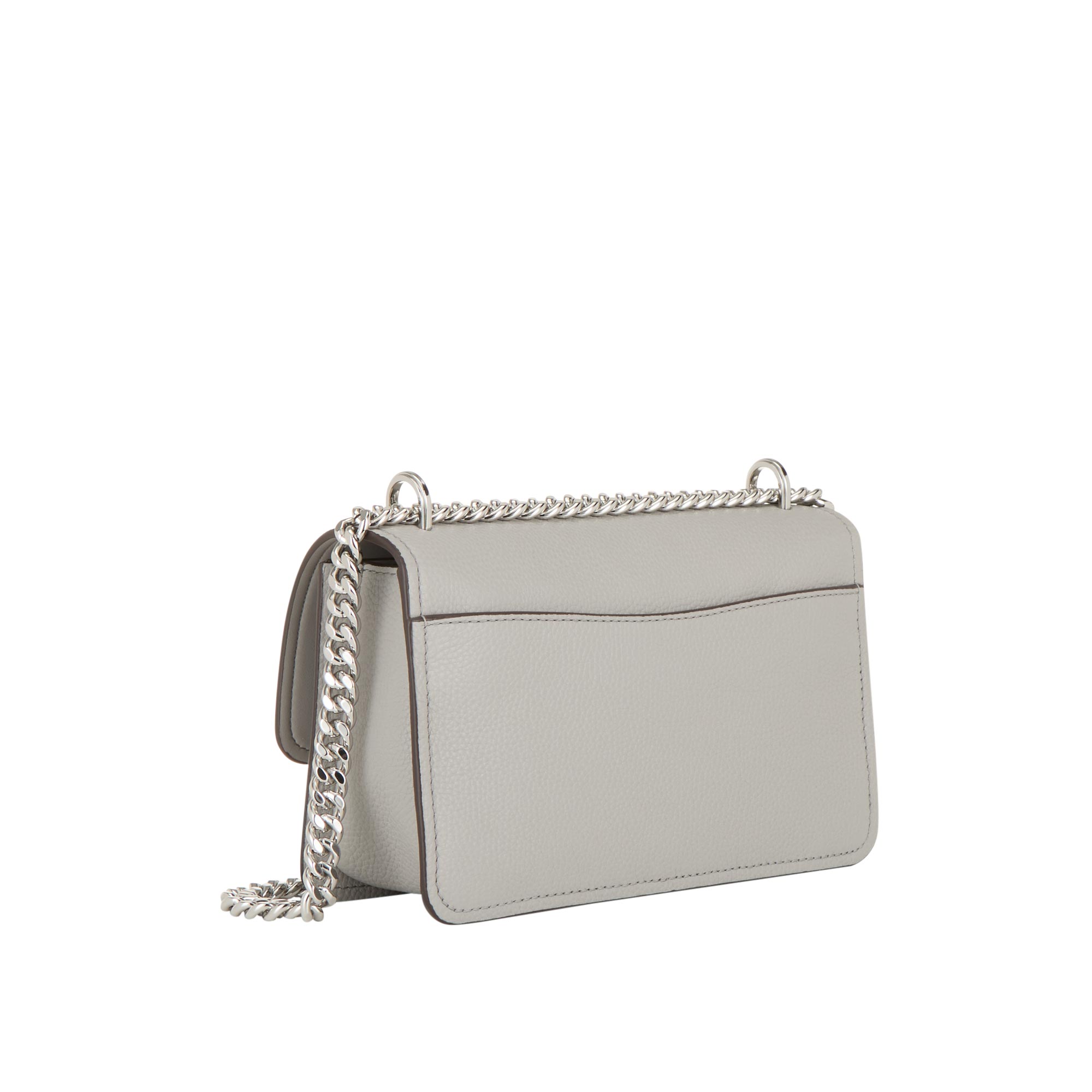 - Flap closure, magnetic fastening, silver-tone hardware, chain strap, logo lettering, front slip pocket, back slip pocket, grained finish