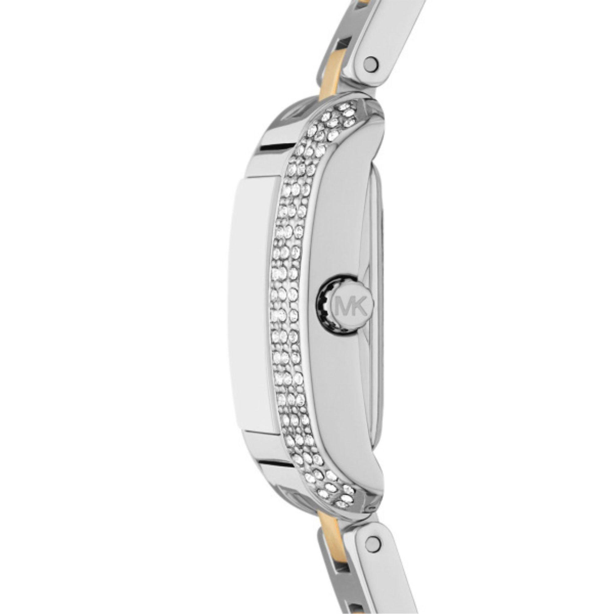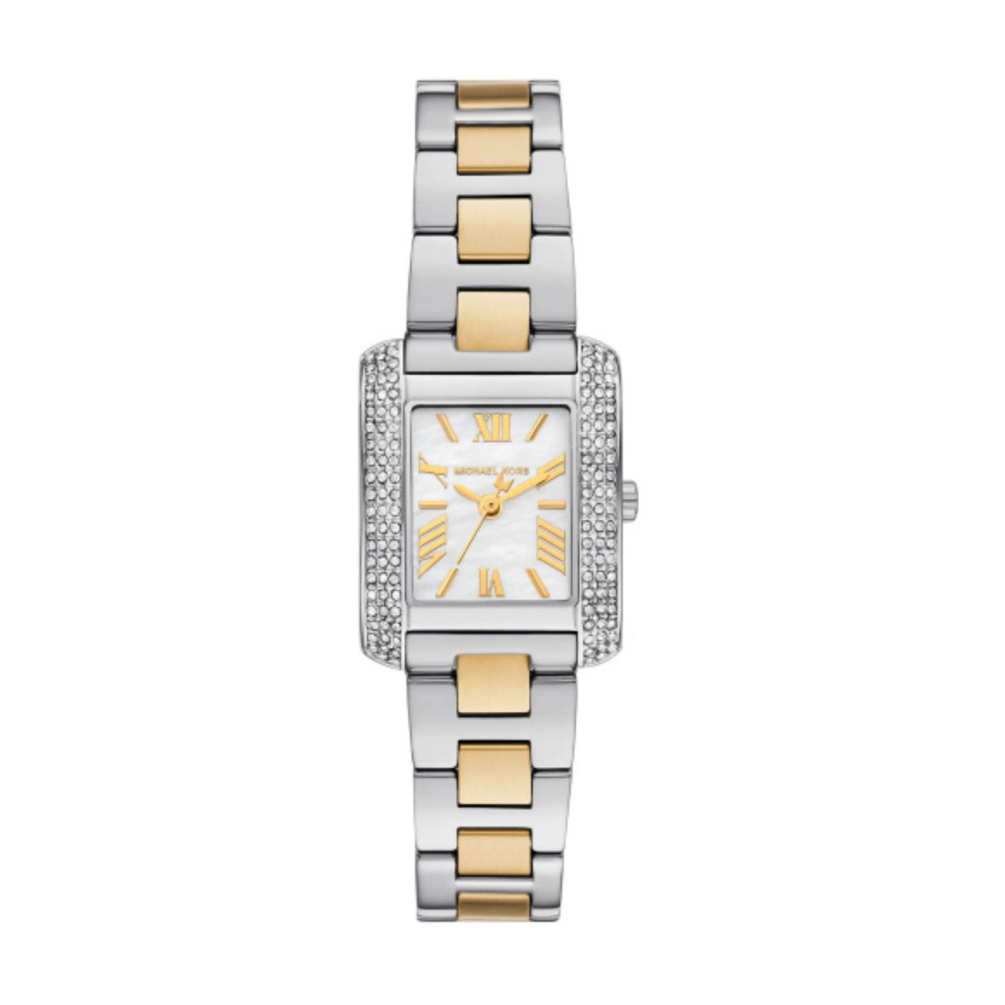 • Jewellery-inspired aesthetic, petite style, stainless steel rectangular case, polished gold-tone accents, two-tone finish, mother-of-pearl dial, Roman numeral indexes, pavé-set crystal embellishment, rectangular face, bevelled stainless-steel strap, quartz movement, scratch-resistant mineral crystal
