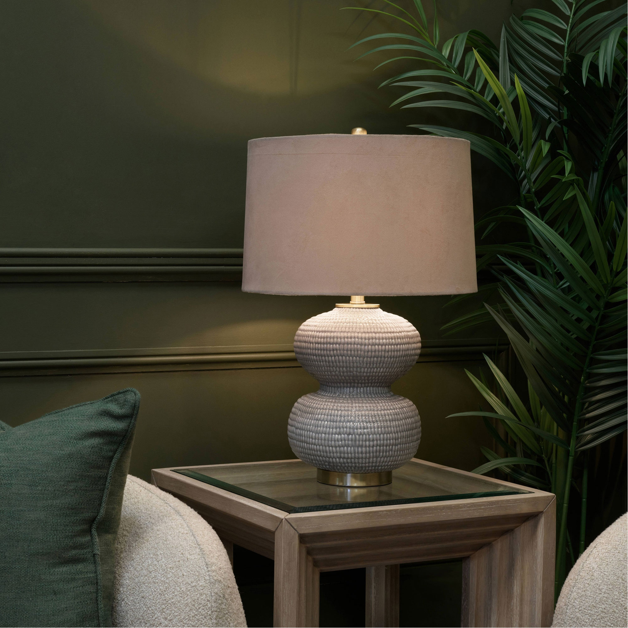 The Lara Lamp from Mindy Brownes features a beautifully sculpted ceramic base defined by soft ridges and a rounded silhouette. The neutral tone of the base allows the lamp to blend seamlessly into various interior styles while its textured surface adds depth and interest. A warm linen shade completes the design and enhances the lamp with a soft natural glow. Its proportions add visual balance making it a perfect choice for bedside tables, living rooms, or stylish hallway consoles.