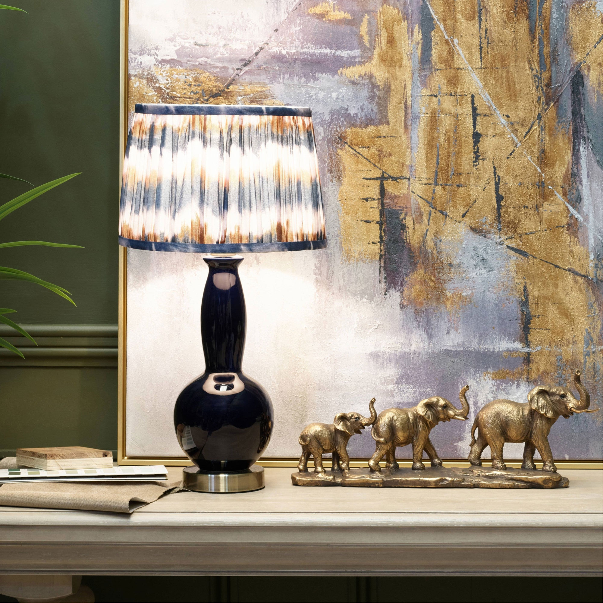 The Poppy Lamp from Mindy Brownes is a bold and expressive lighting piece that brings confidence and artistic flair into the home. Its glossy ceramic base is sculpted with soft curves that feel both elegant and contemporary. The pleated shade features a rich painterly pattern in deep blue and warm neutral tones. The patterned shade diffuses light gently while adding character and movement to the space. Poppy works beautifully as a statement piece in a living room, hallway, or bedroom, where it can bring depth and add personality.
