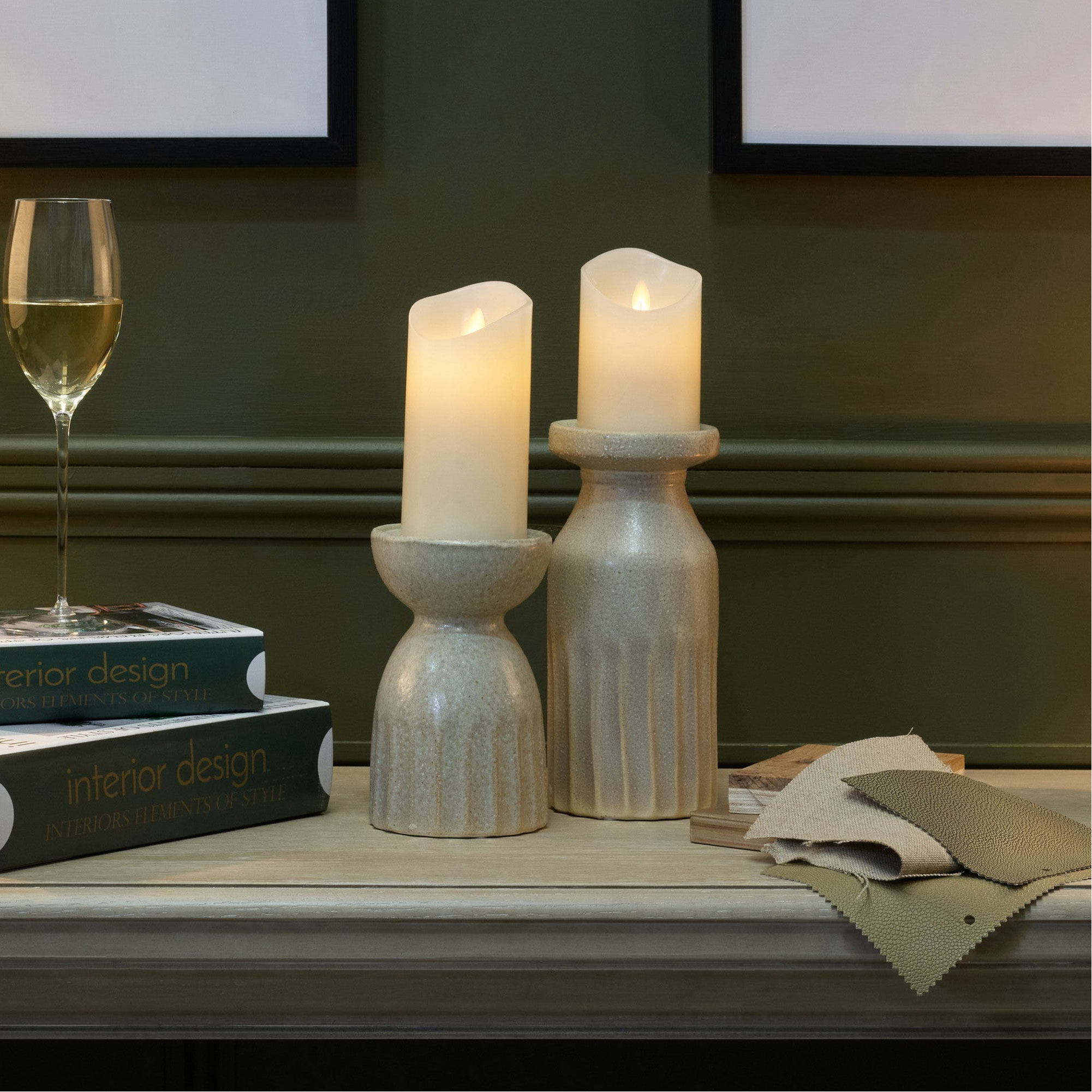 The Sophie Small Candle Holder from Mindy Brownes features a gently rounded form with a beautifully textured surface that resembles hand-carved ceramic work. Its soft, neutral glaze gives it a calming presence while the vertical ridging adds structure and visual interest. When paired with a simple pillar candle, the holder casts a warm inviting glow that enhances moments of rest and ambience. Styled alone or together with the larger version, this piece brings a sense of harmony and softness to any space.
