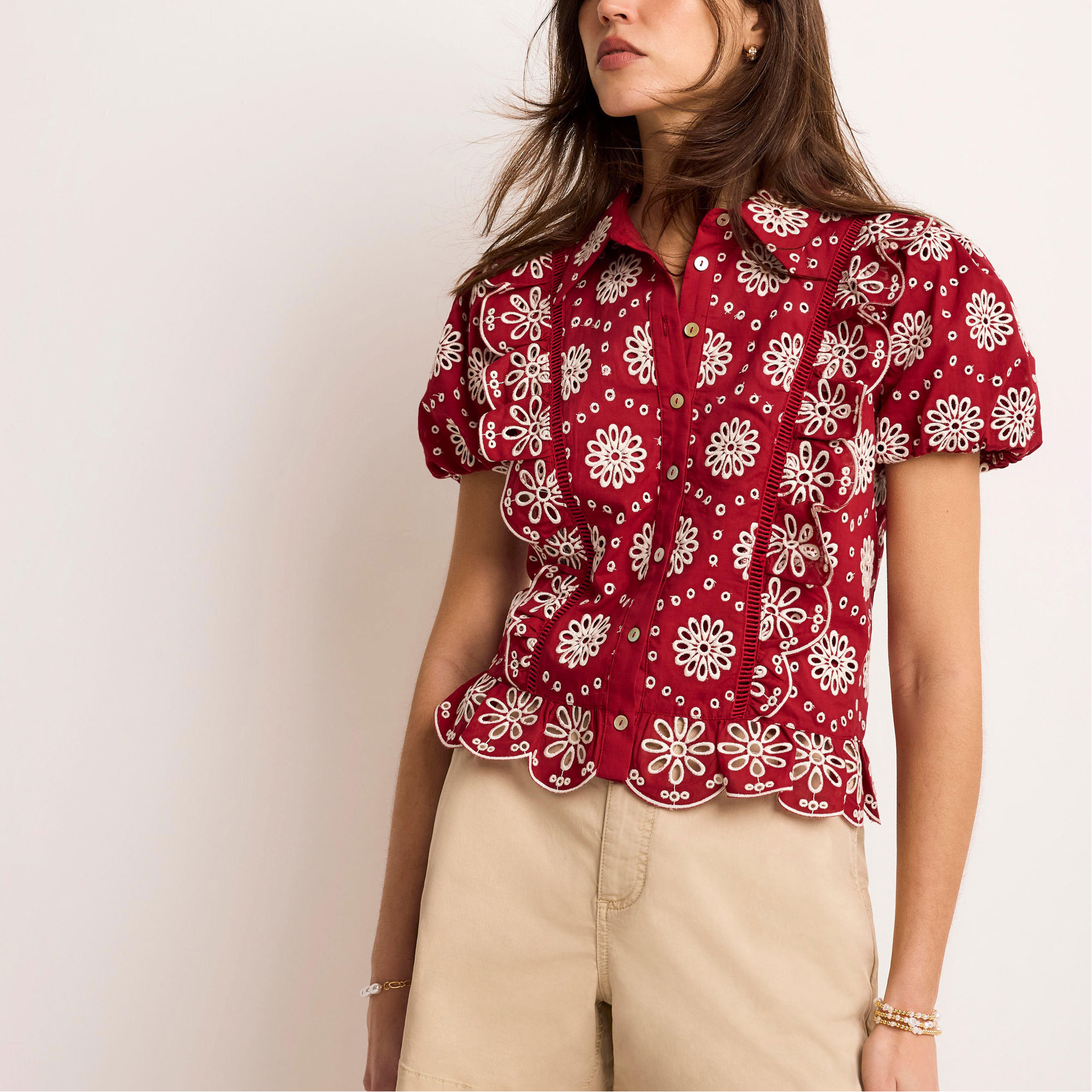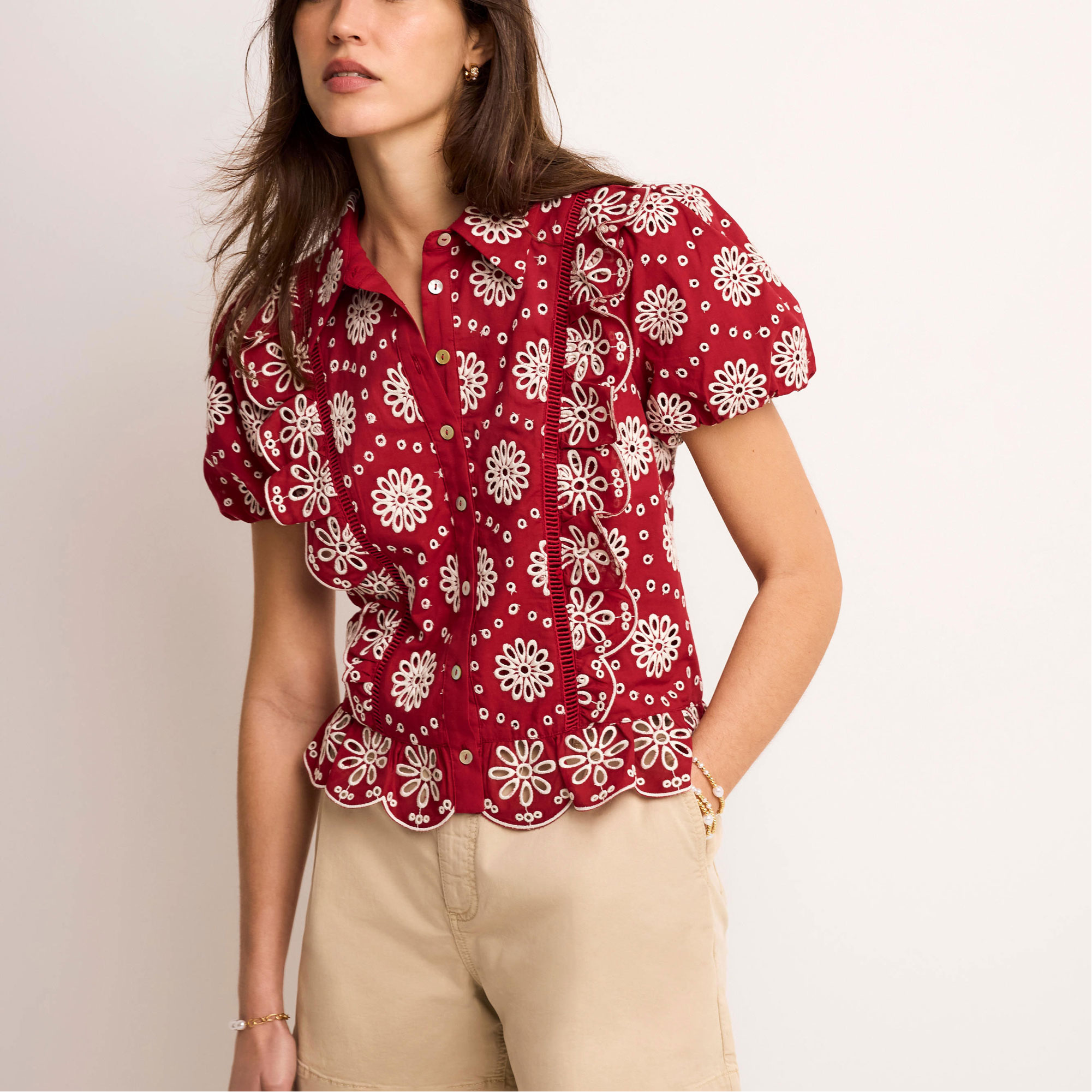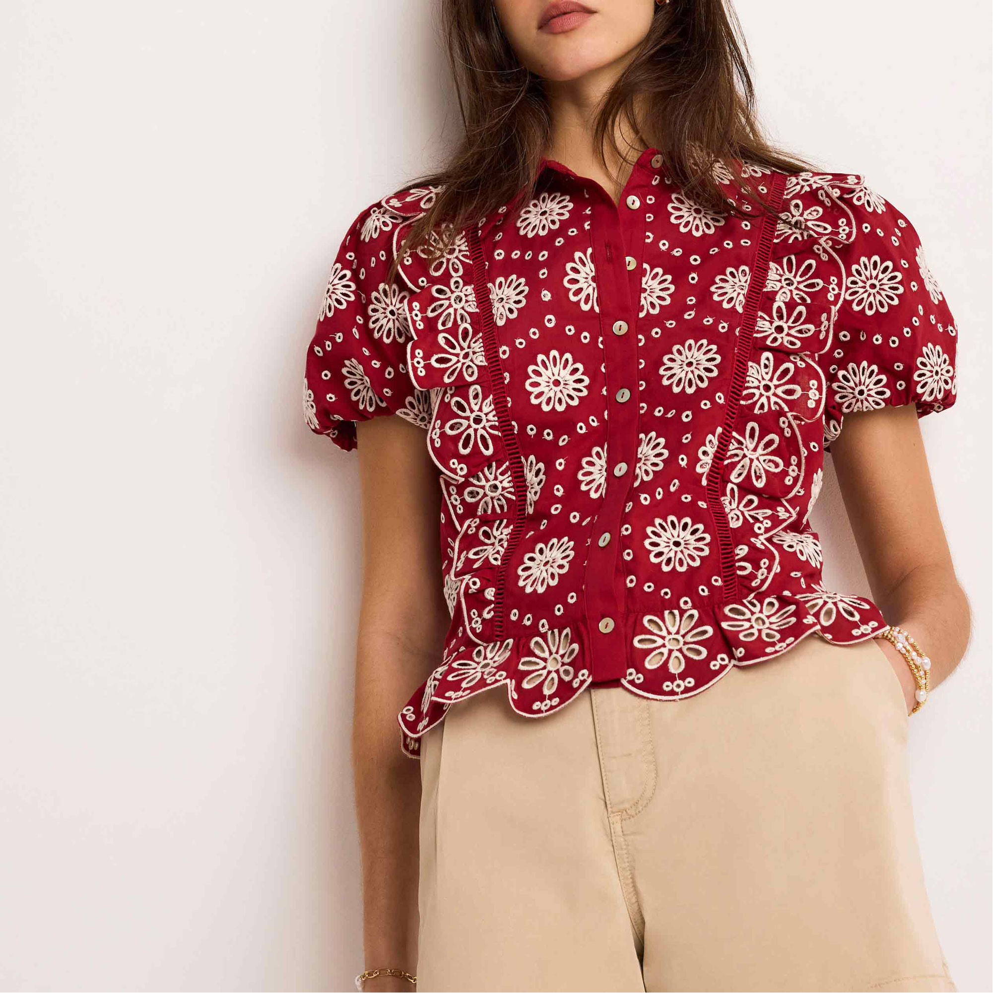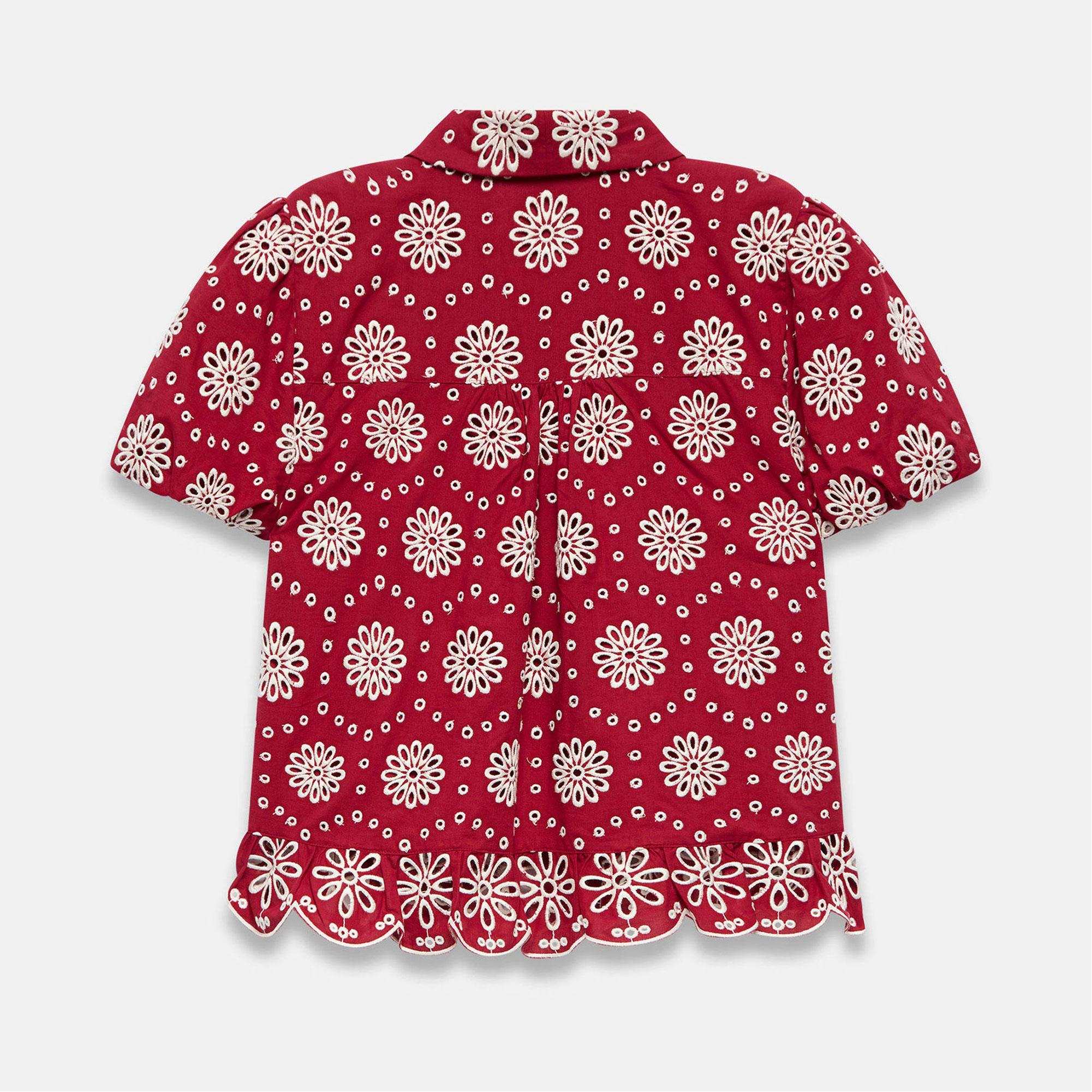 - Classic collar, open stitch detail, ruffle trim, short puff sleeves, scallop hemline, front button fastenings