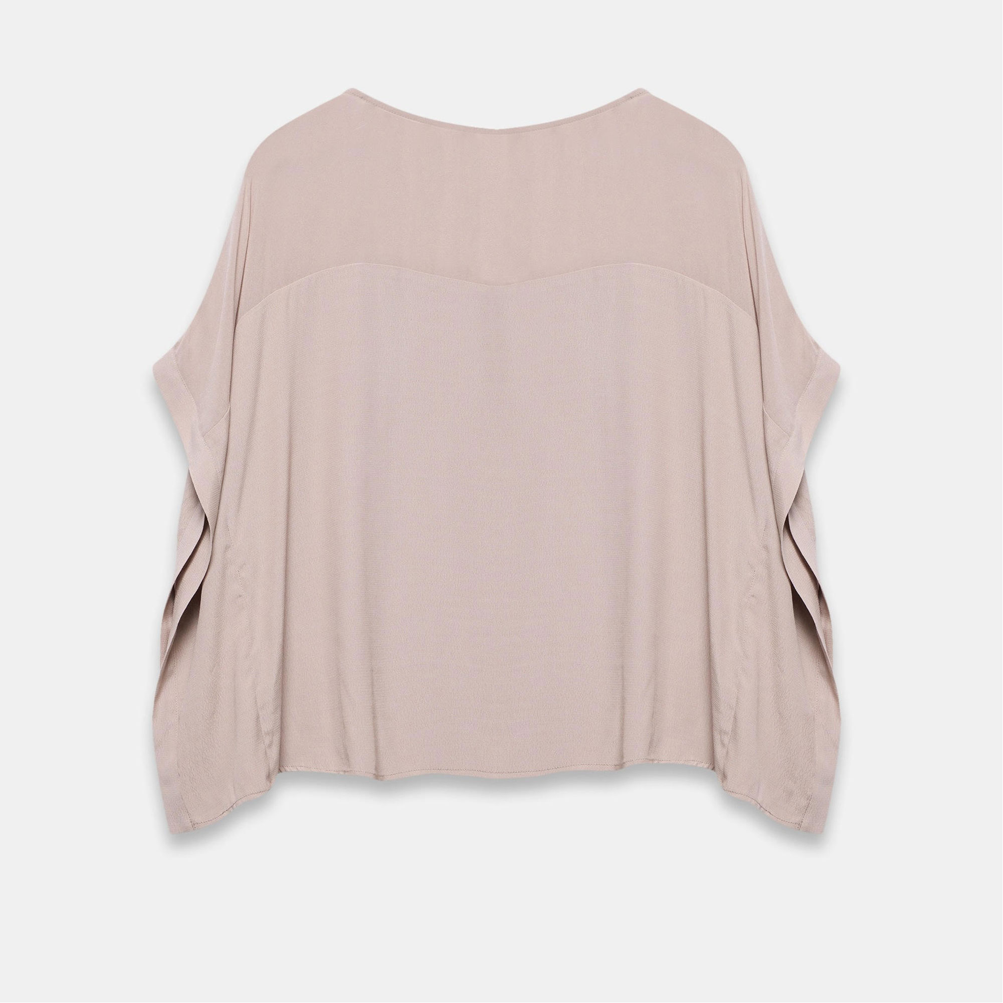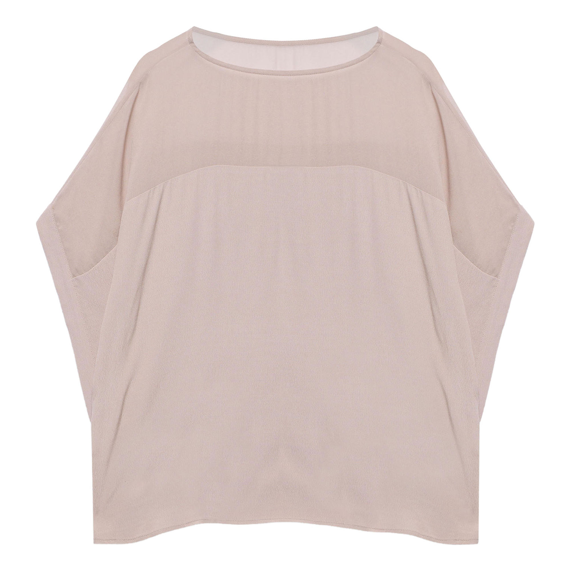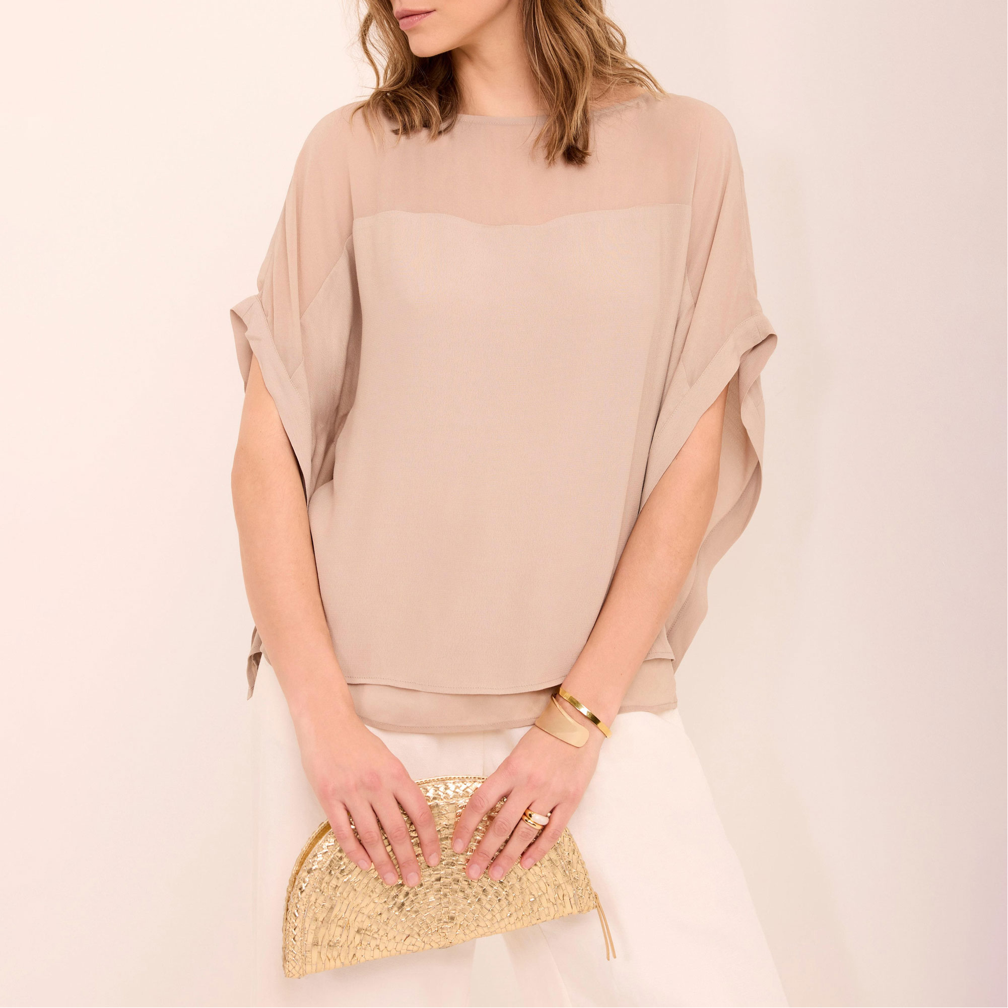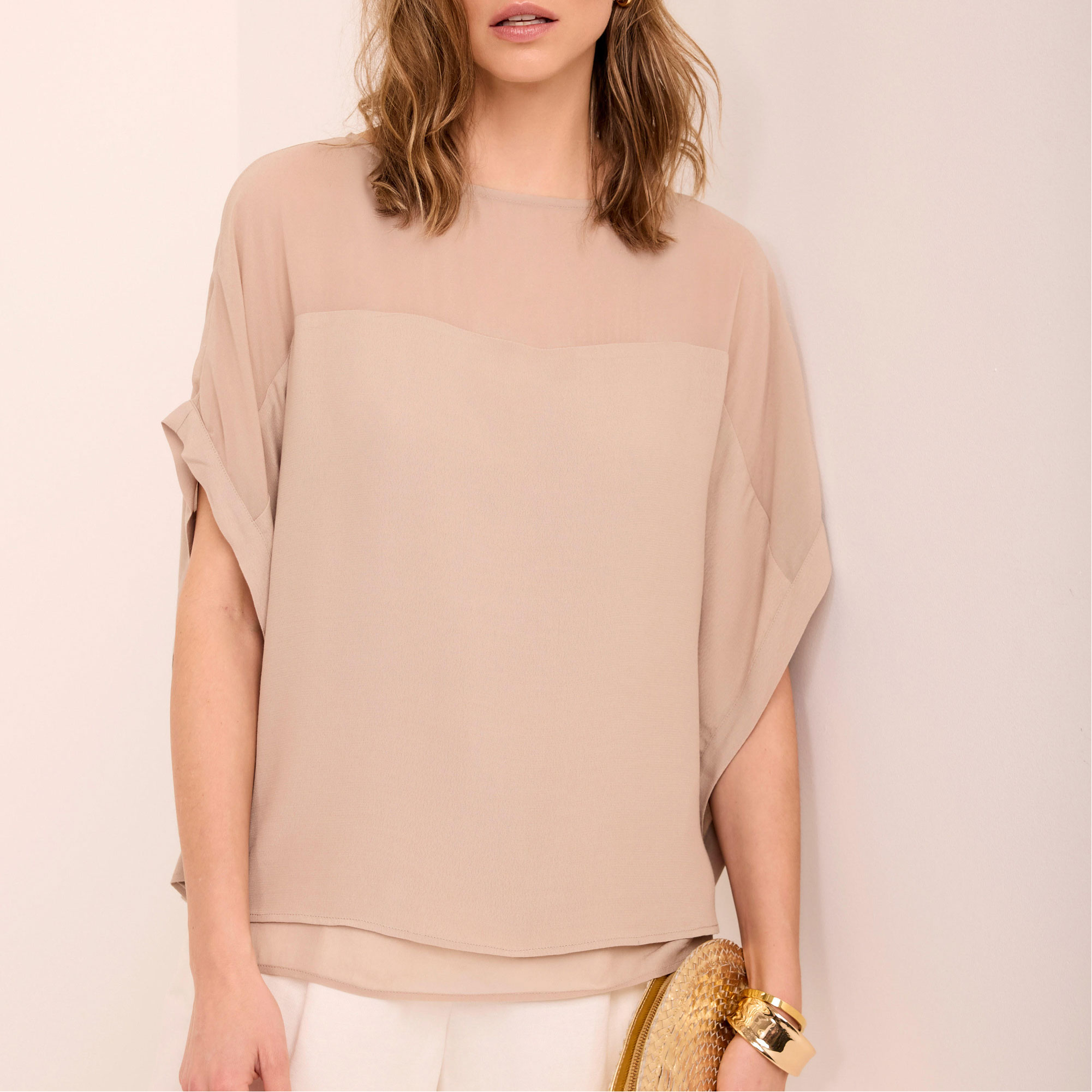 - Layered design, crew neckline, sheer panel, wide cap sleeves