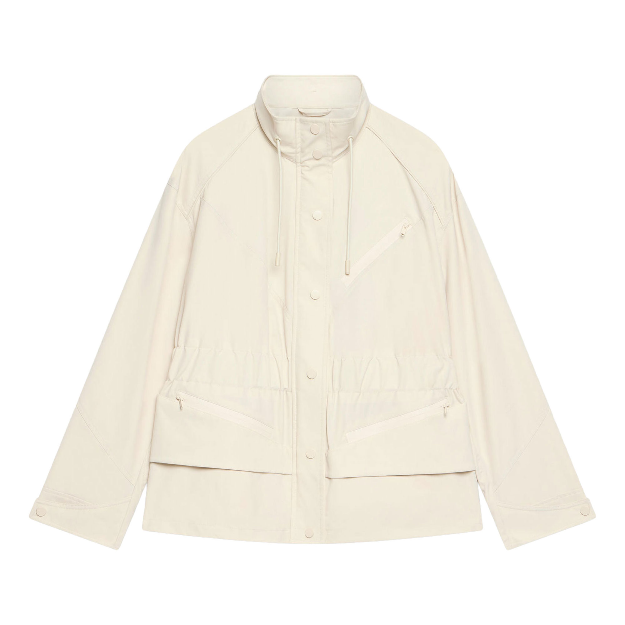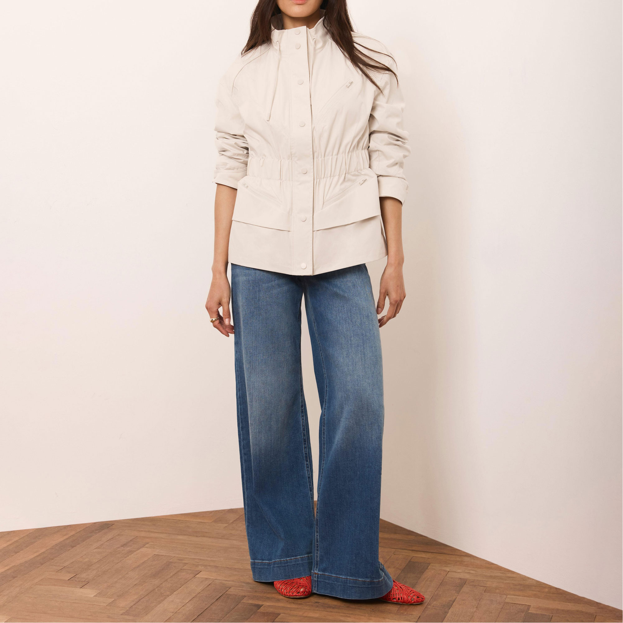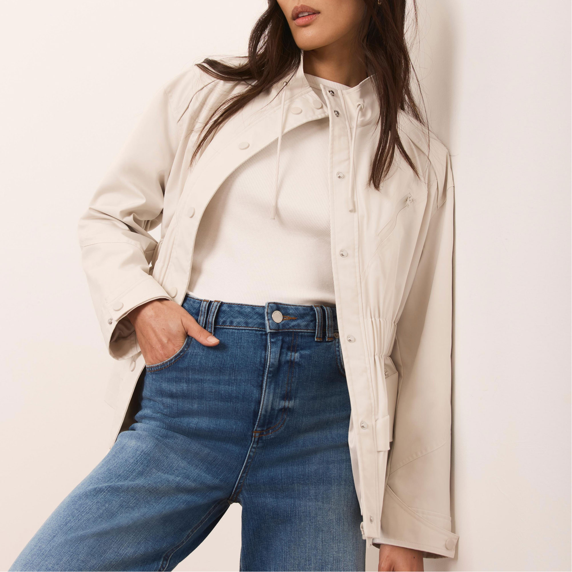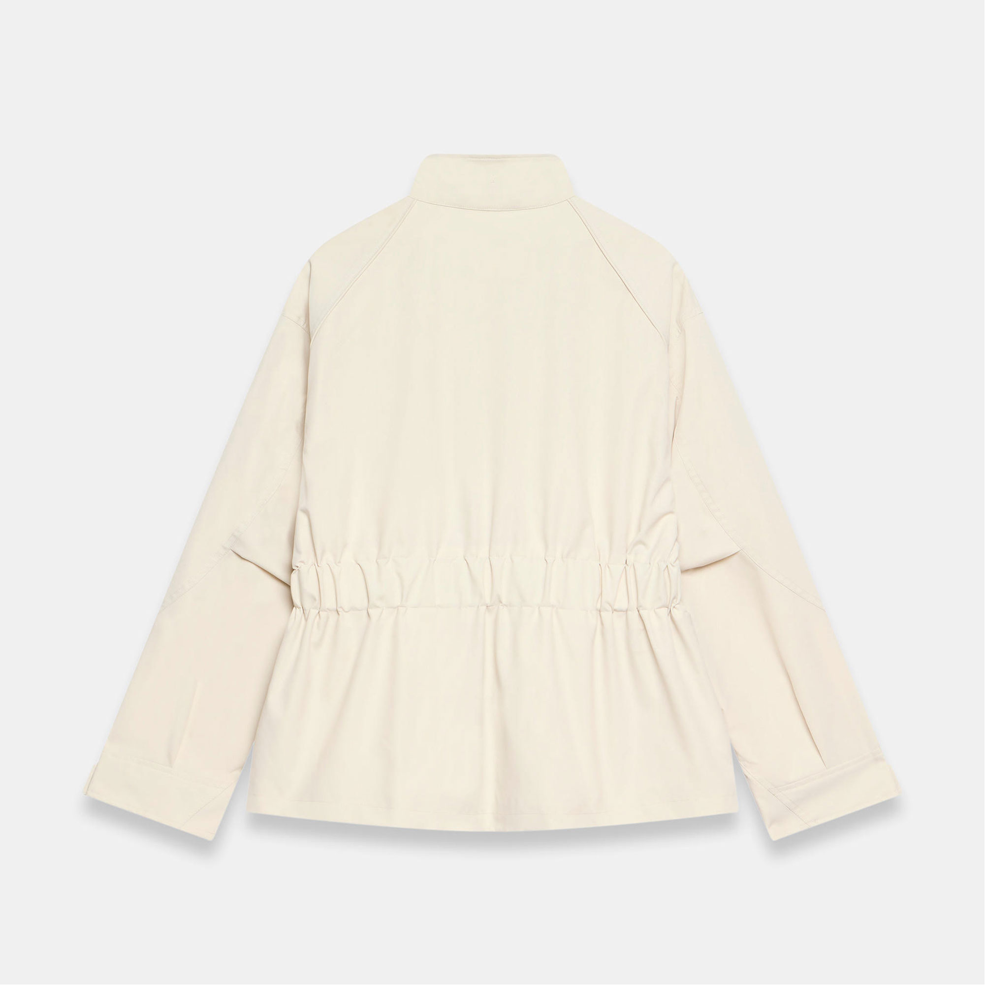 • High neckline, drawstring fastening, long sleeves, popper cuffs, layered hemlines, zip pockets, cinched waist, zip and popper fastening