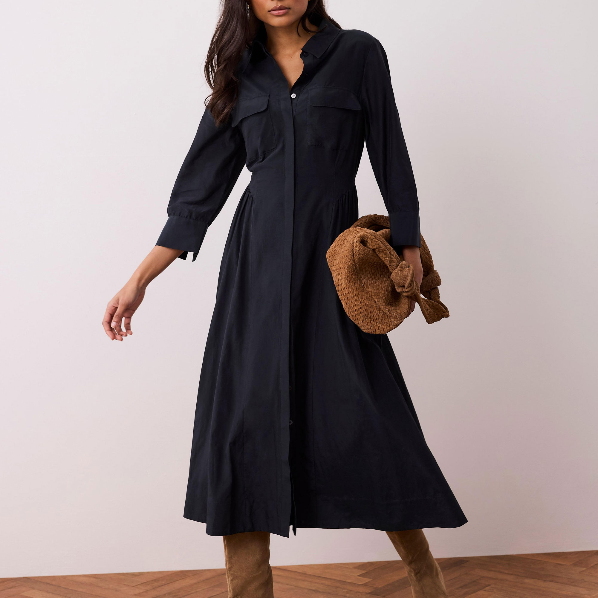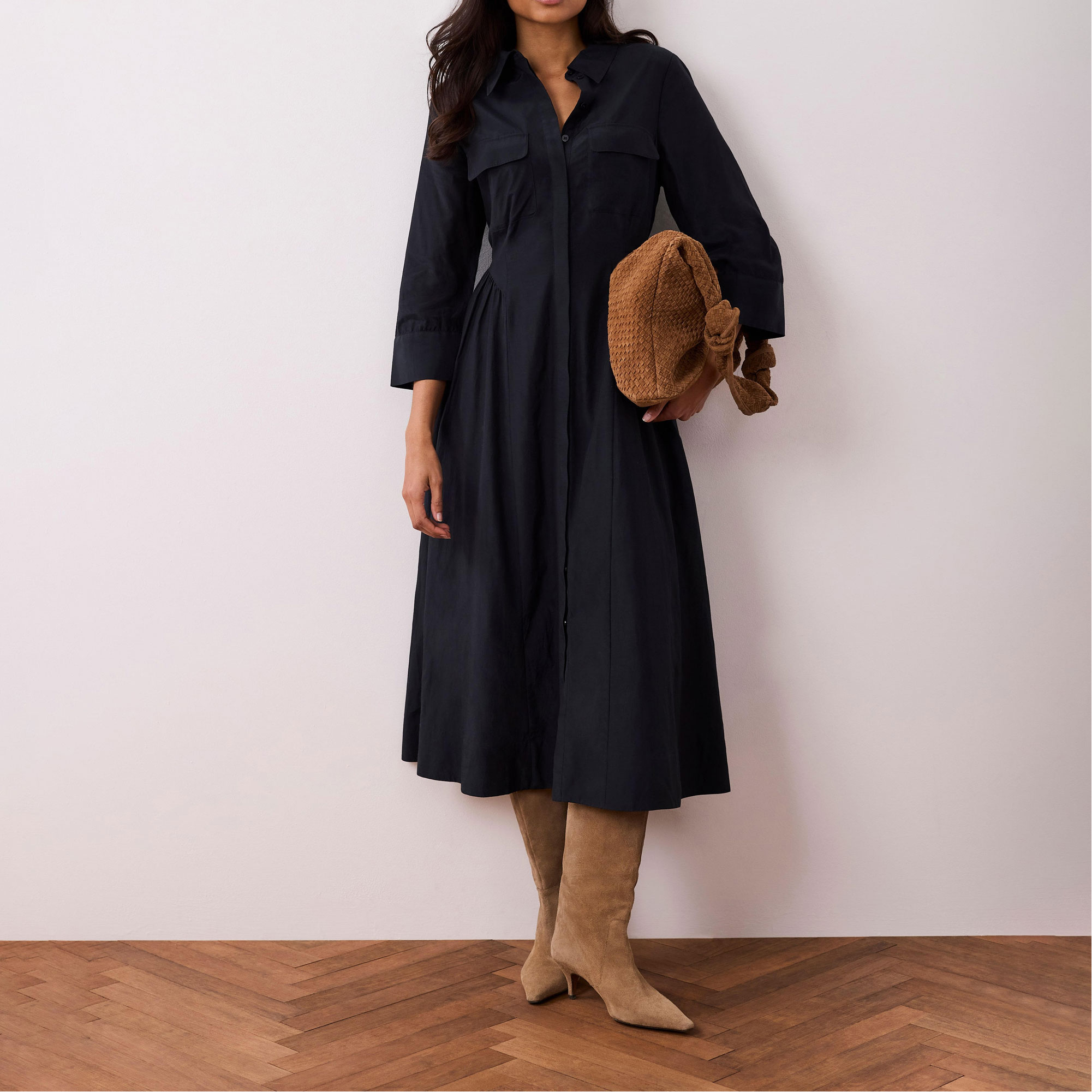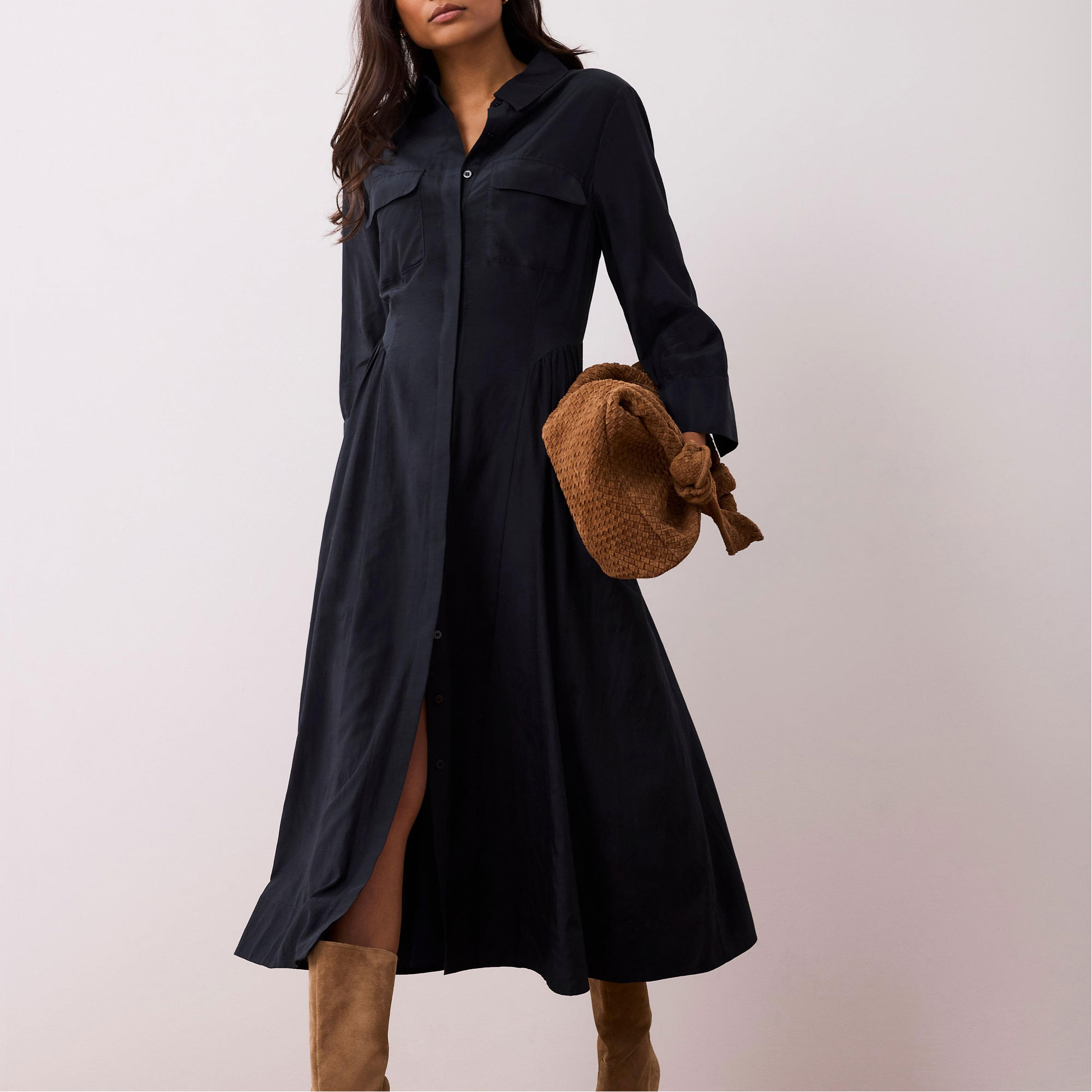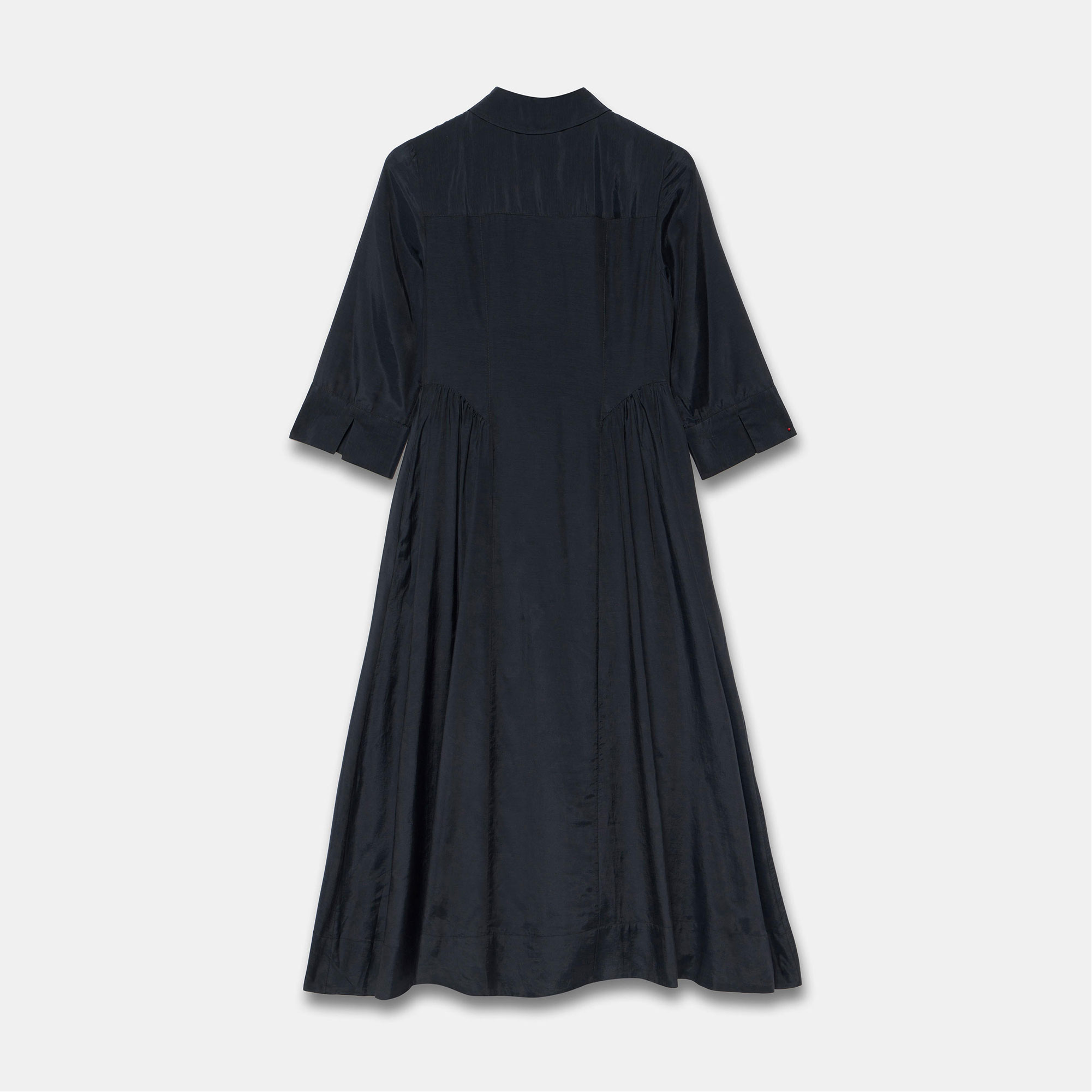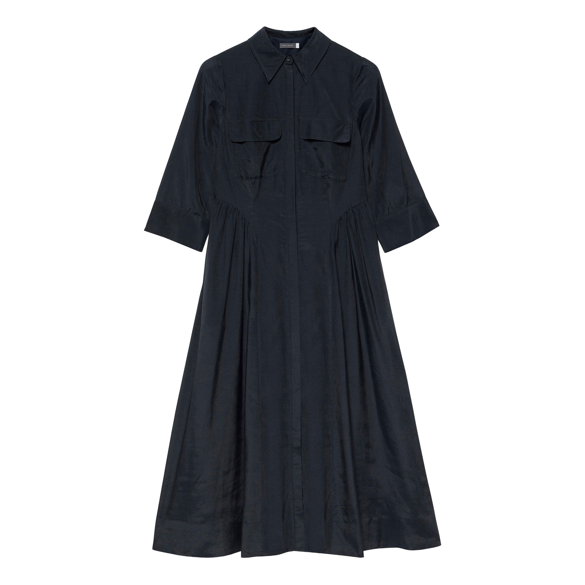 - Shirt style, maxi silhouette, classic collar, chest flap pockets, three-quarter-length split sleeves, gathered waist detail, concealed front zip fastening