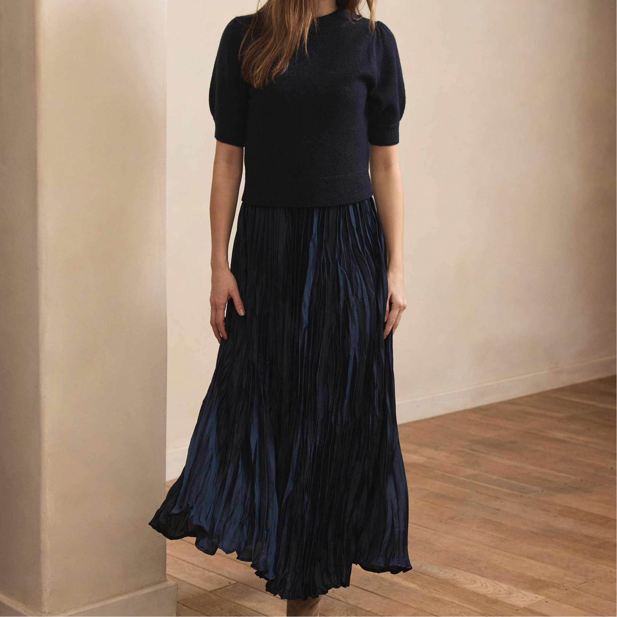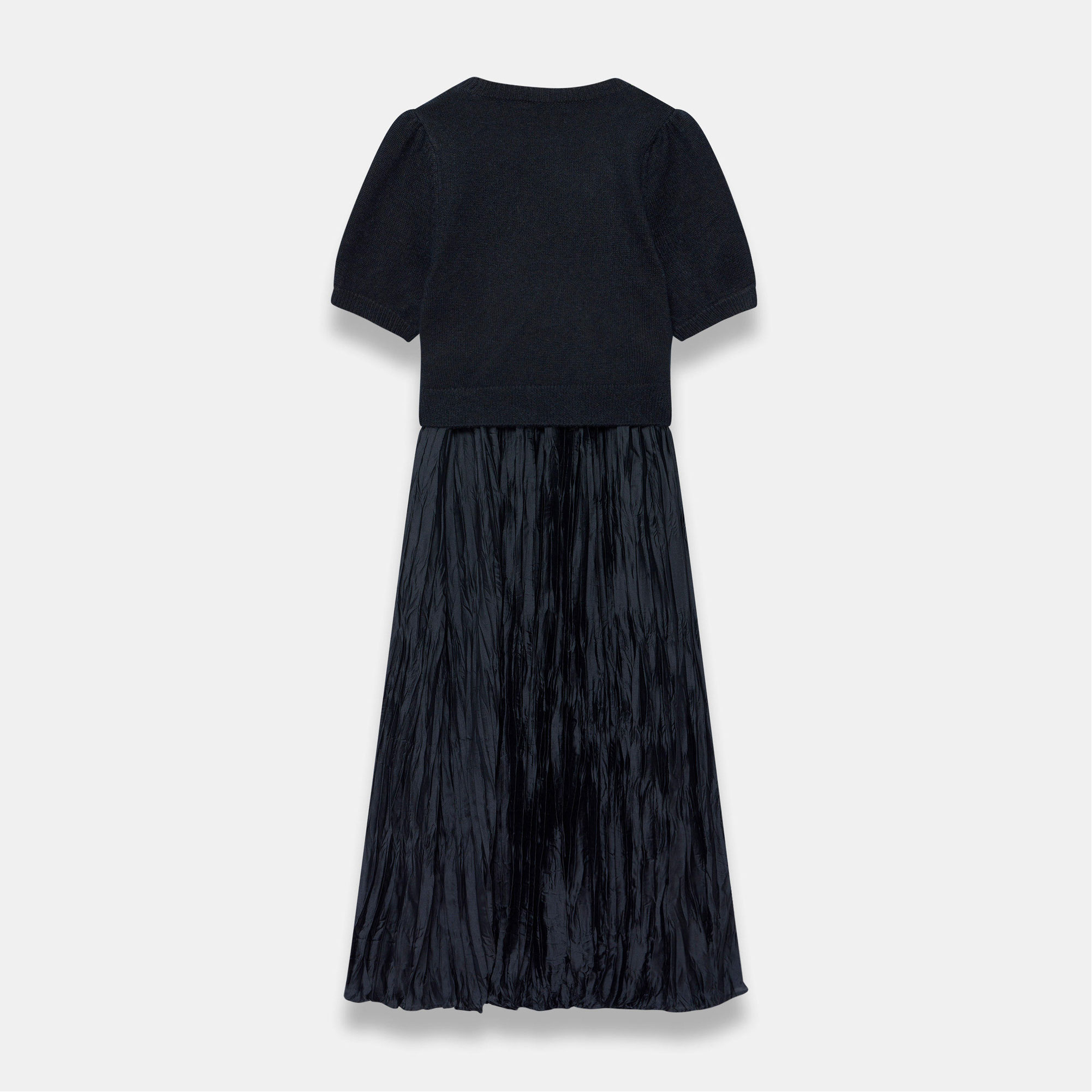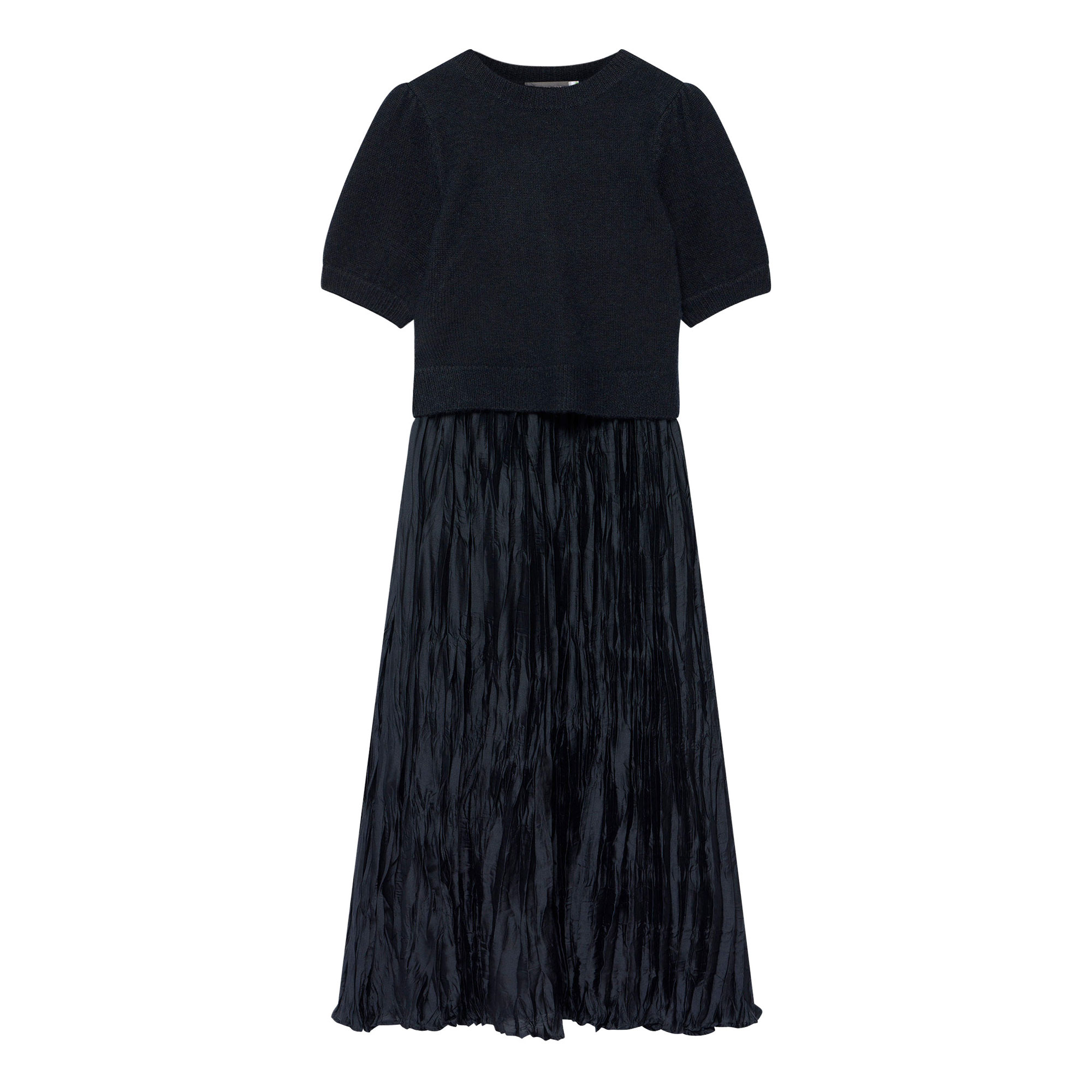- Maxi silhouette, crew neckline, short puff sleeves, seam detailing, insert layered waistband, crinkle skirt