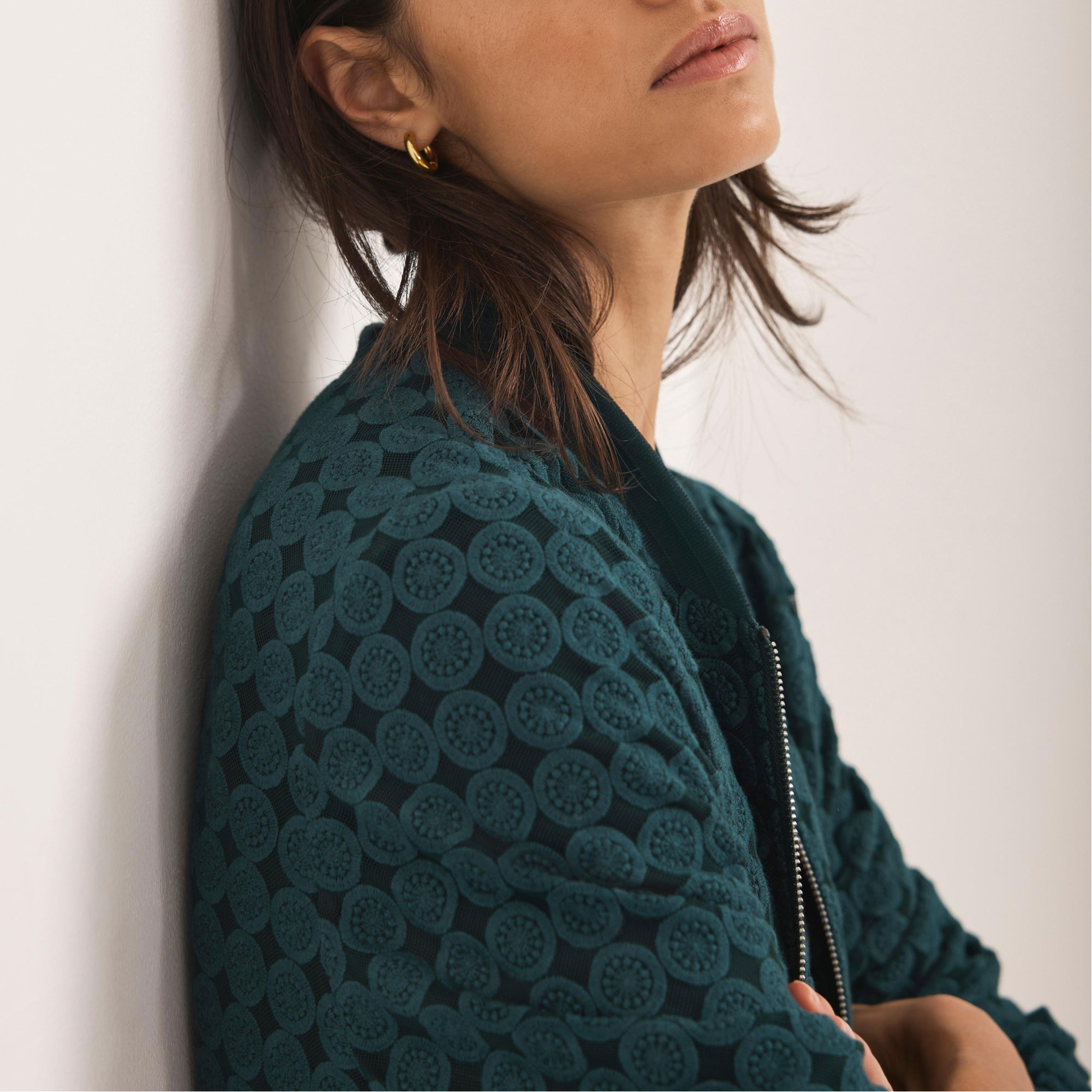 - Geometric lace design, bomber collar, long sleeves, contrast trim, side pockets, front zip fastening