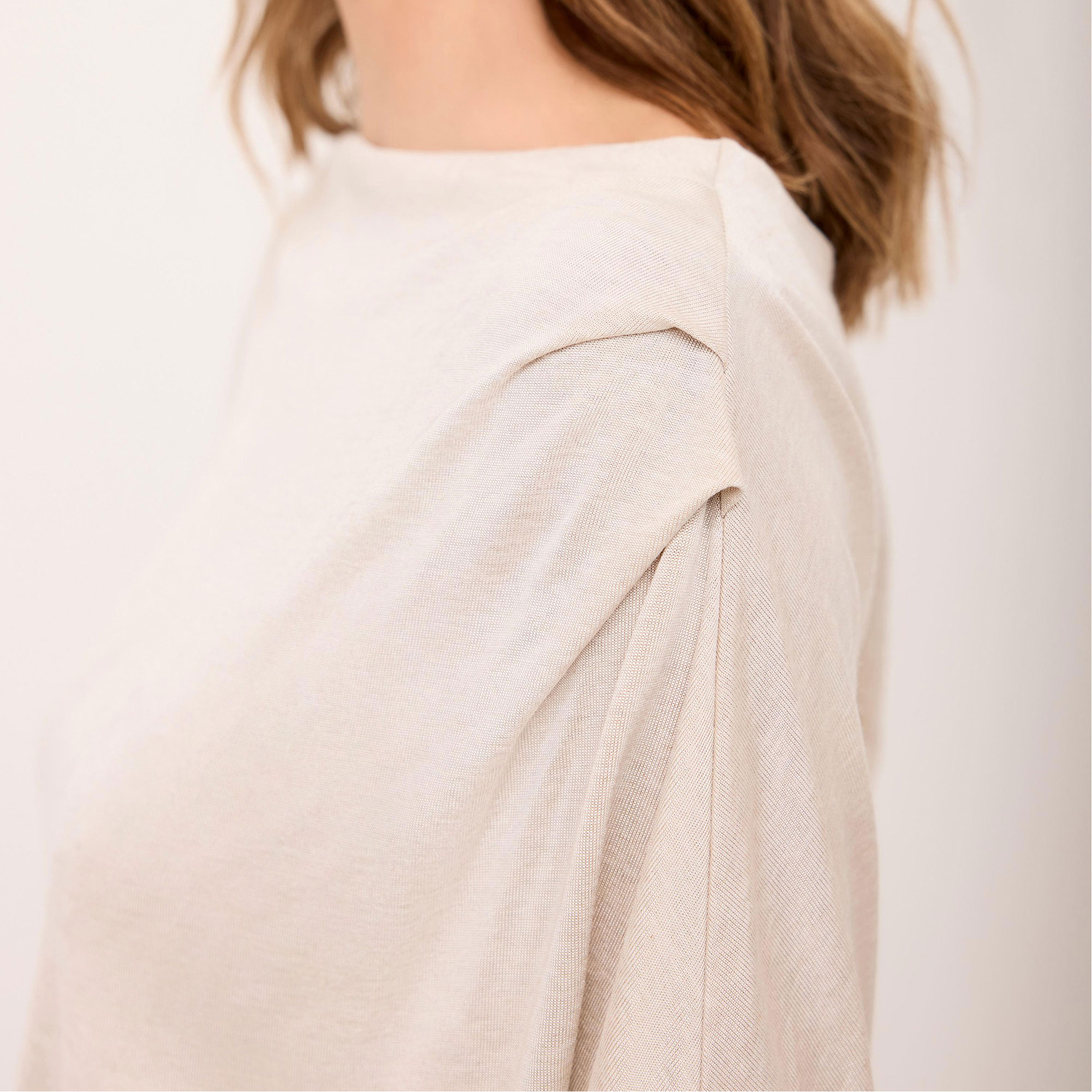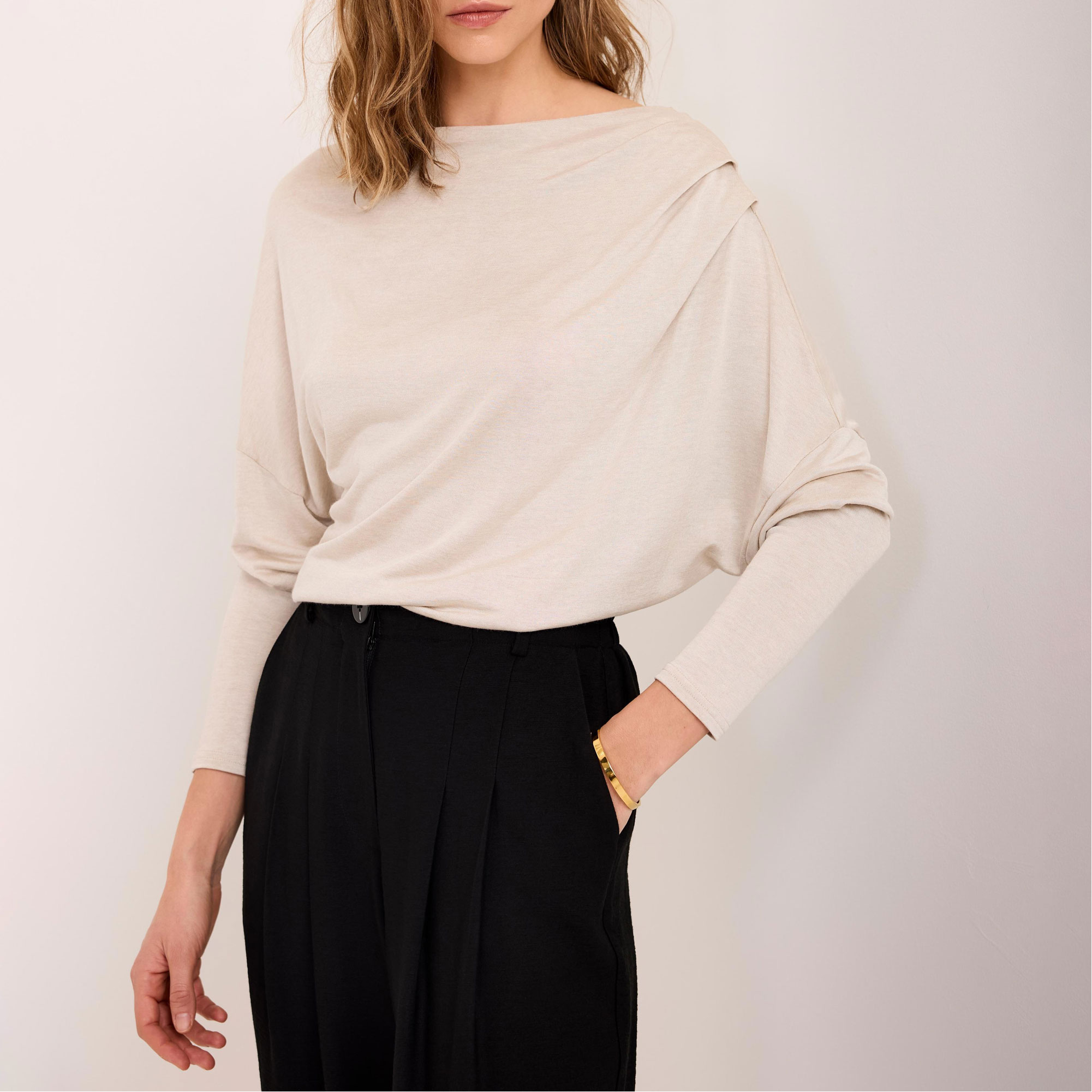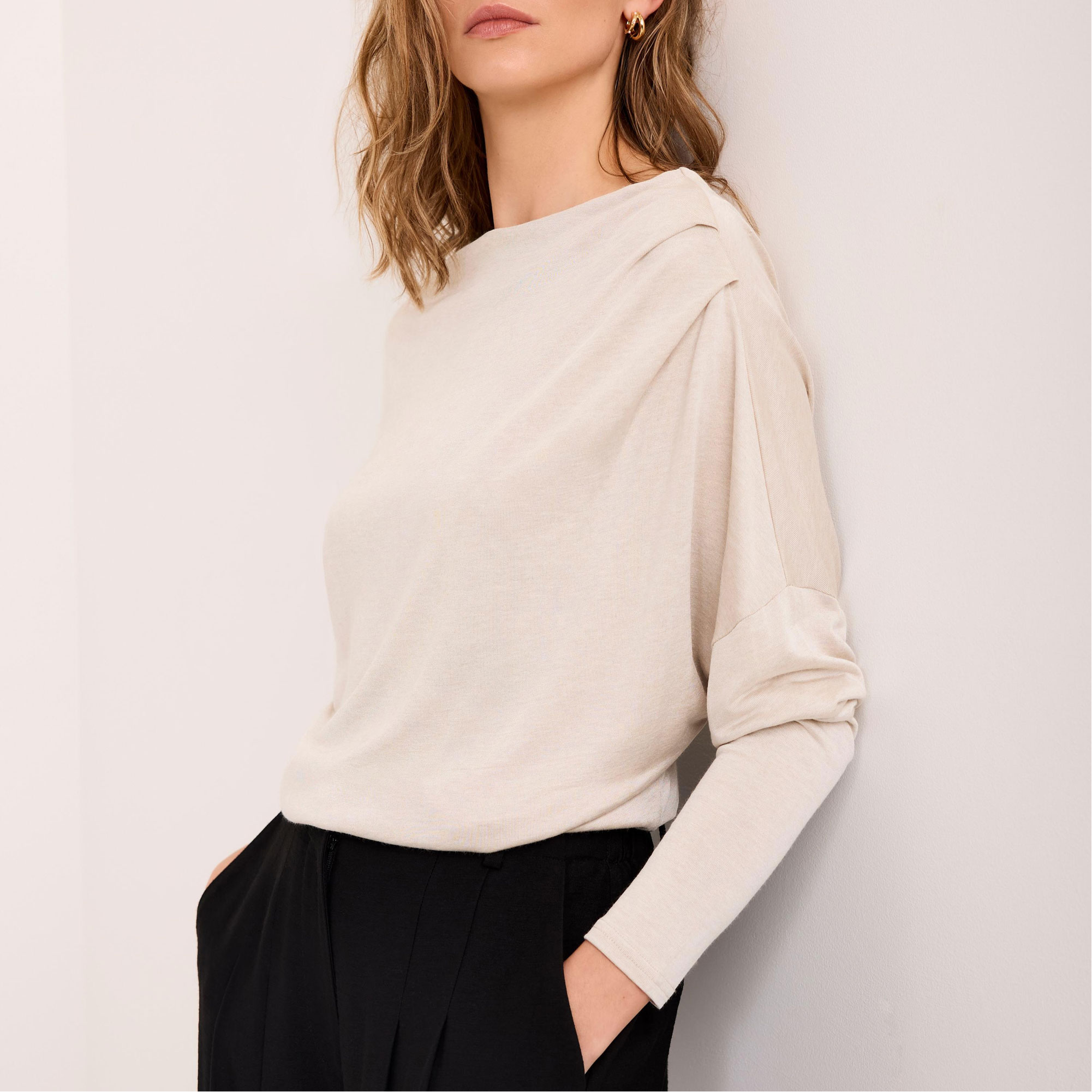 - Metallic finish, slash neckline, long sleeves, ruched shoulder detailing