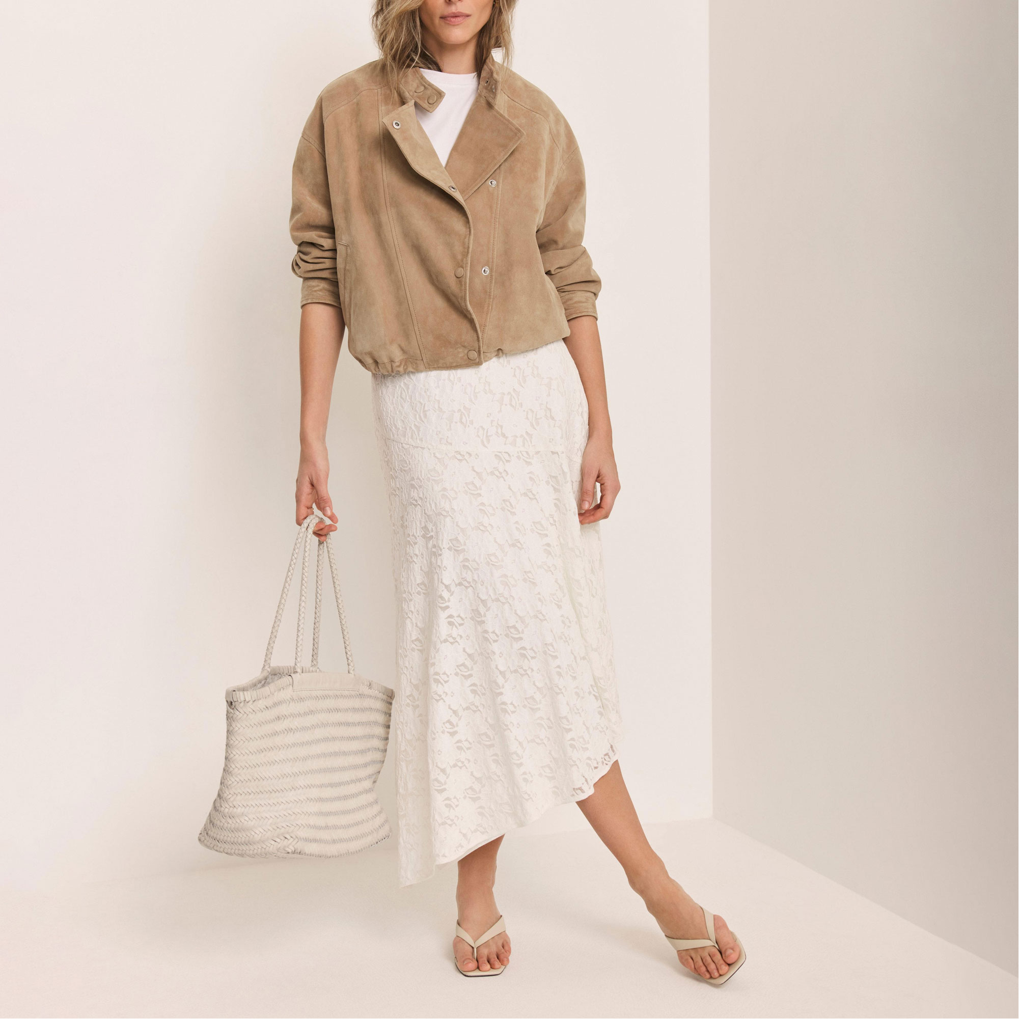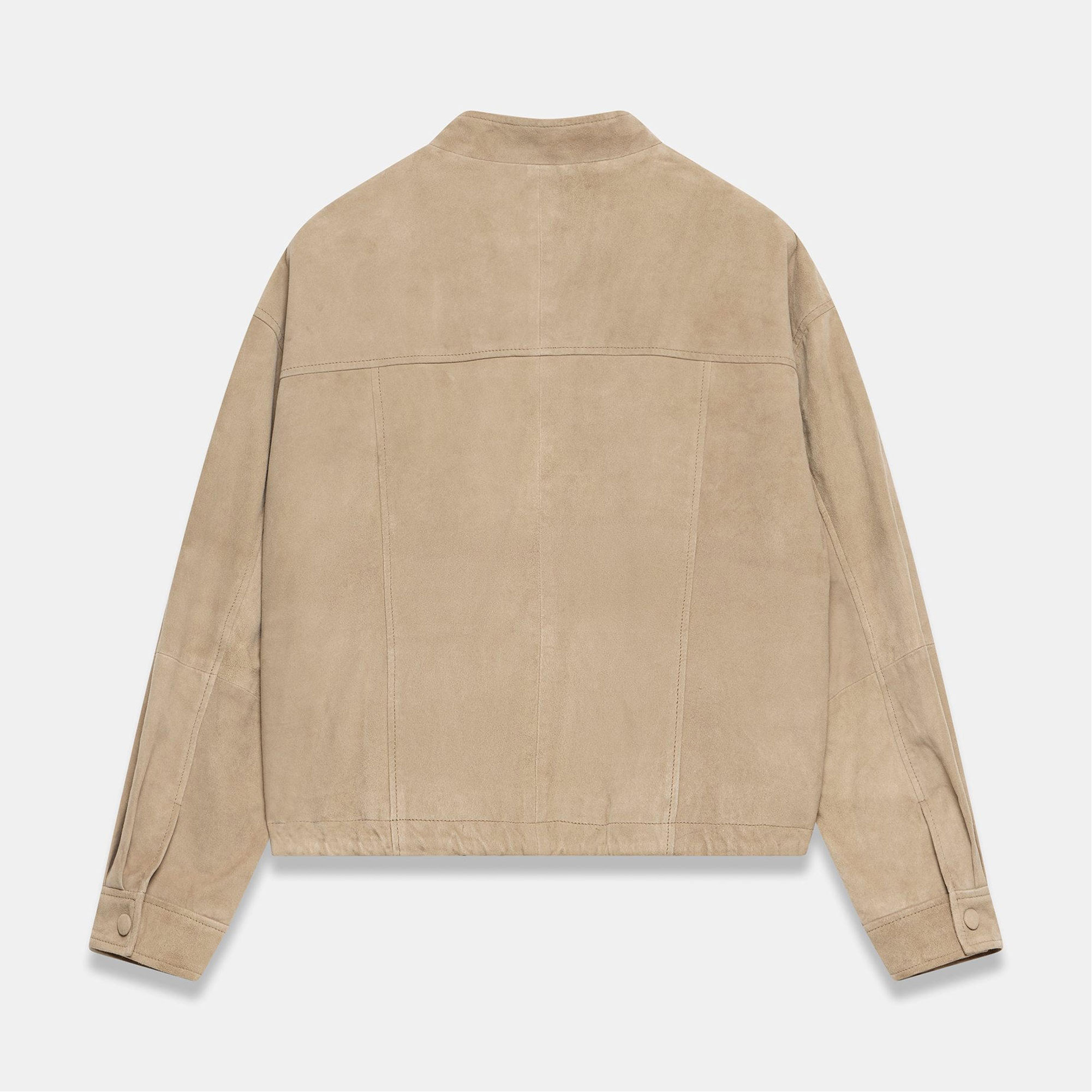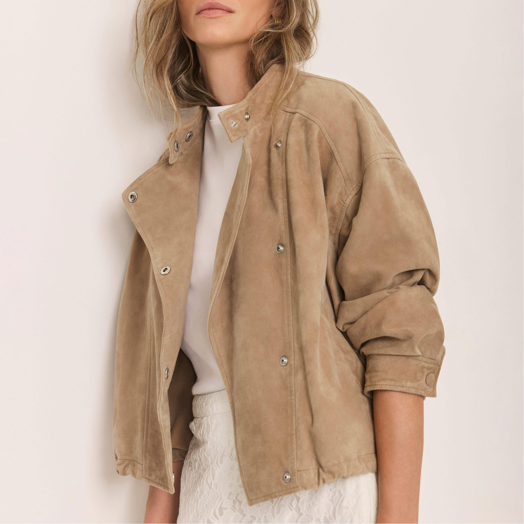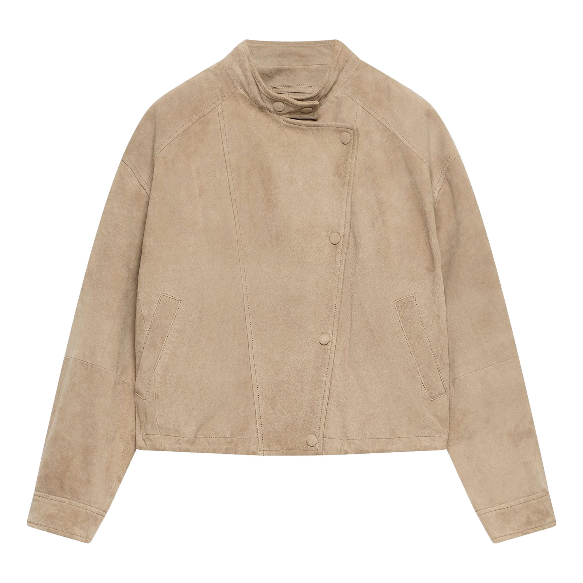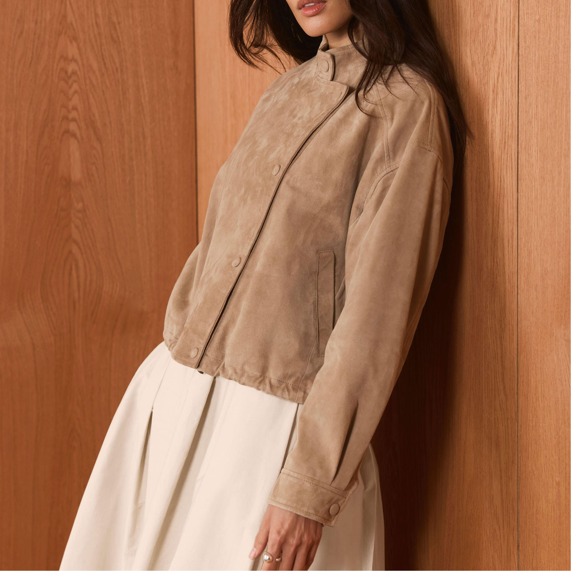 • Suede finish, high neckline, side pockets, long sleeves, popper cuffs, asymmetric concealed zip and popper fastening
