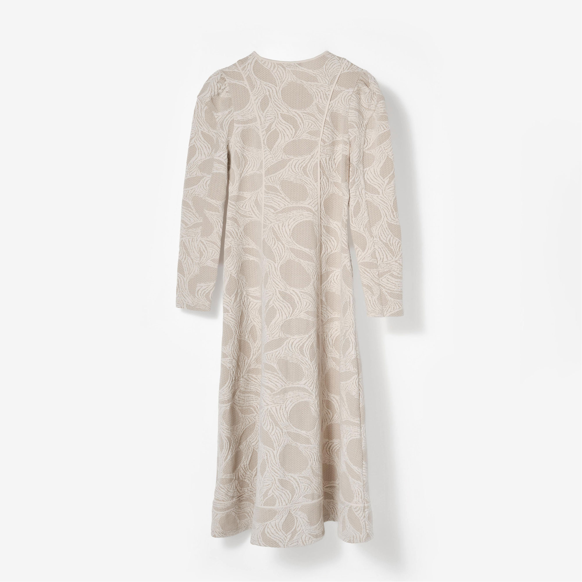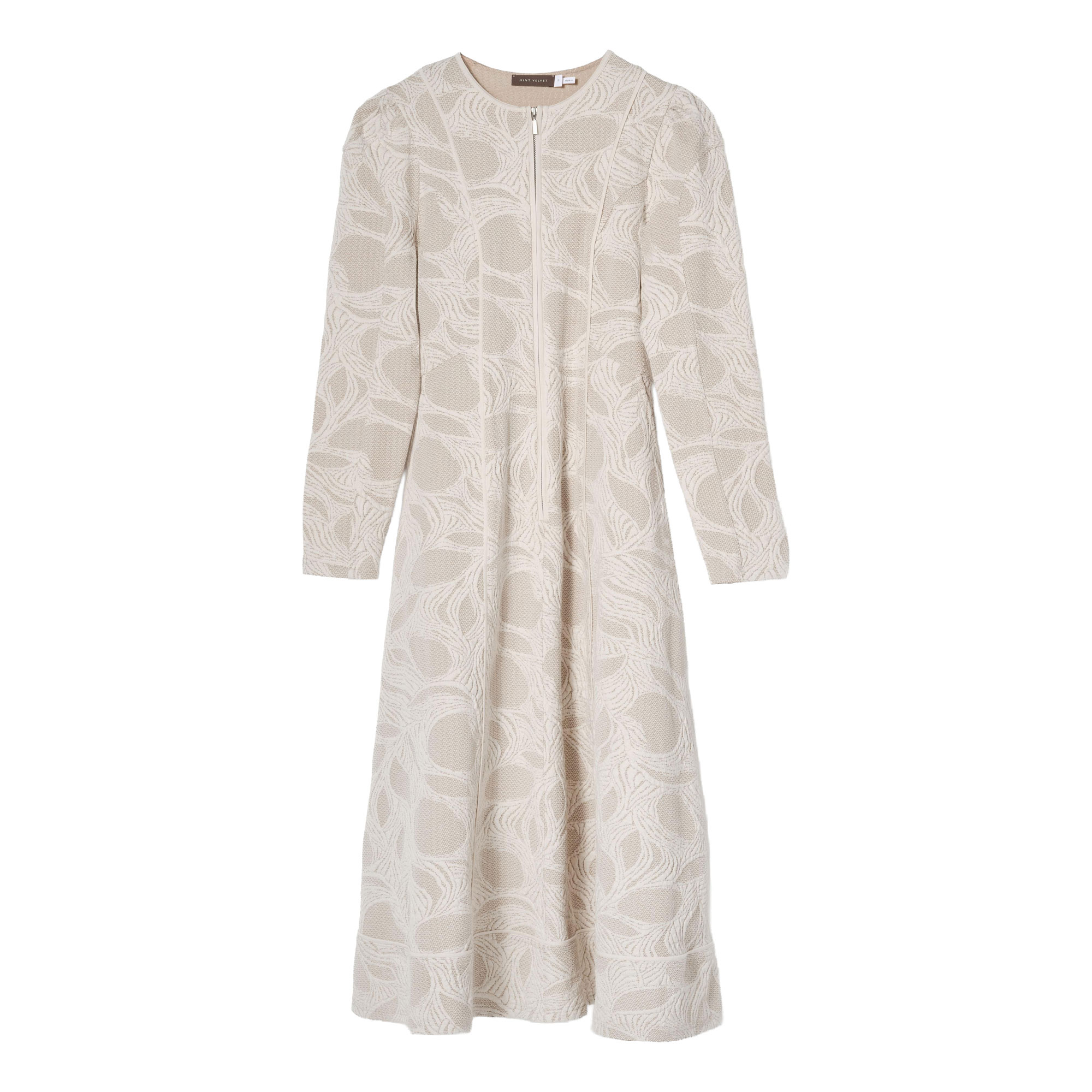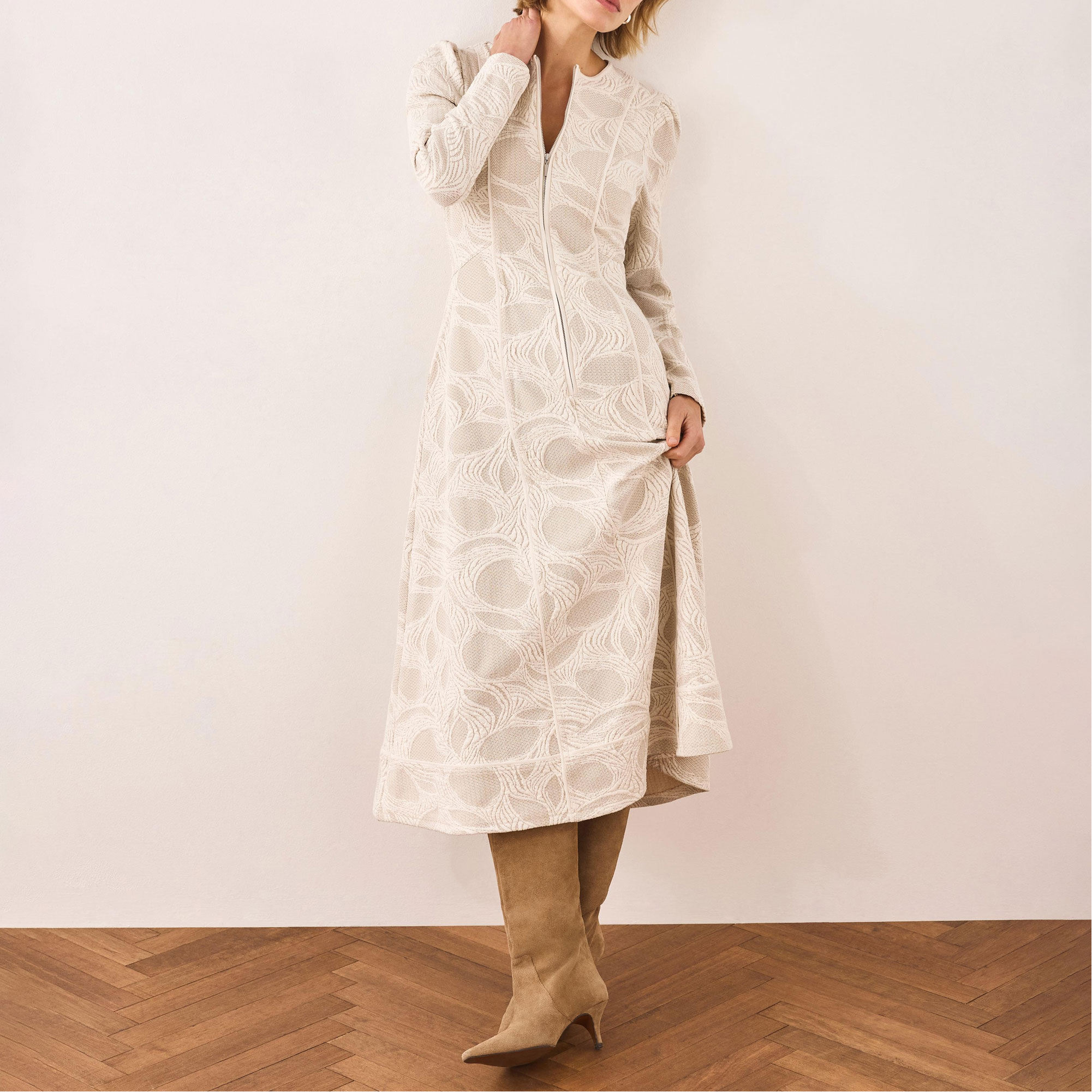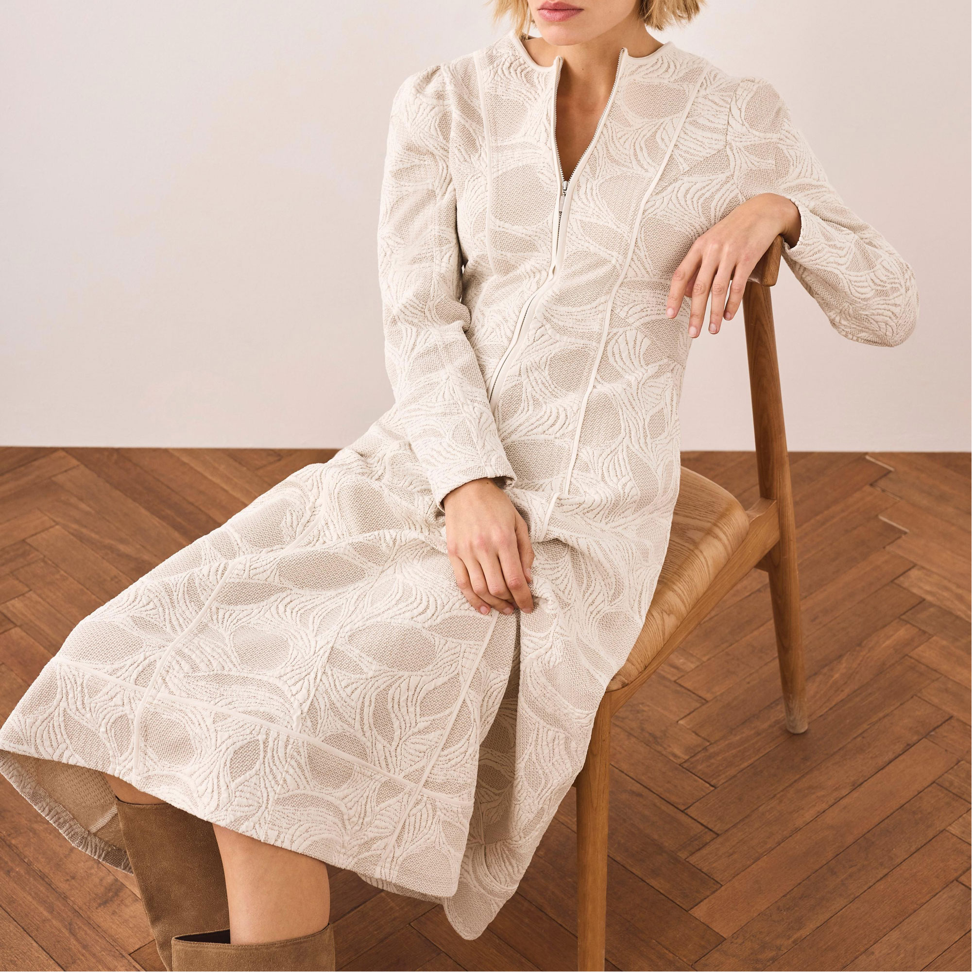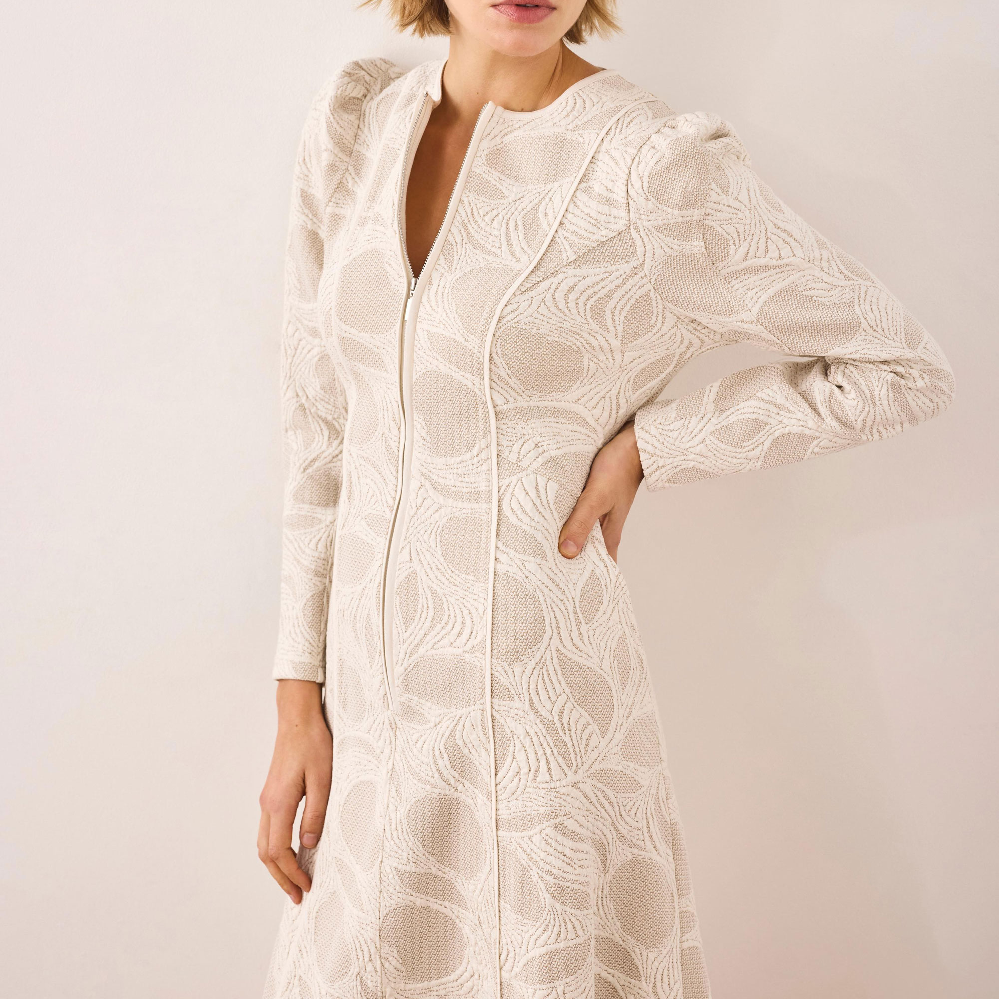 - Textured jacquard print, midi silhouette, crew neckline, long sleeves, front zip fastening