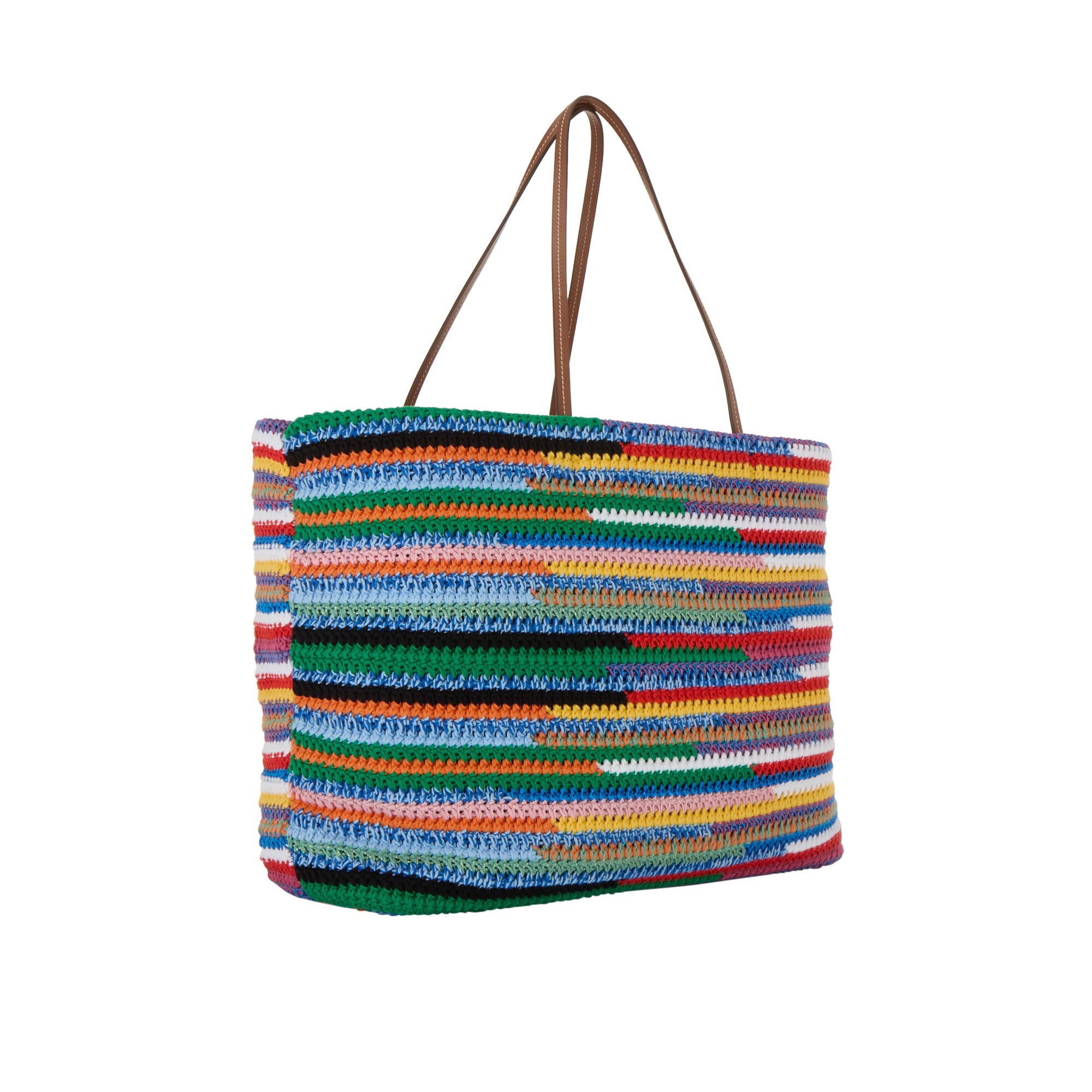 - Tote silhouette, crochet exterior, logo detail, two shoulder straps, spacious interior, internal zip pocket