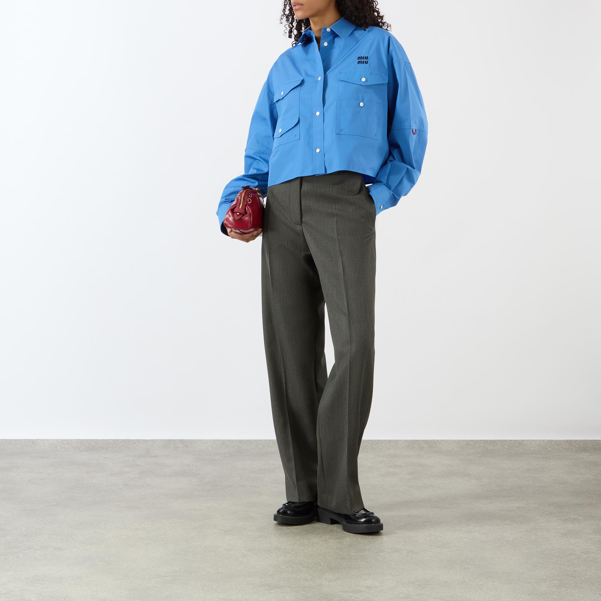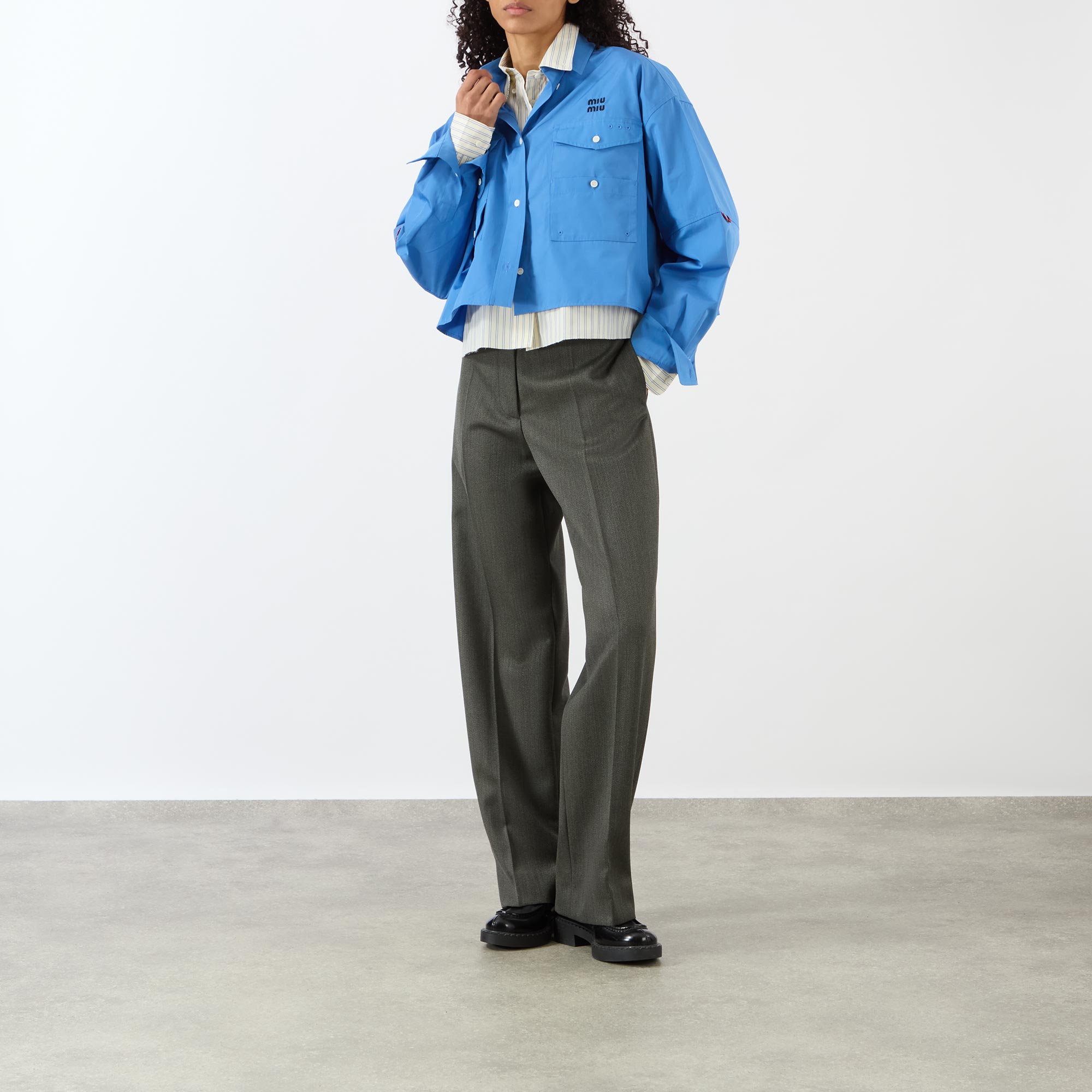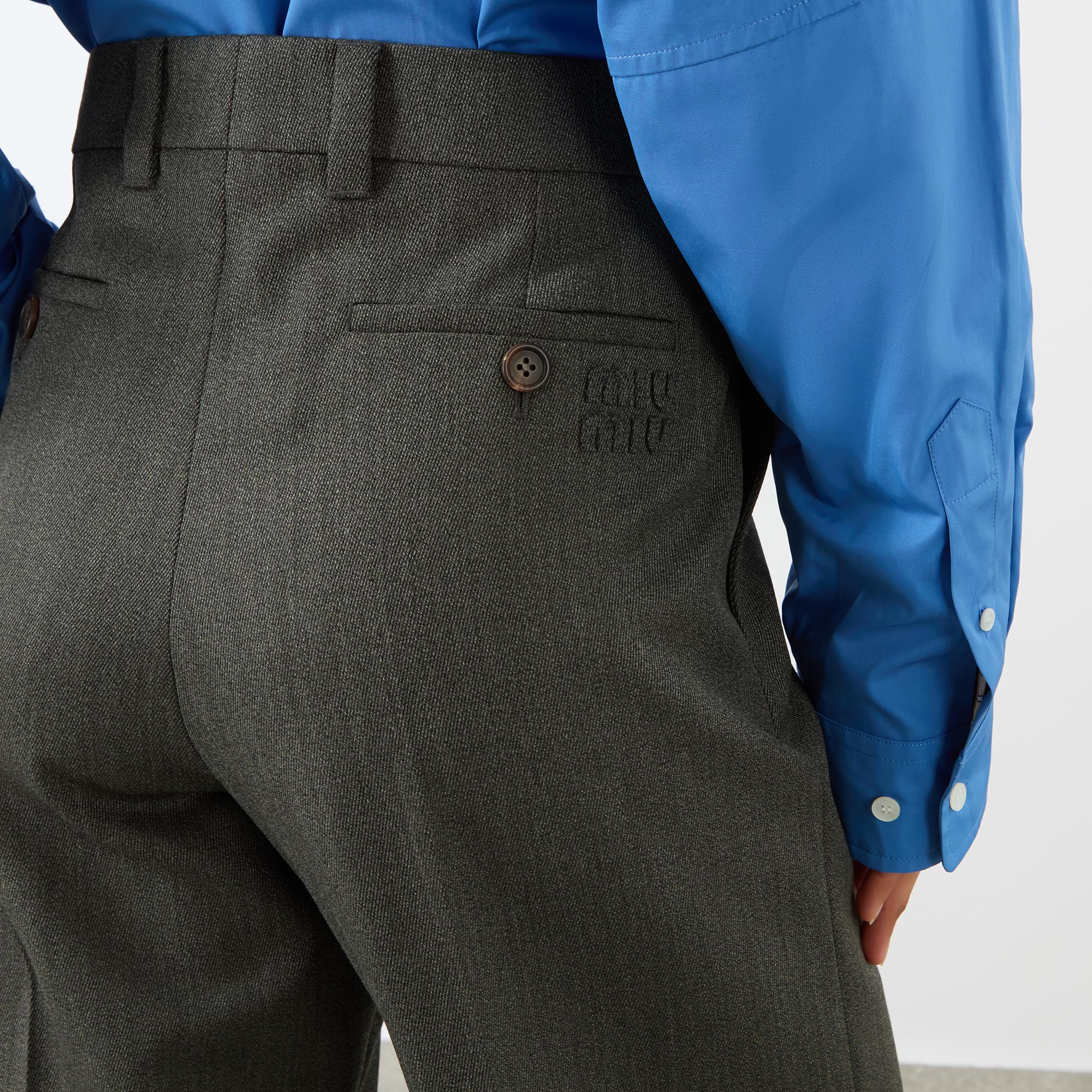 Miu Miu pays tribute to working women with workwear pieces designed for the office. These trousers, from the new SS26 line, sit high on the waist and feature a concealed zip fly with a hook-and-bar fastening for a polished finish. Complete with classic four-pocket styling, they fall to a straight-cut leg accented by sharp pressed creases.