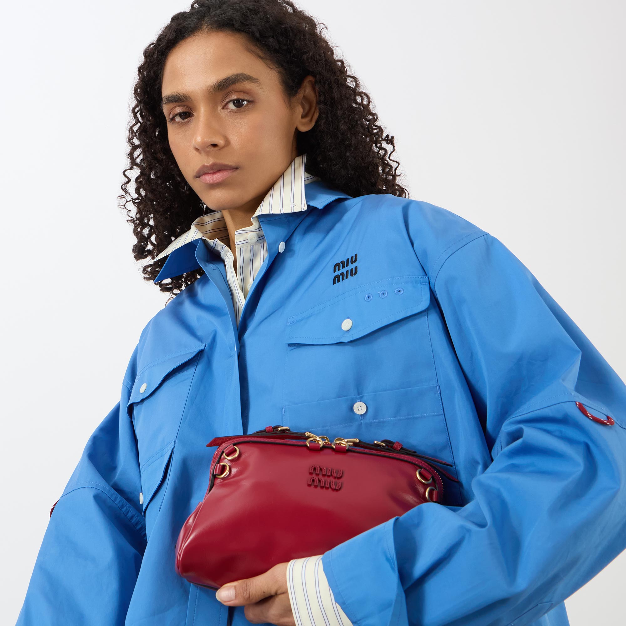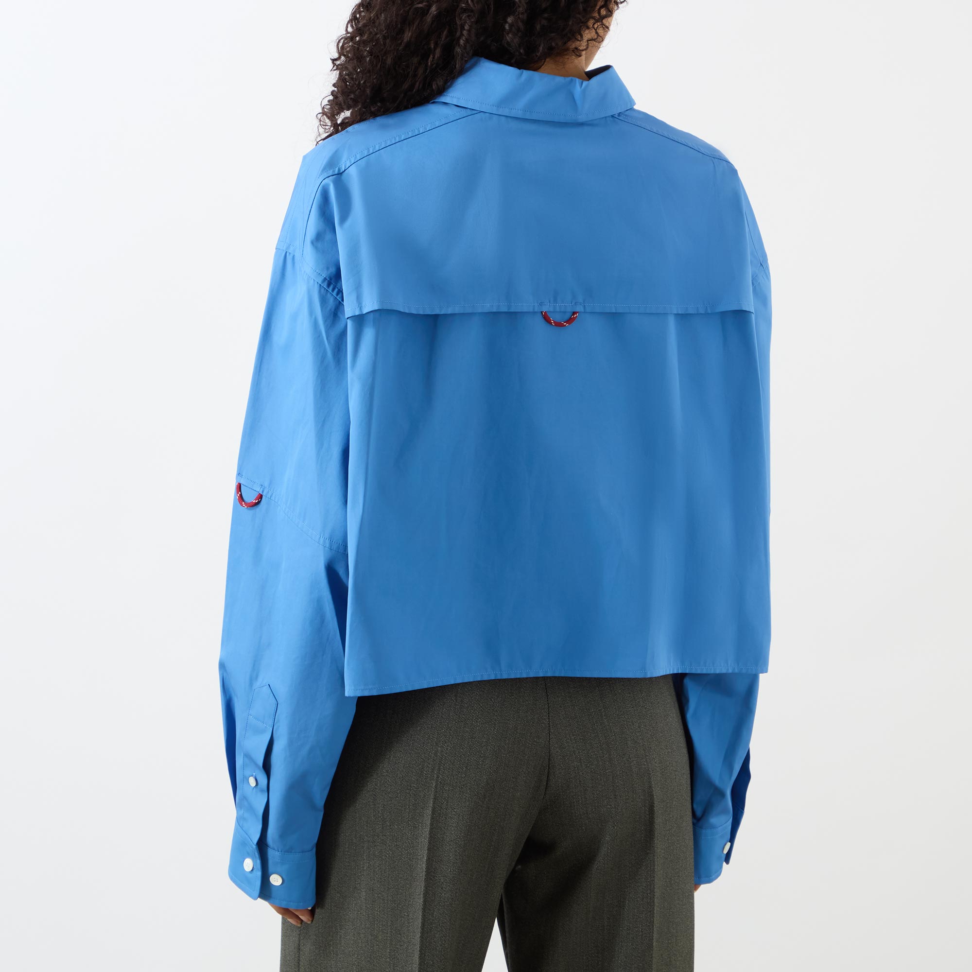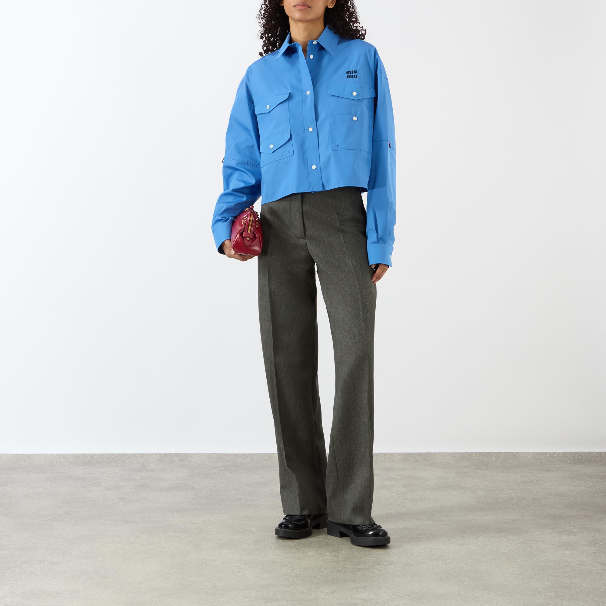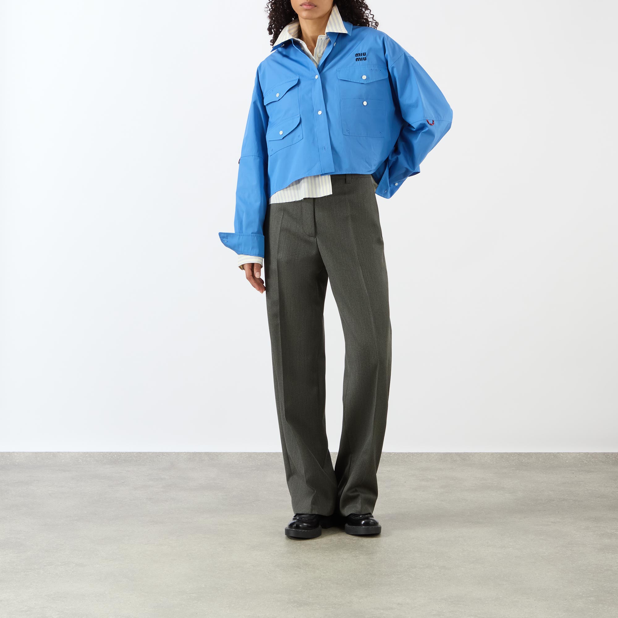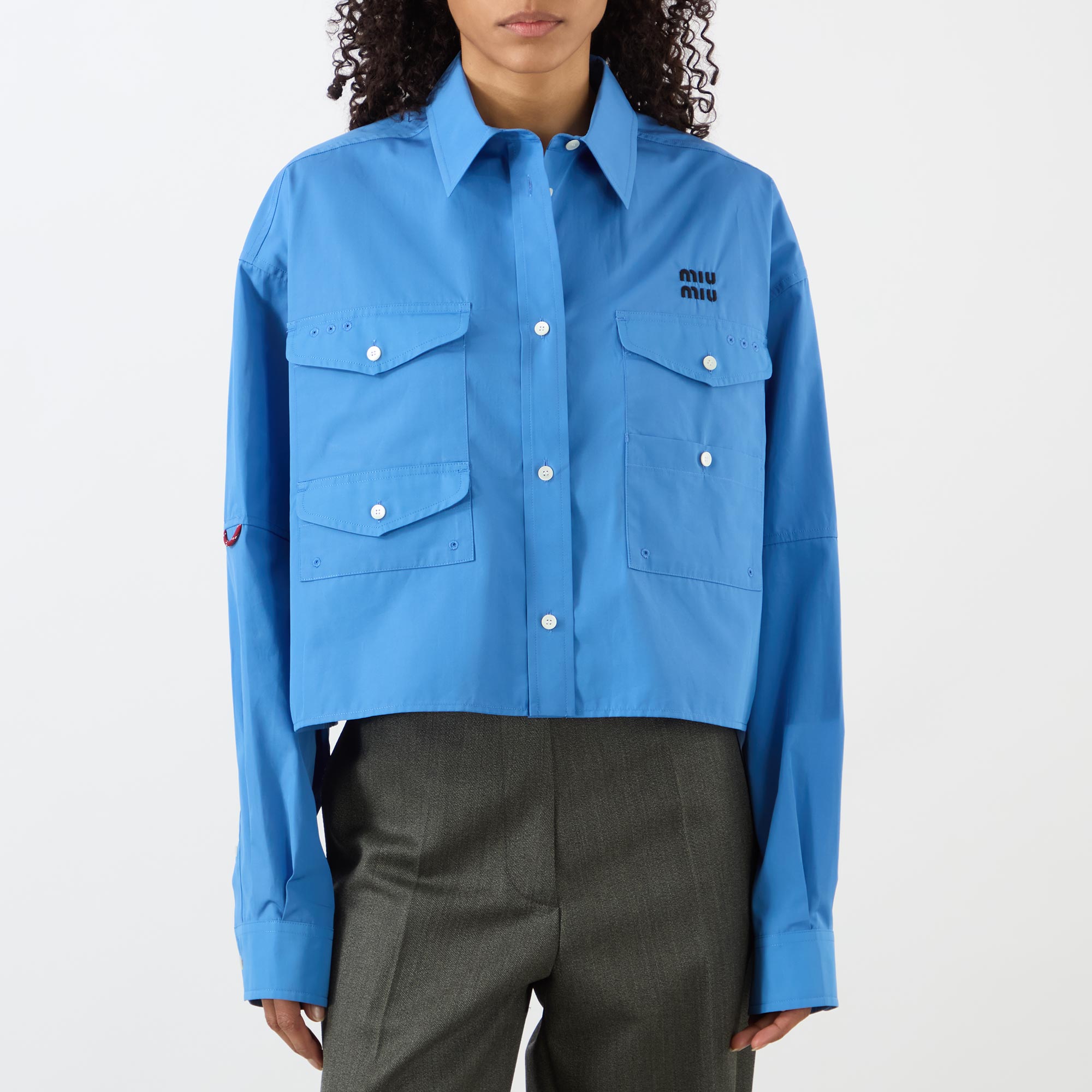 Miu Miu continues its affinity for workwear-inspired staples with this overshirt, defined by a polished preppy aesthetic. Crafted from soft, breathable cotton, it’s designed with a sharp point collar, long sleeves, and relaxed dropped shoulders for an effortless feel. Contrasting logo embroidery features on the chest, while neat single-button cuffs and a back storm flap complete the look with a sleek finish.