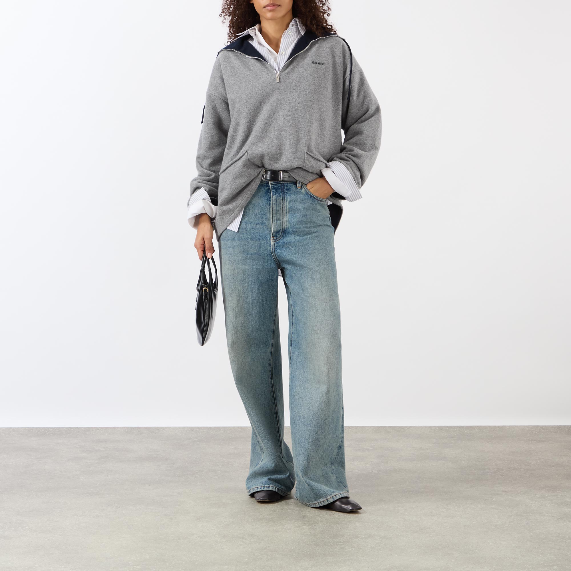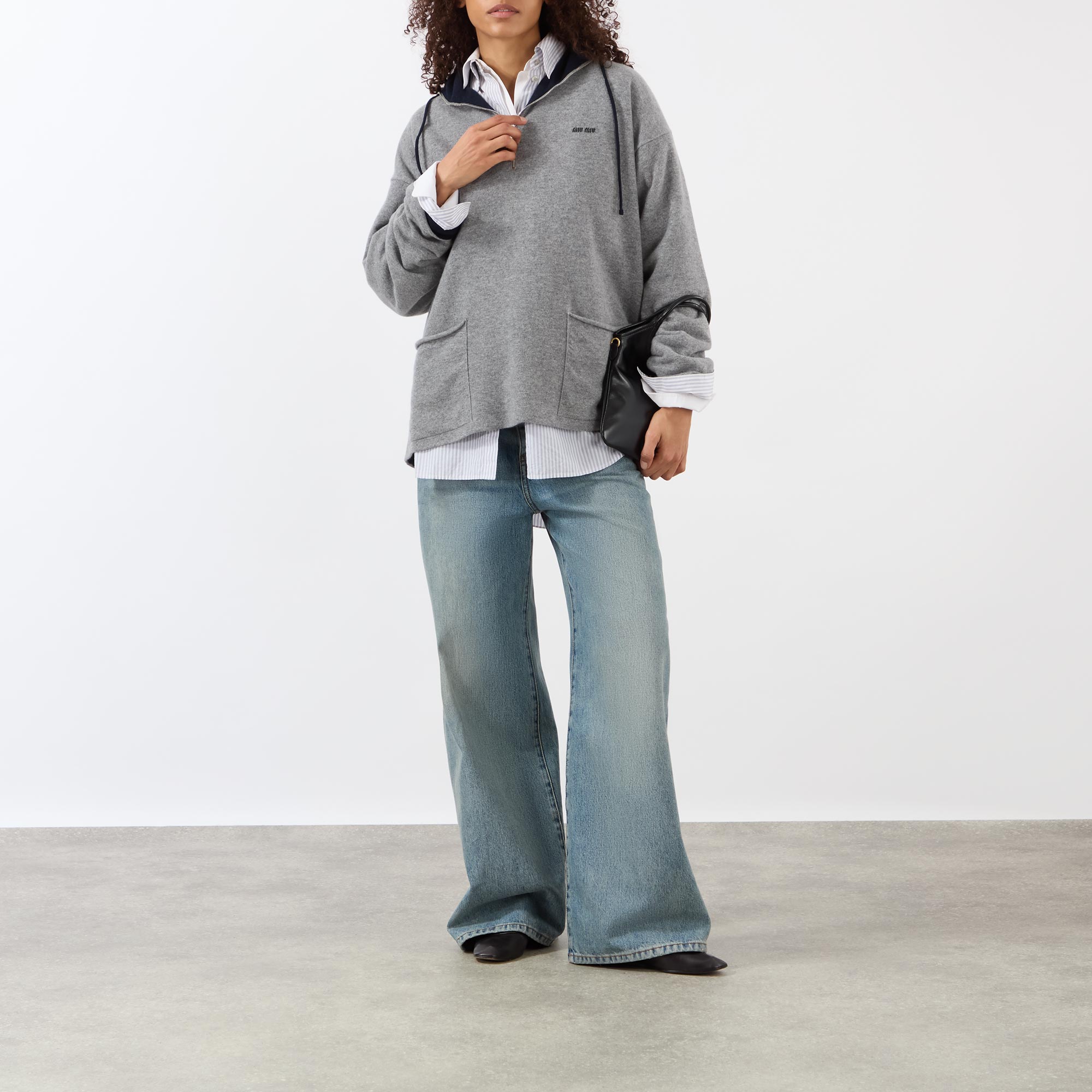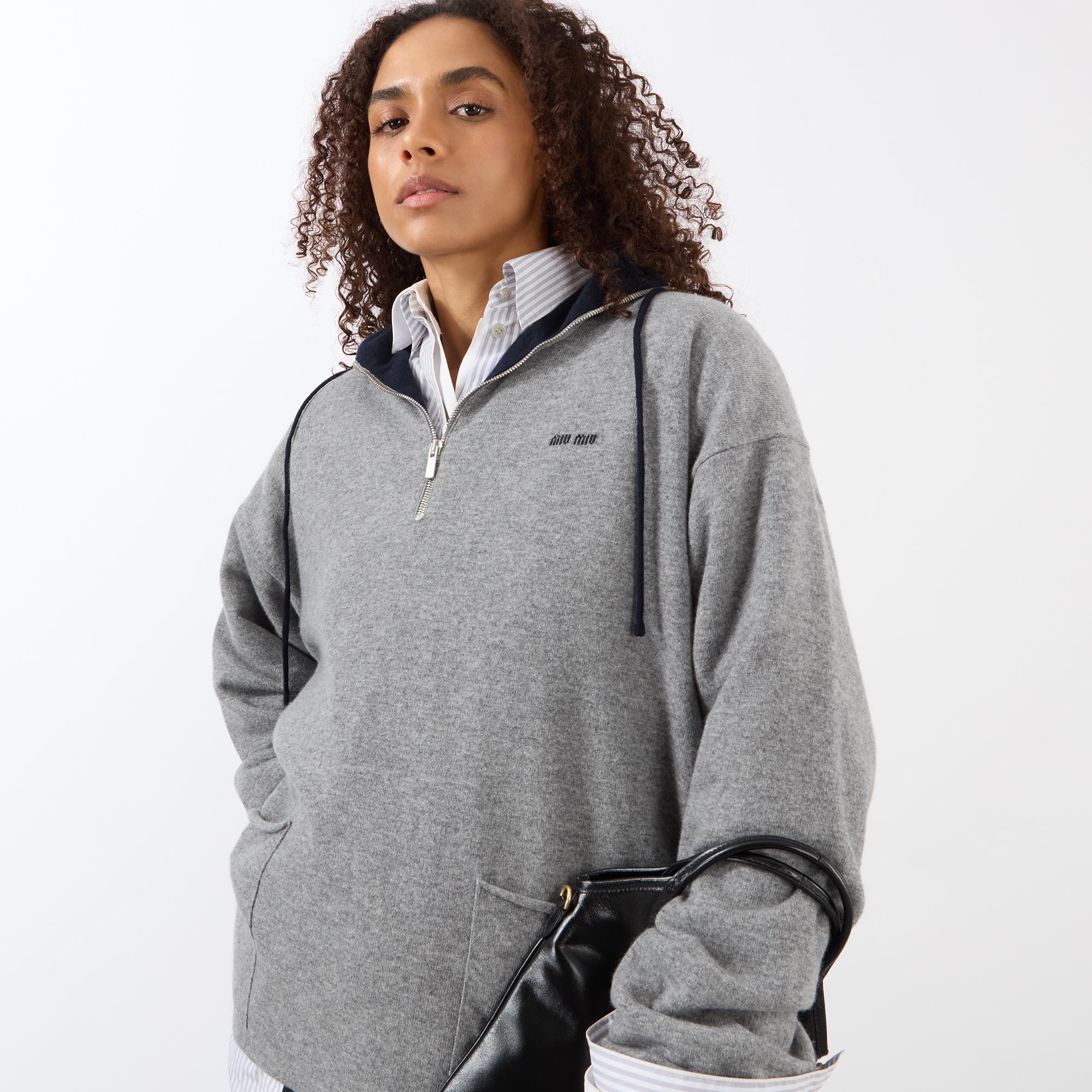 Miu Miu's SS26 collection shifts away from corporate aesthetics to embrace more relaxed, casual pieces, like this sweater. Crafted from luxurious cashmere, its half-zip design features a funnel neckline, long sleeves, and slouchy dropped shoulders for a laid-back feel. The sweater is finished with two side patch pockets with rolled edges, creating an intentionally unfinished effect, and is adorned with the label's logo across the chest for a signature touch.