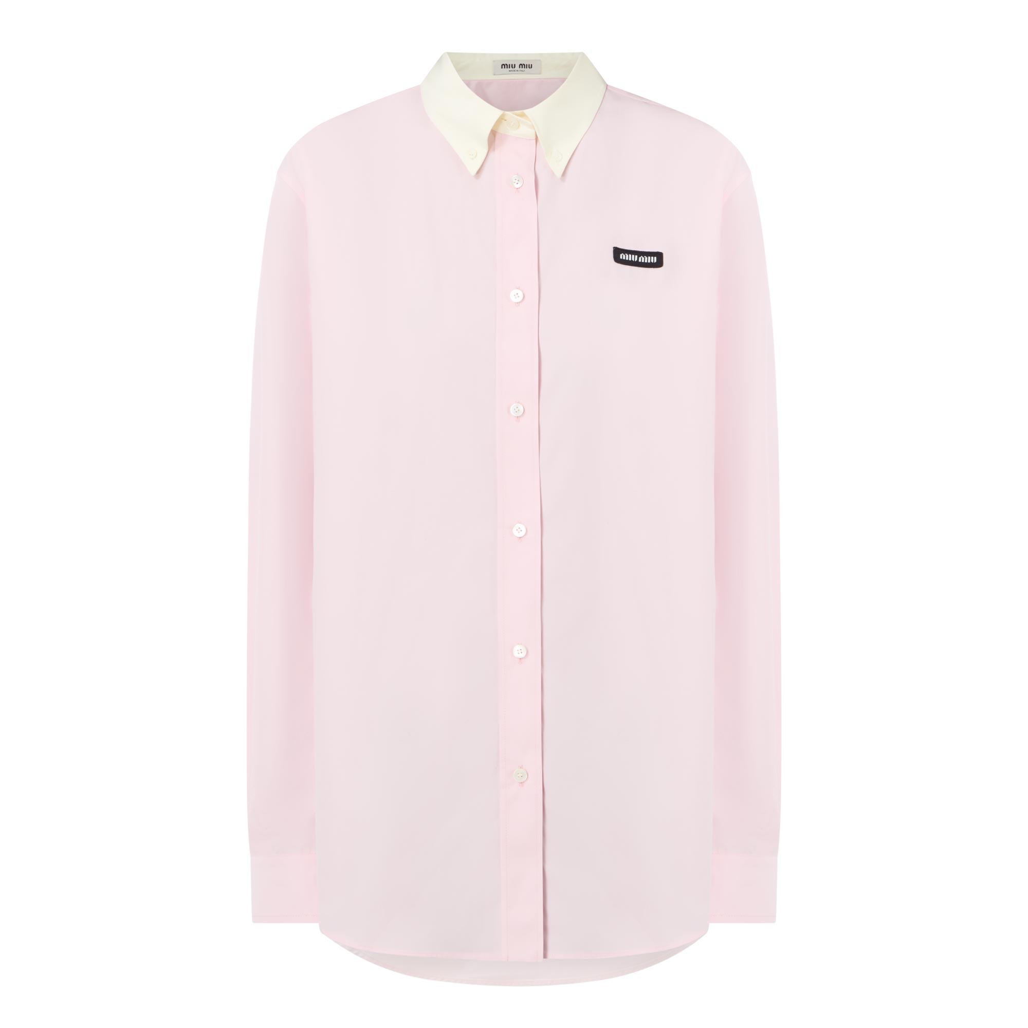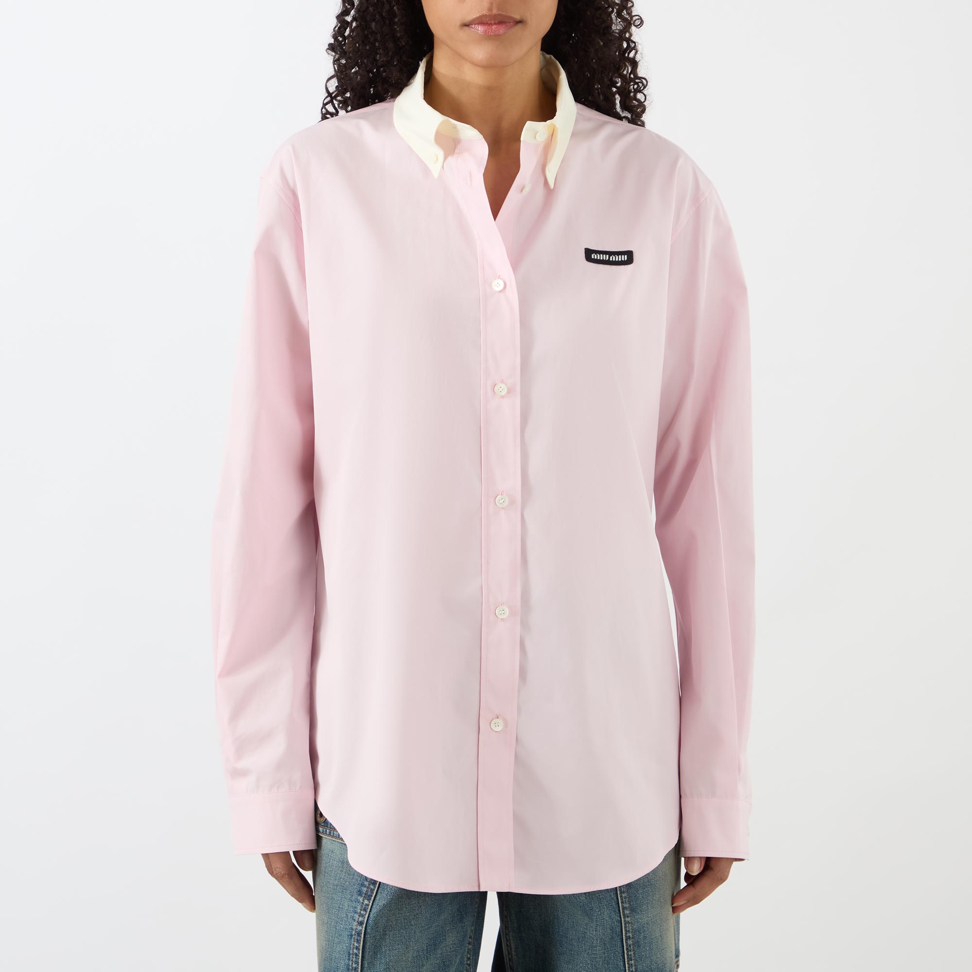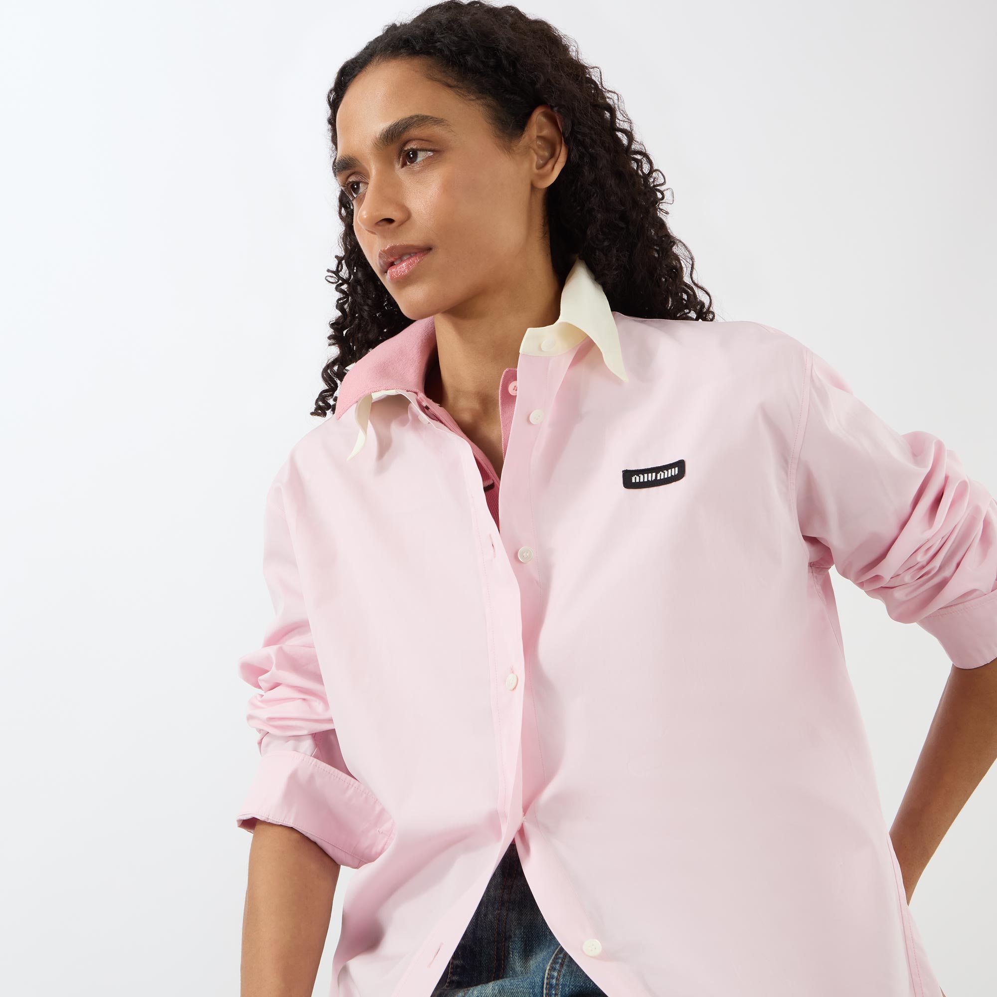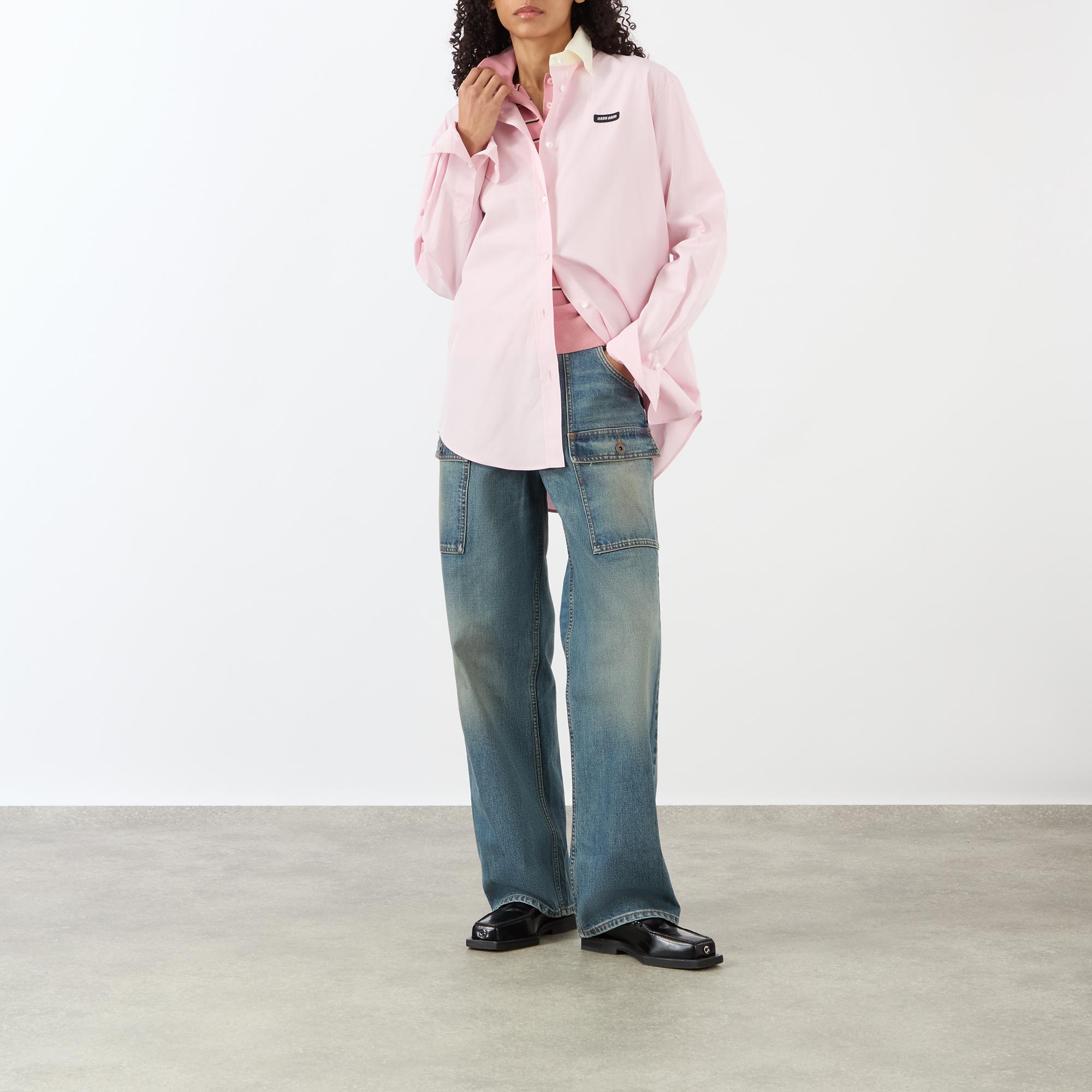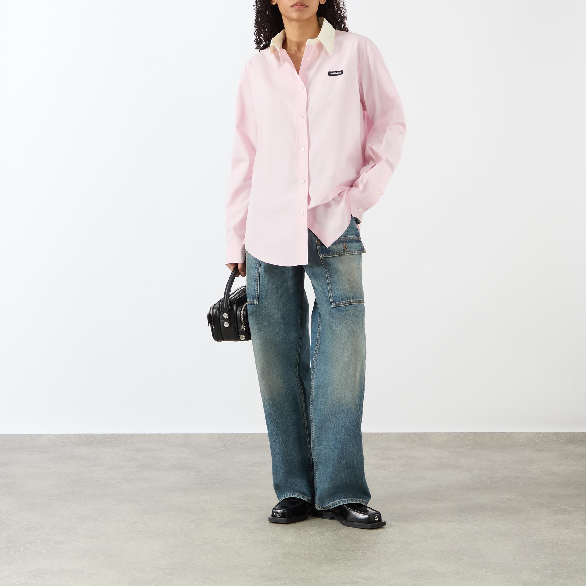 Miu Miu’s SS26 collection reflects on women’s work, spotlighting refined takes on classic workwear staples, like this shirt. Crafted from soft, breathable cotton, it’s designed with a contrasting point collar, long sleeves, and relaxed dropped shoulders for an easy, casual feel. A contrasting logo patch decorates the chest, while single-button cuffs and a curved hem provide a polished finishing touch.