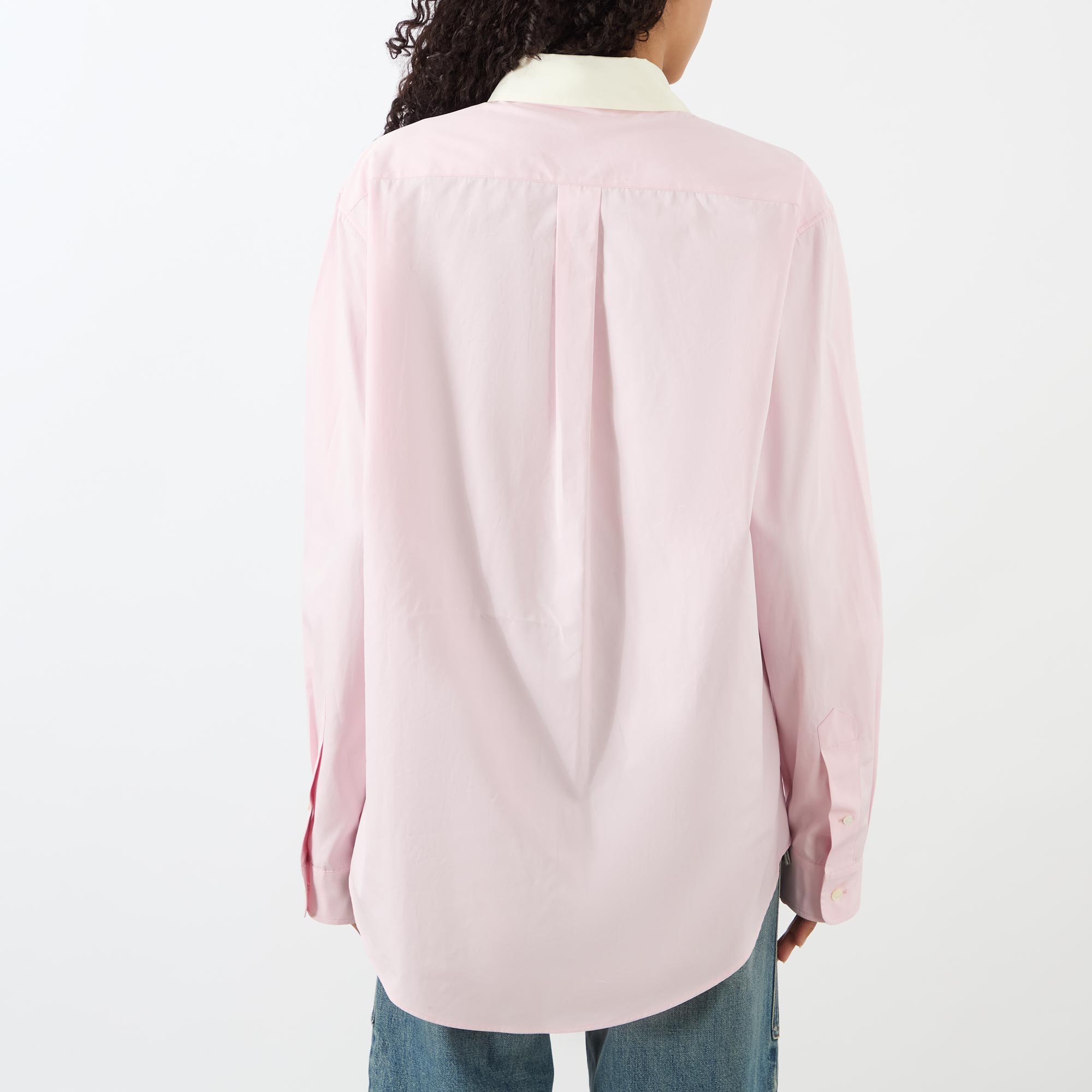- Contrasting point collar, long sleeves, dropped shoulders, front button placket, contrasting logo patch, tonal stitching, single-button cuffs, back box pleat, curved hemline, smooth fabric