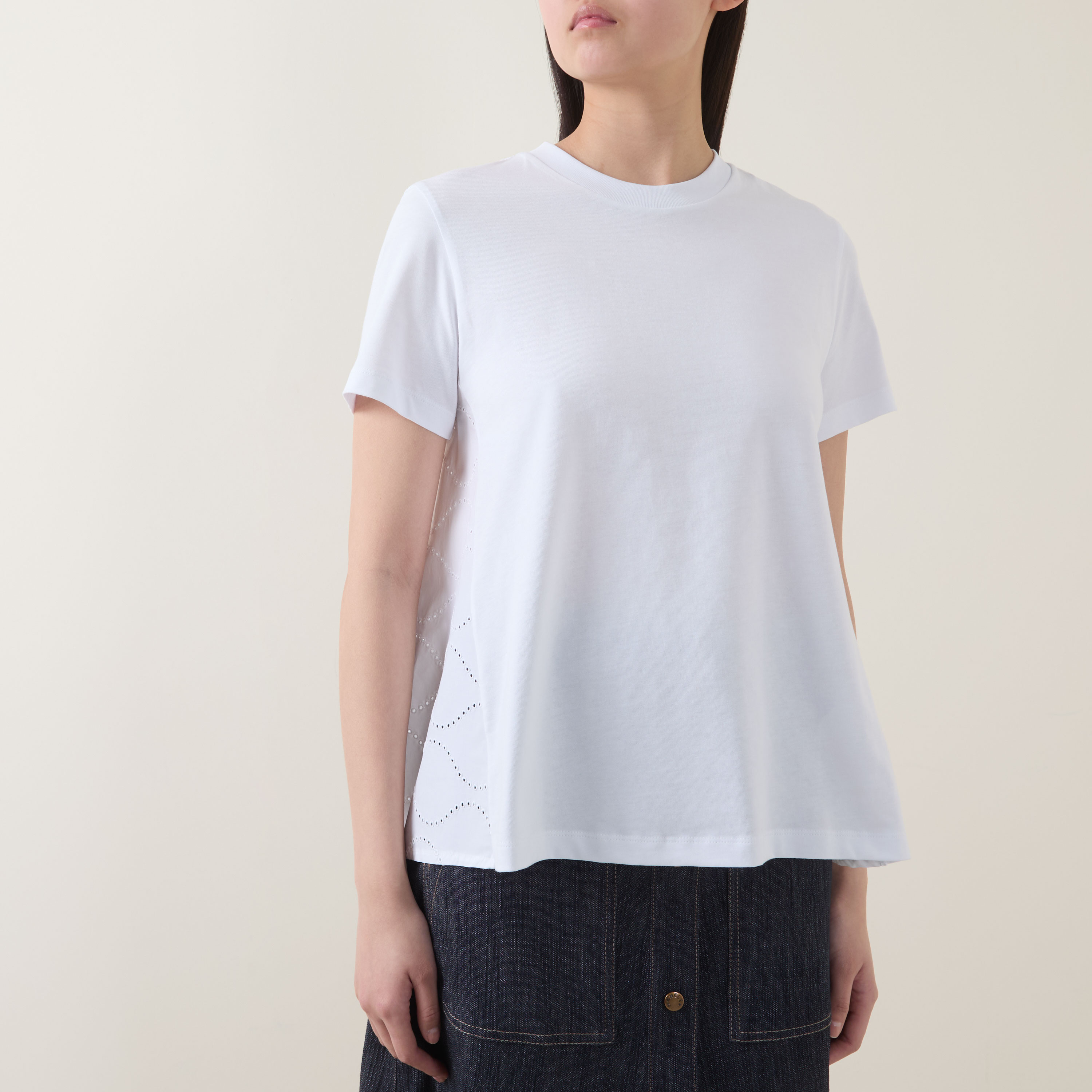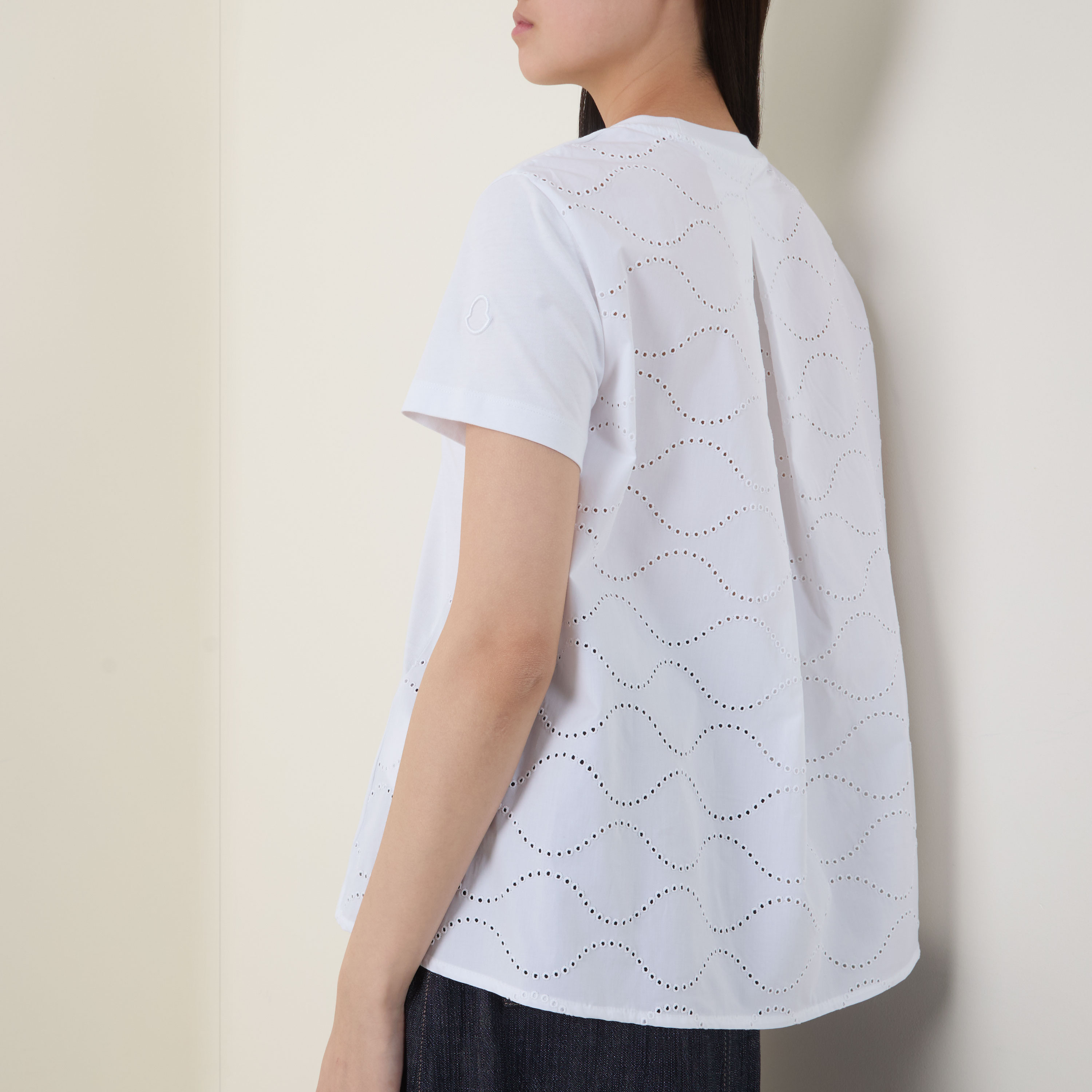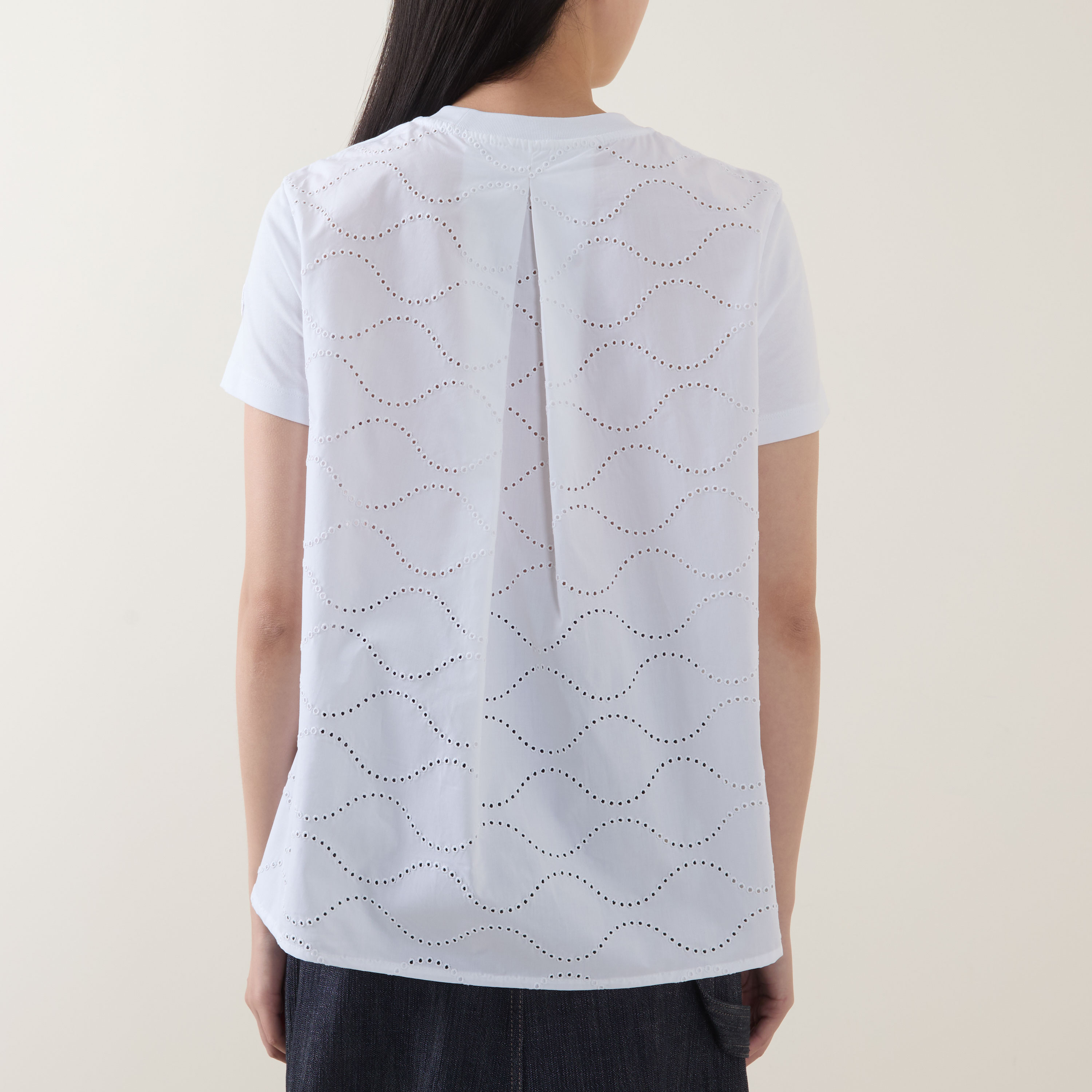 - Round neckline, short sleeves, dipped hemline, embroidered back panel, inverted pleat, tonal logo badge